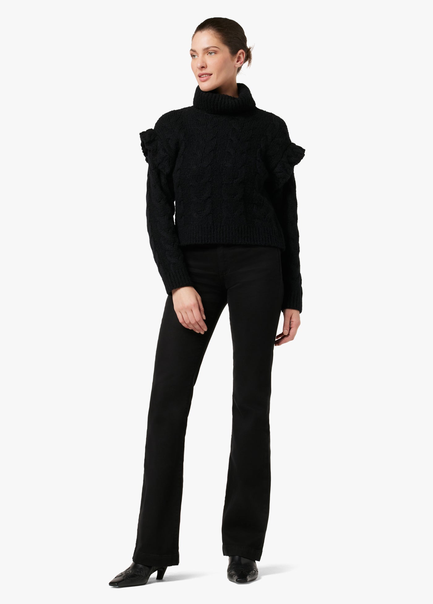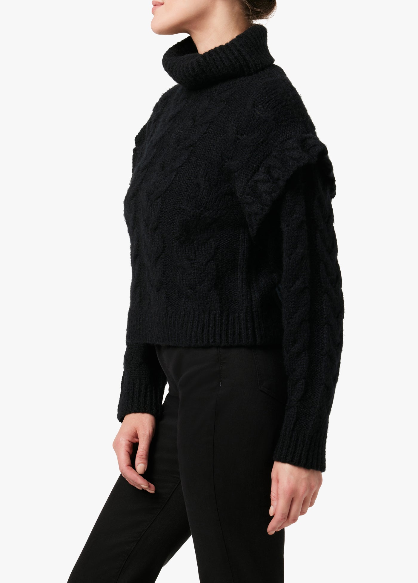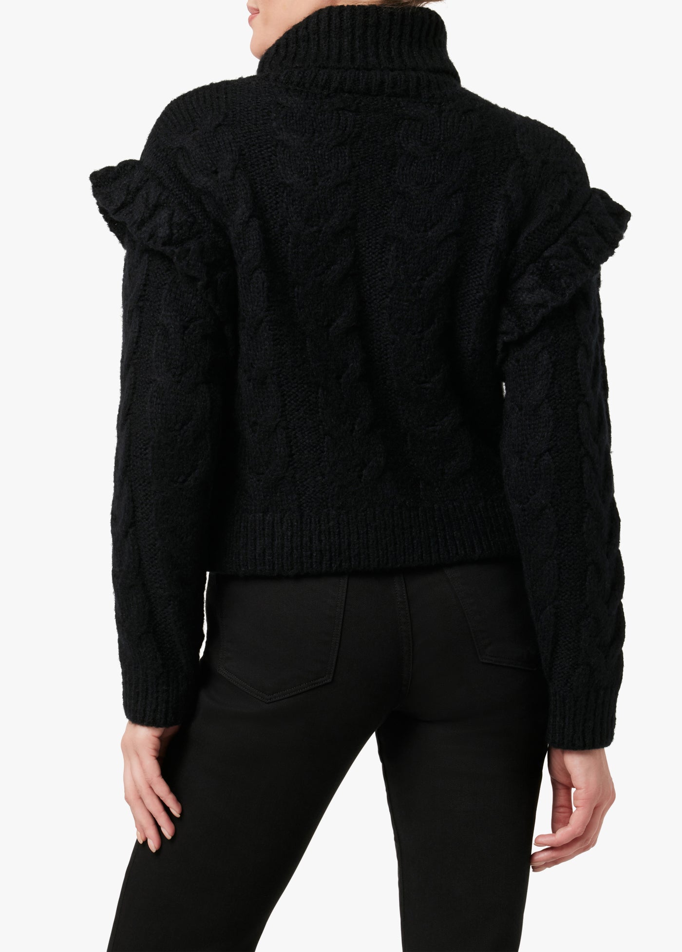 Spun from a soft cable knit, the turtleneck Adeline sweater weaves style and warmth into this cold weather staple. In addition to the classic cables, the sweater is finished with shoulder ruffle detailing.