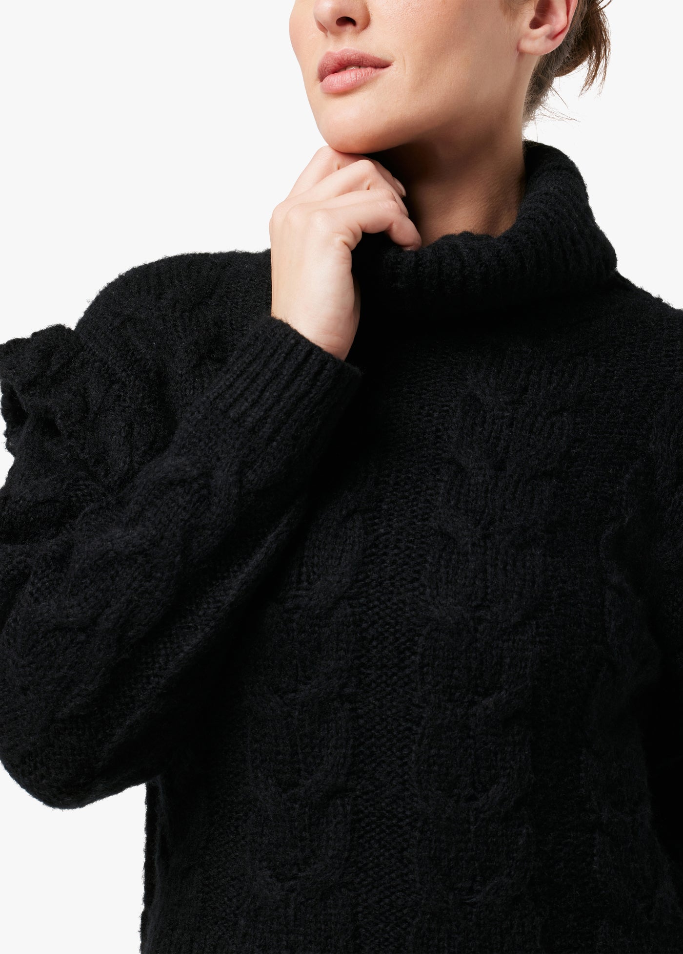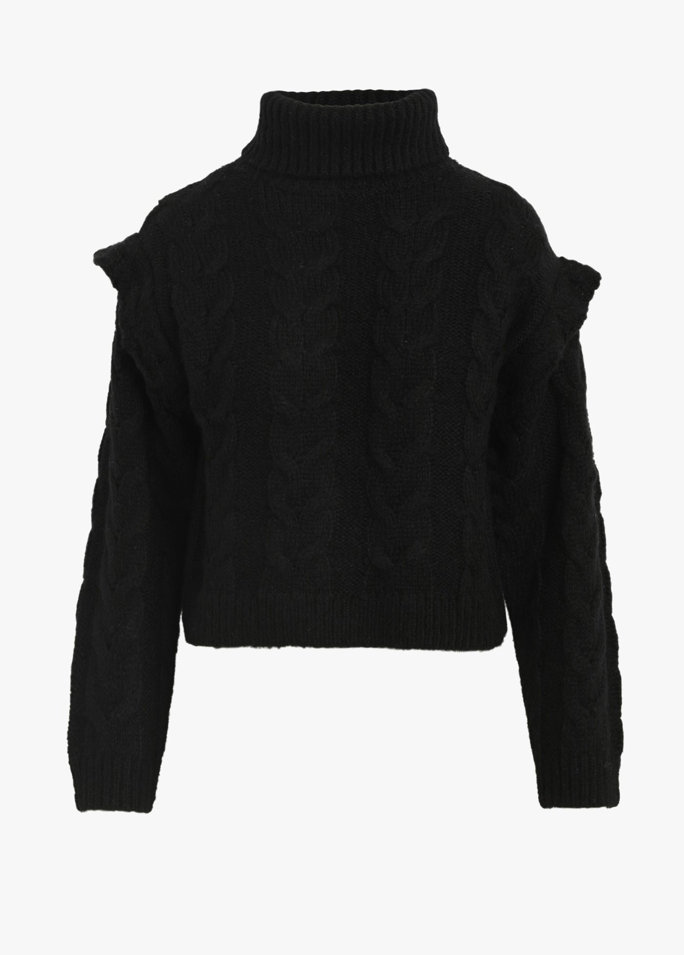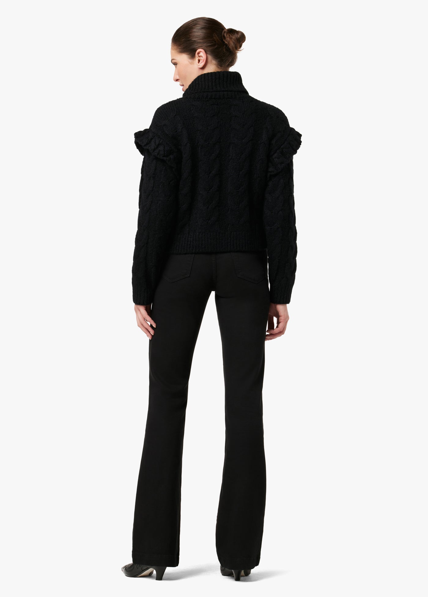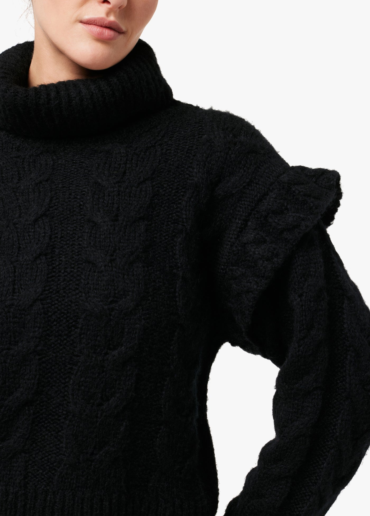 Spun from a soft cable knit, the turtleneck Adeline sweater weaves style and warmth into this cold weather staple. In addition to the classic cables, the sweater is finished with shoulder ruffle detailing.