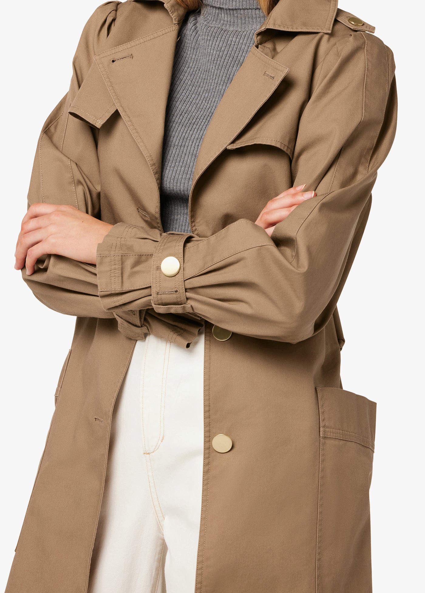 In collaboration with wardrobe stylist and influencer Andrea Lublin, the classic trench coat is reinvented. The relaxed, belted silhouette of the Coco Trench Coat is balanced with voluminous sleeves and polished gold hardware--crafted from a luxe gabardine twill.