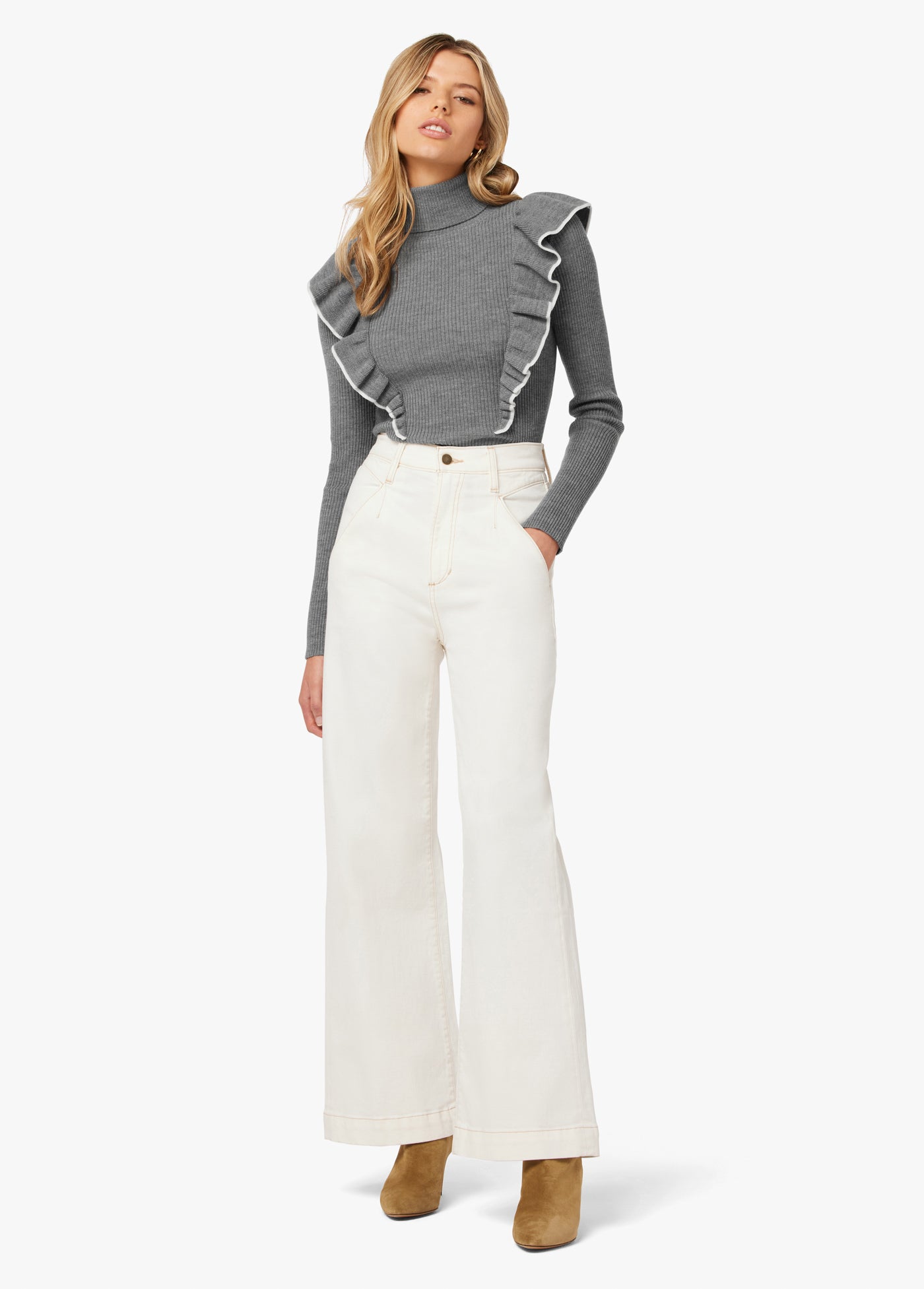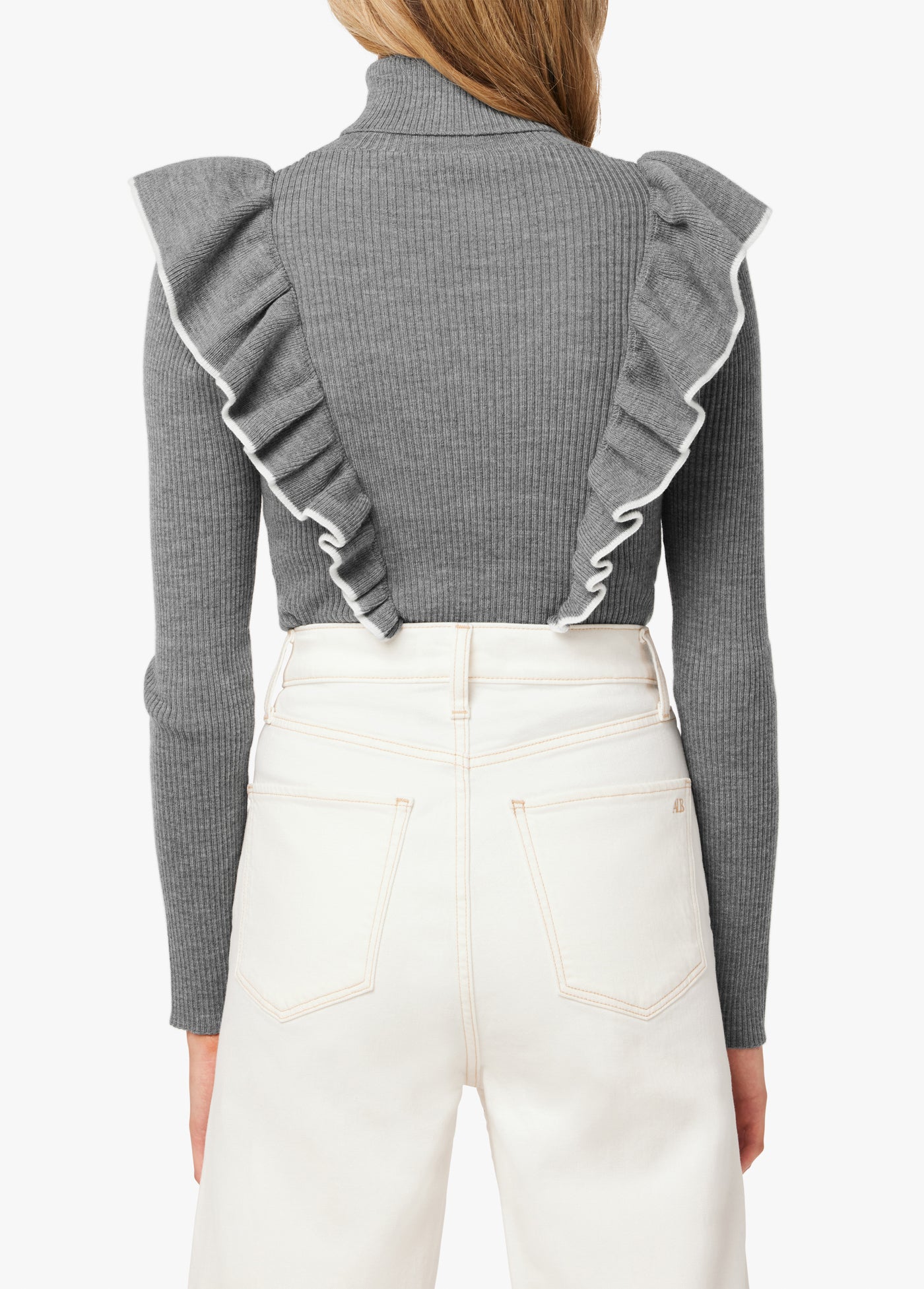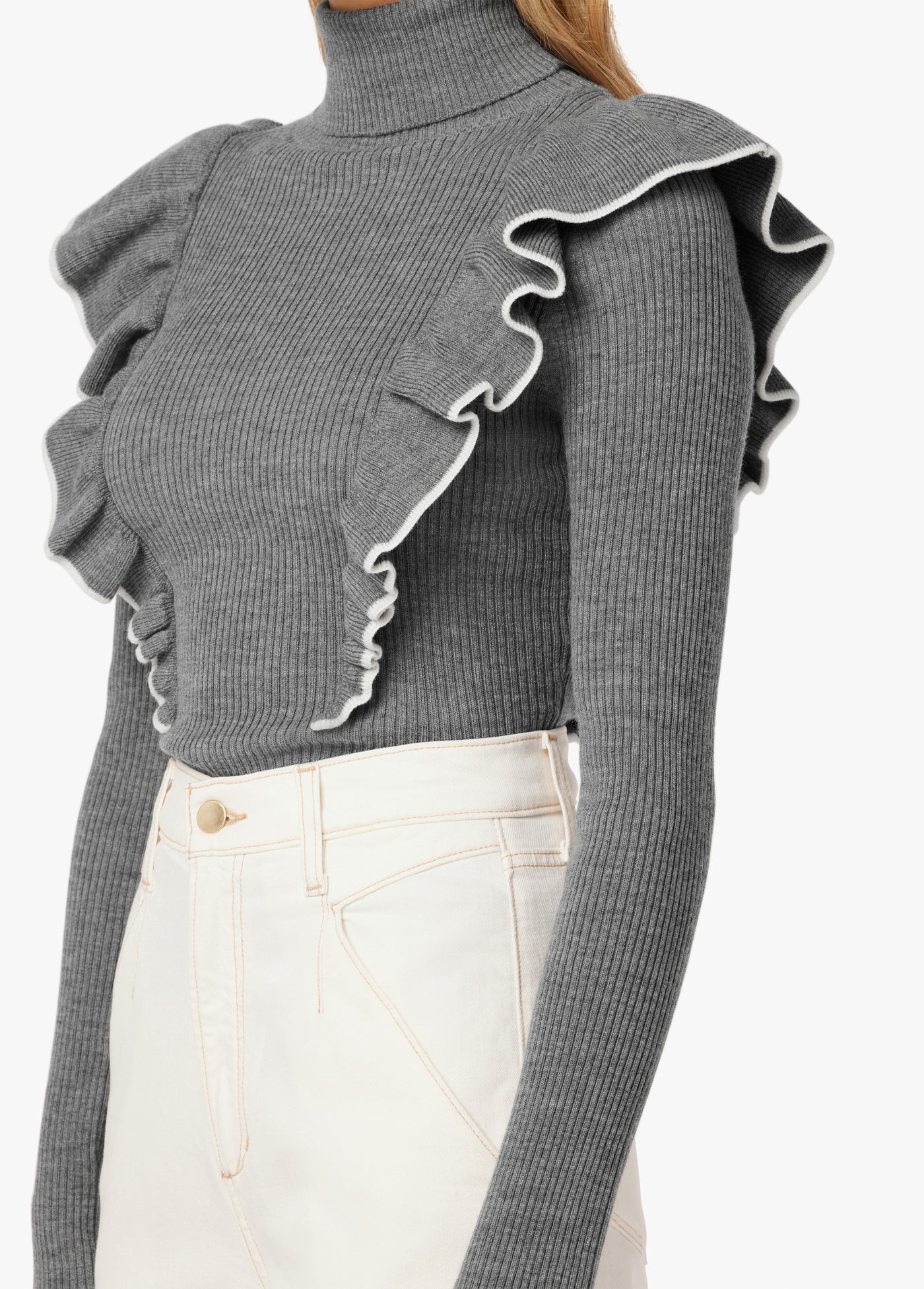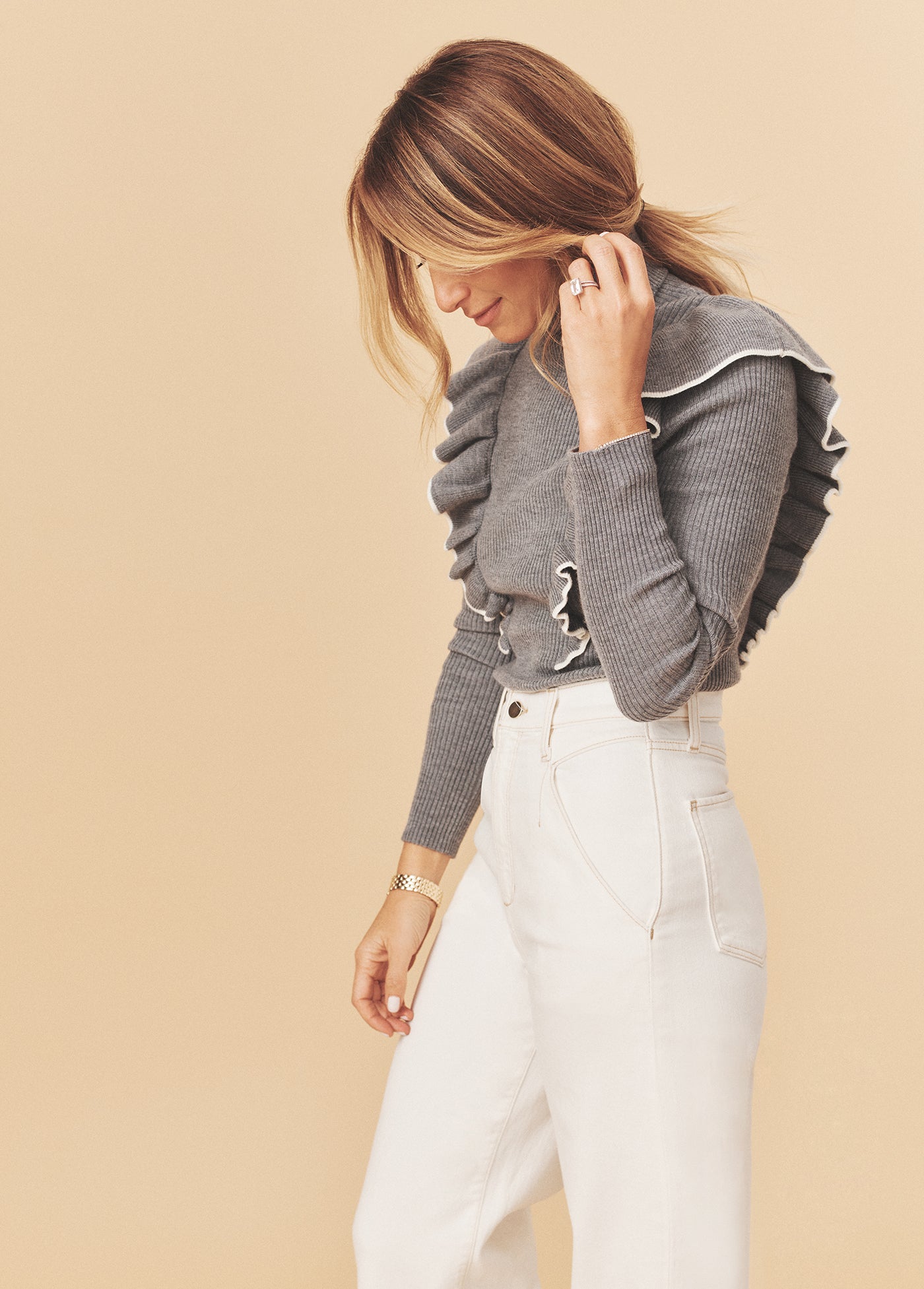 In collaboration with wardrobe stylist and influencer Andrea Lublin, The Heather Sweater is cut from a heather grey, soft rib knit that features ruffle details. The long sleeve, turtleneck style has a fitted silhoutte.