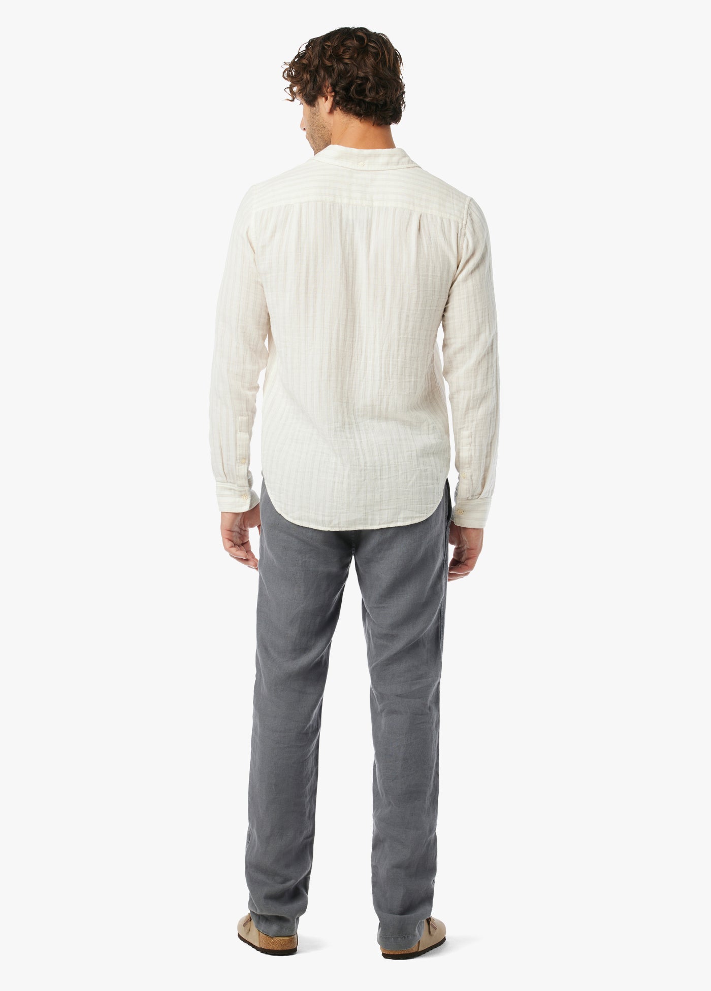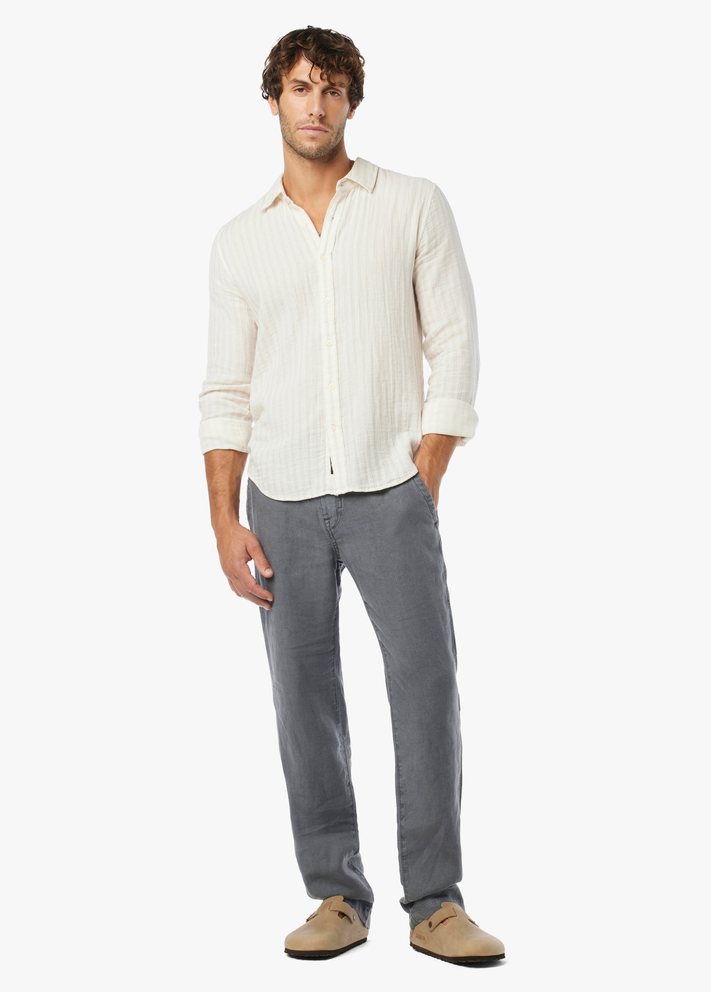 Garment dyed to achieve the perfect faded color, the Emerson Pant is made from naturally lightweight, breathable linen. This pant has elevated details of an elastic waistband on the back, convertible drawcord inside the waistband, coin pocket detail in the front and welt pockets on the back. Whether your're relaxing beachfront or going to work, this pant will give you a polished look for any occasion.