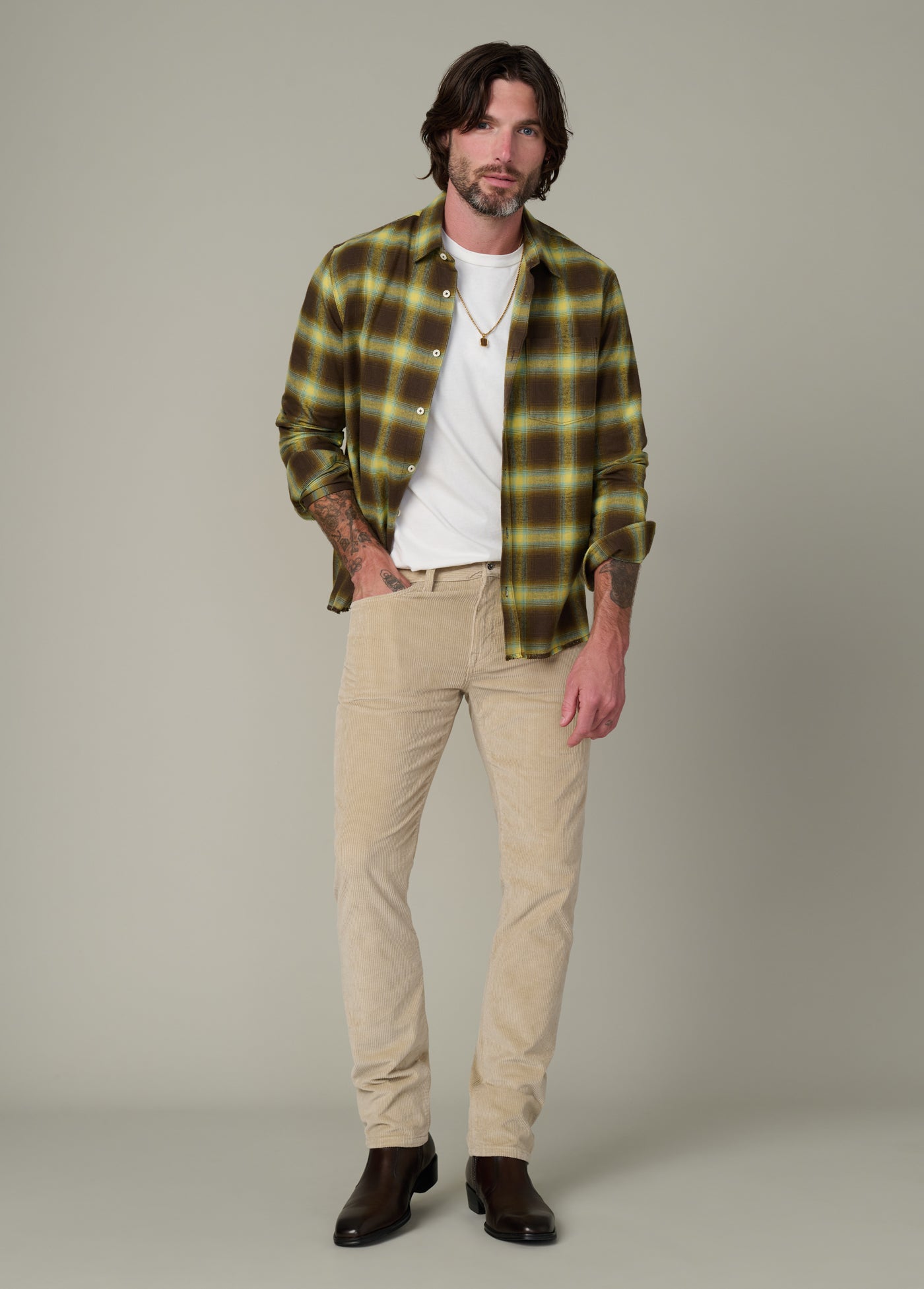 A plaid button-down shirt that brings together classic style and modern edge