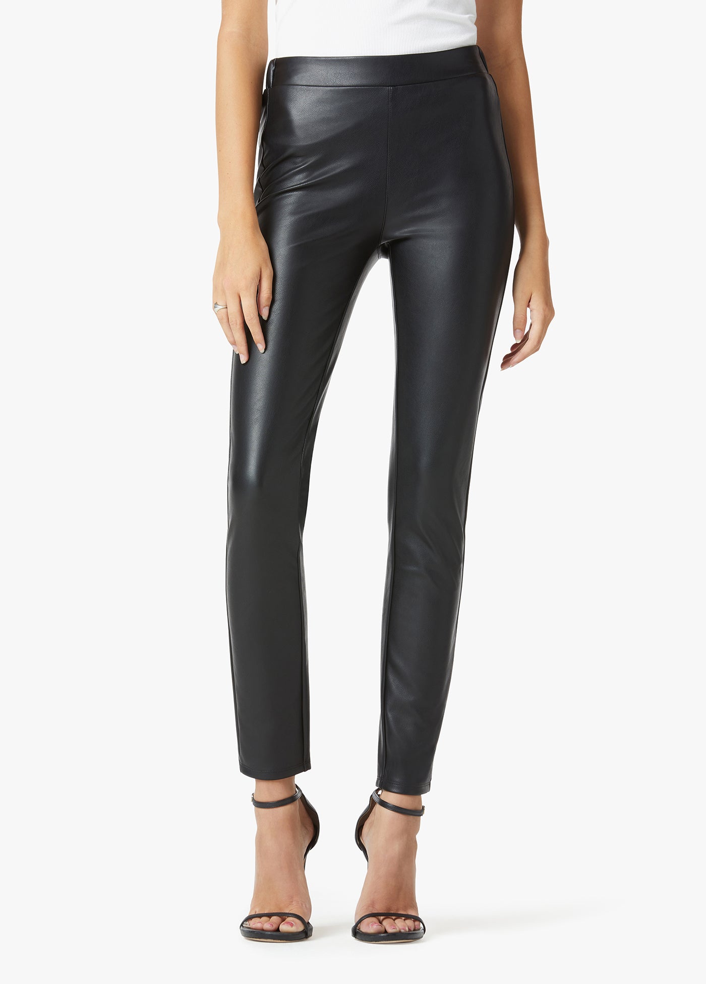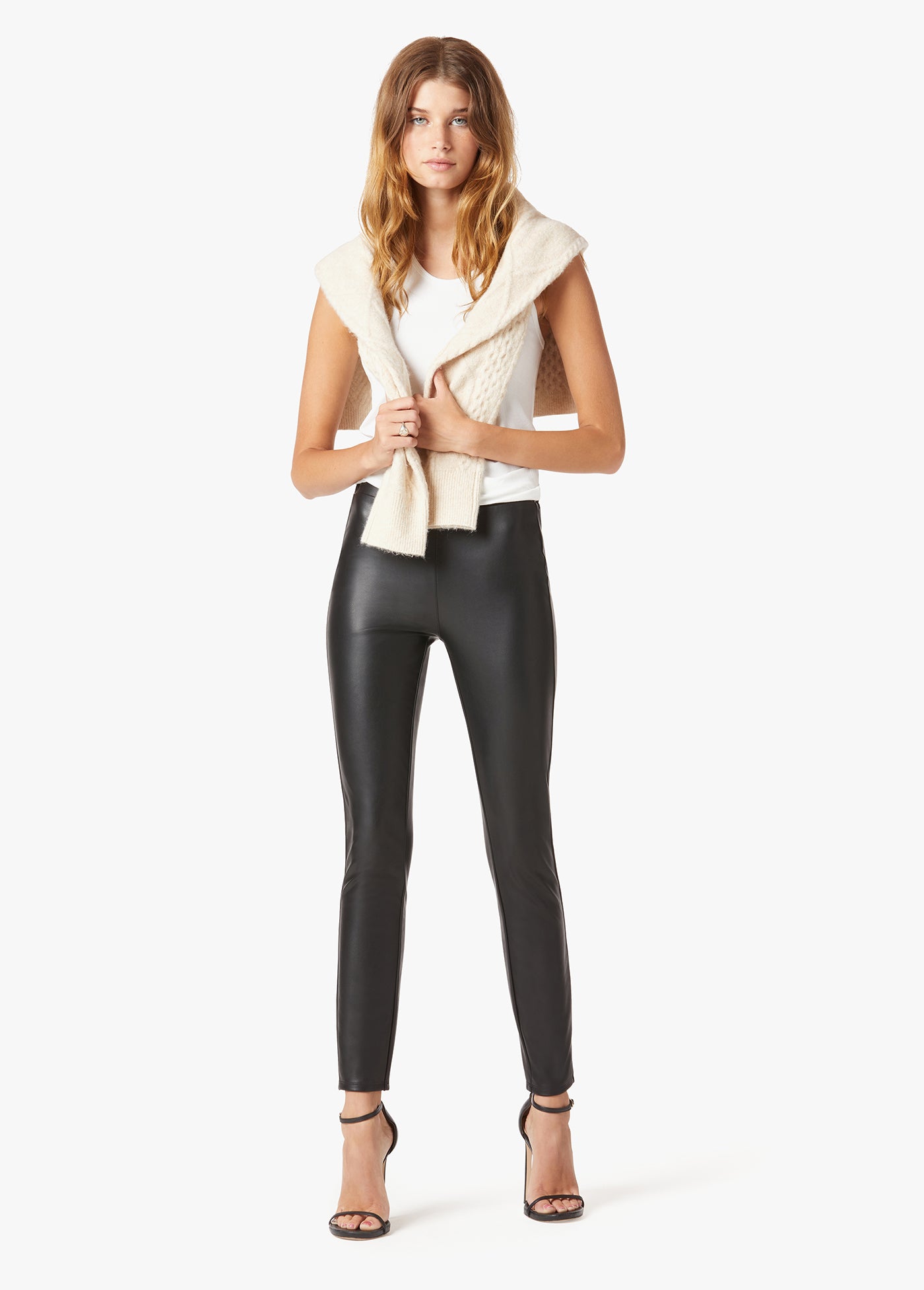High style meets high comfort in the Korey faux leather legging. The sleek, black pull-on leggings have an elastic back waistband for added comfort and slimming, curve-hugging fit with a luxe, looks-like-leather feel.