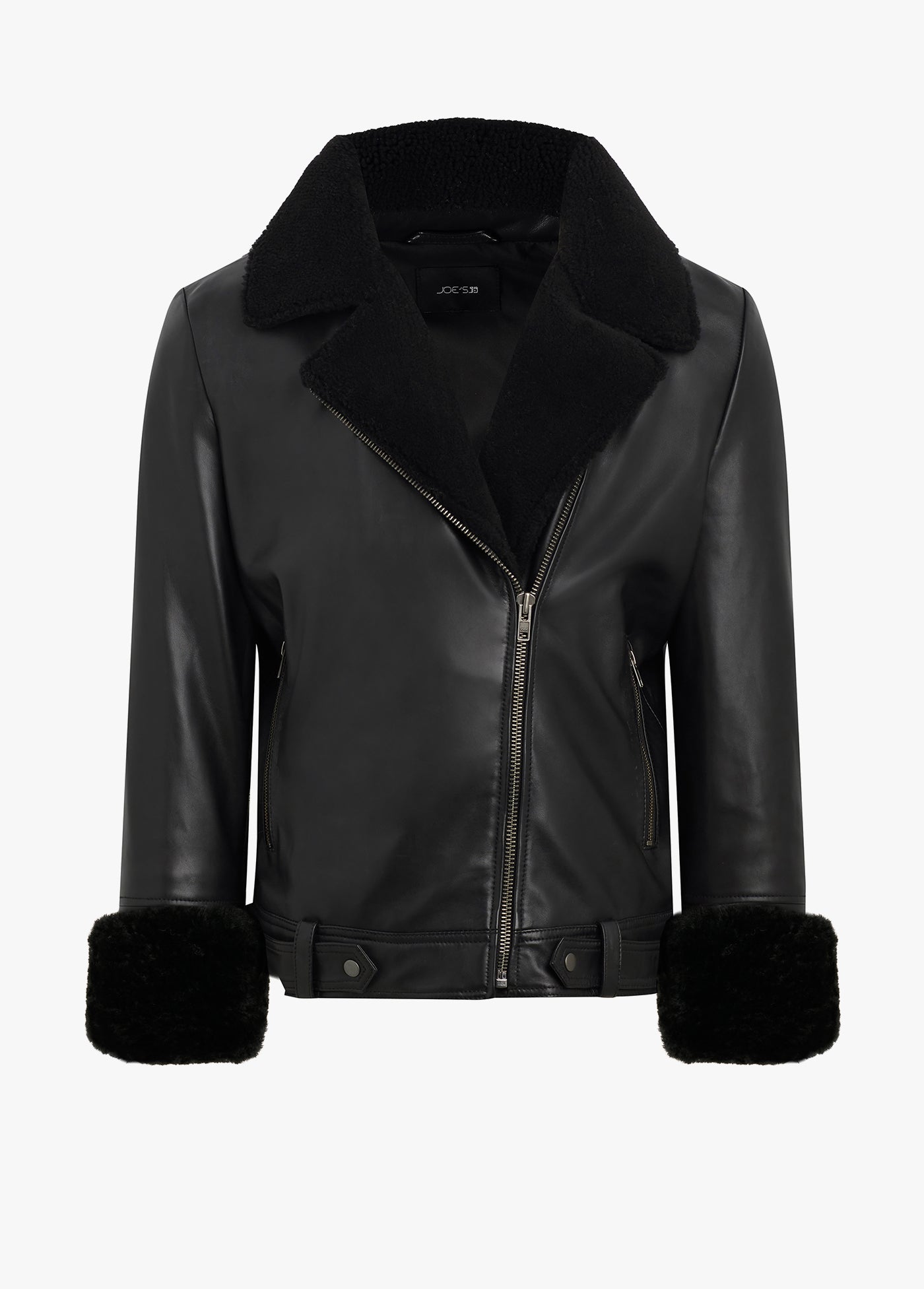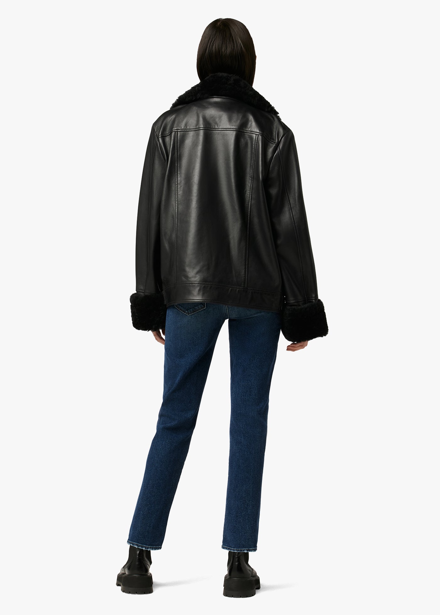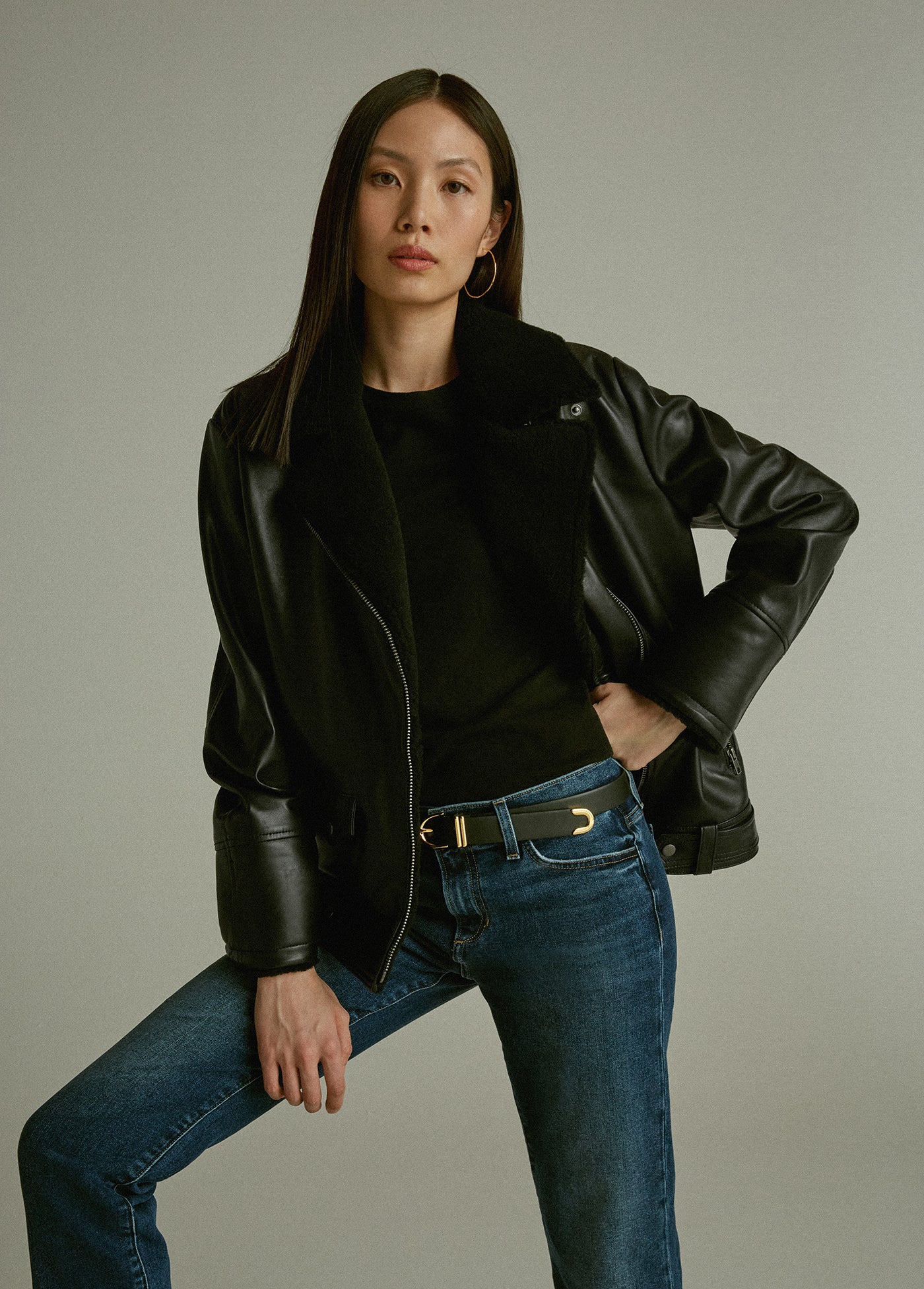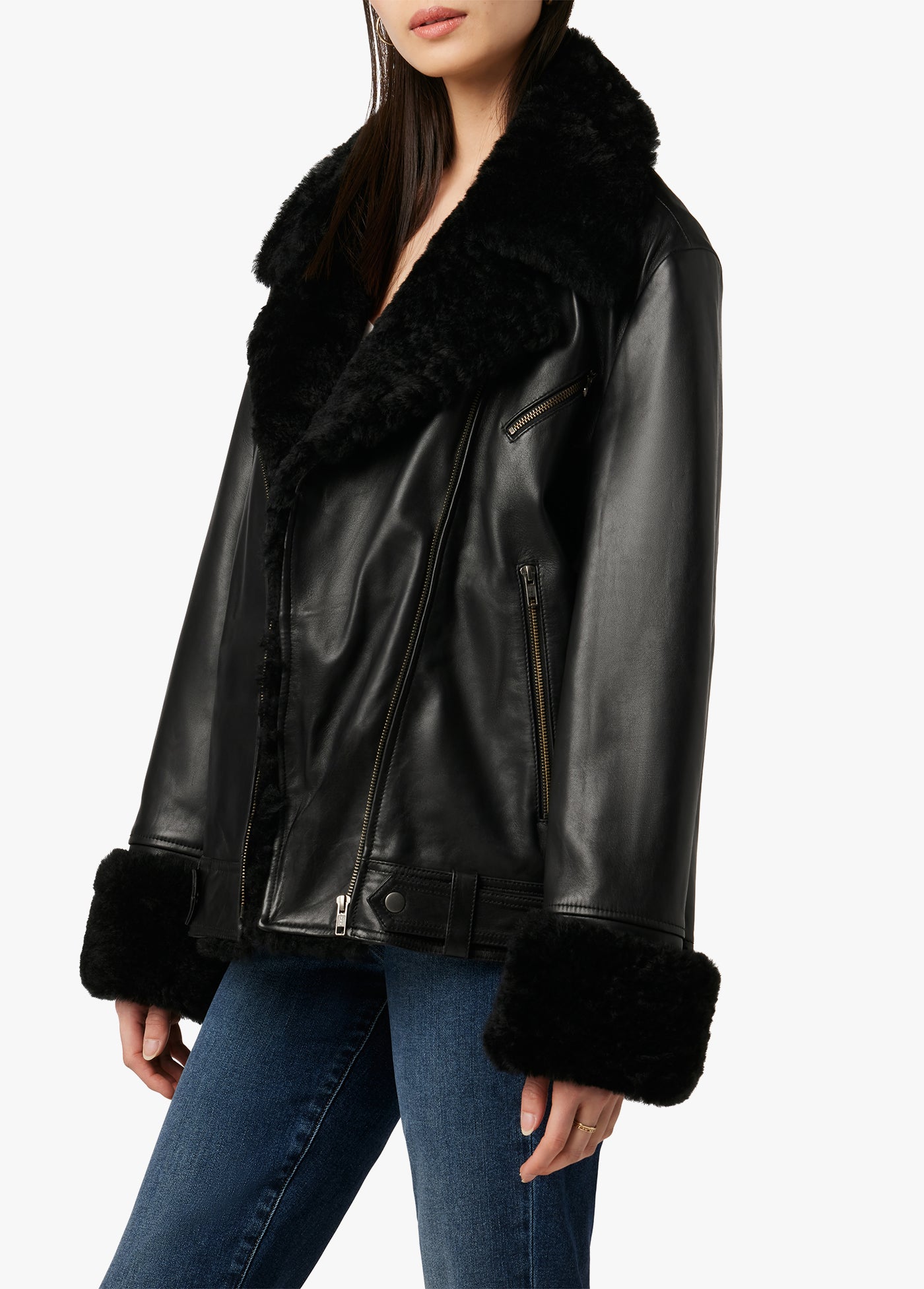 A forever and timeless leather jacket that will become your signature look. The black Lennox Leather Jacket is styled with an assymetrical zipper and black sherling at the cuffs and collar to shield you from chill while maintaining a sleek look.
