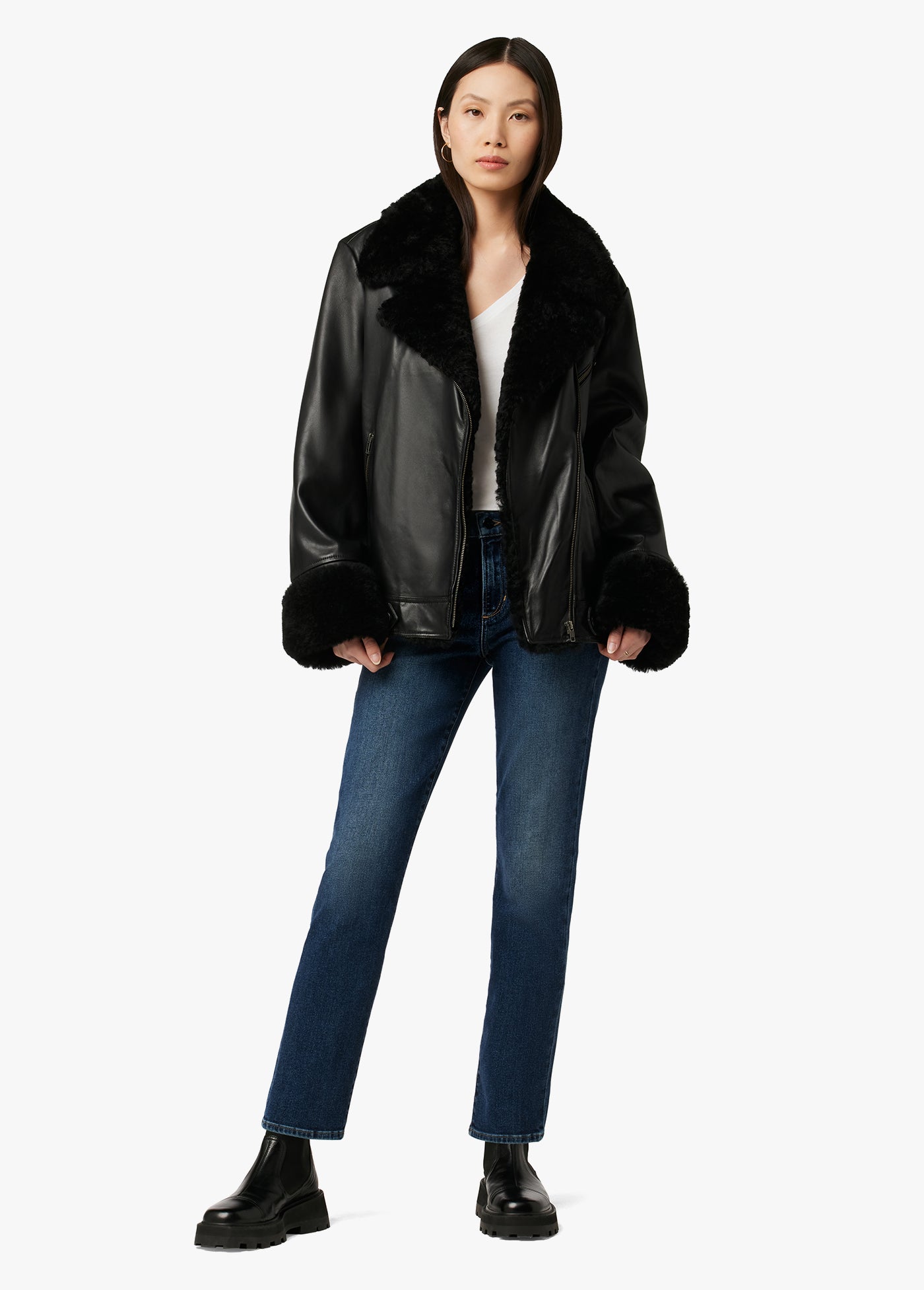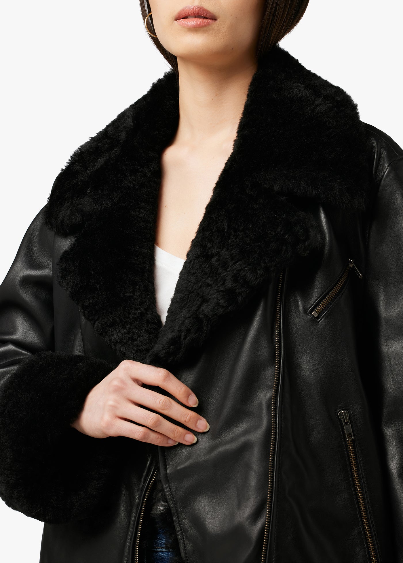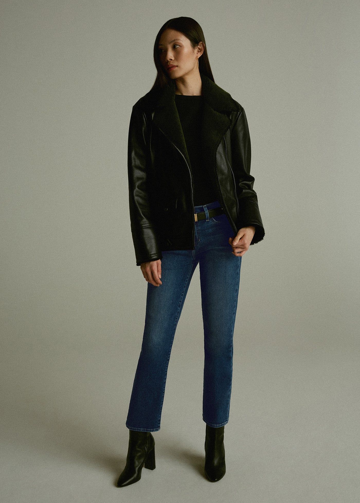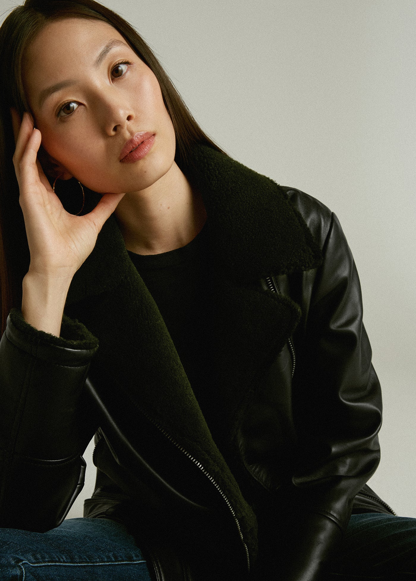 A forever and timeless leather jacket that will become your signature look. The black Lennox Leather Jacket is styled with an assymetrical zipper and black sherling at the cuffs and collar to shield you from chill while maintaining a sleek look.