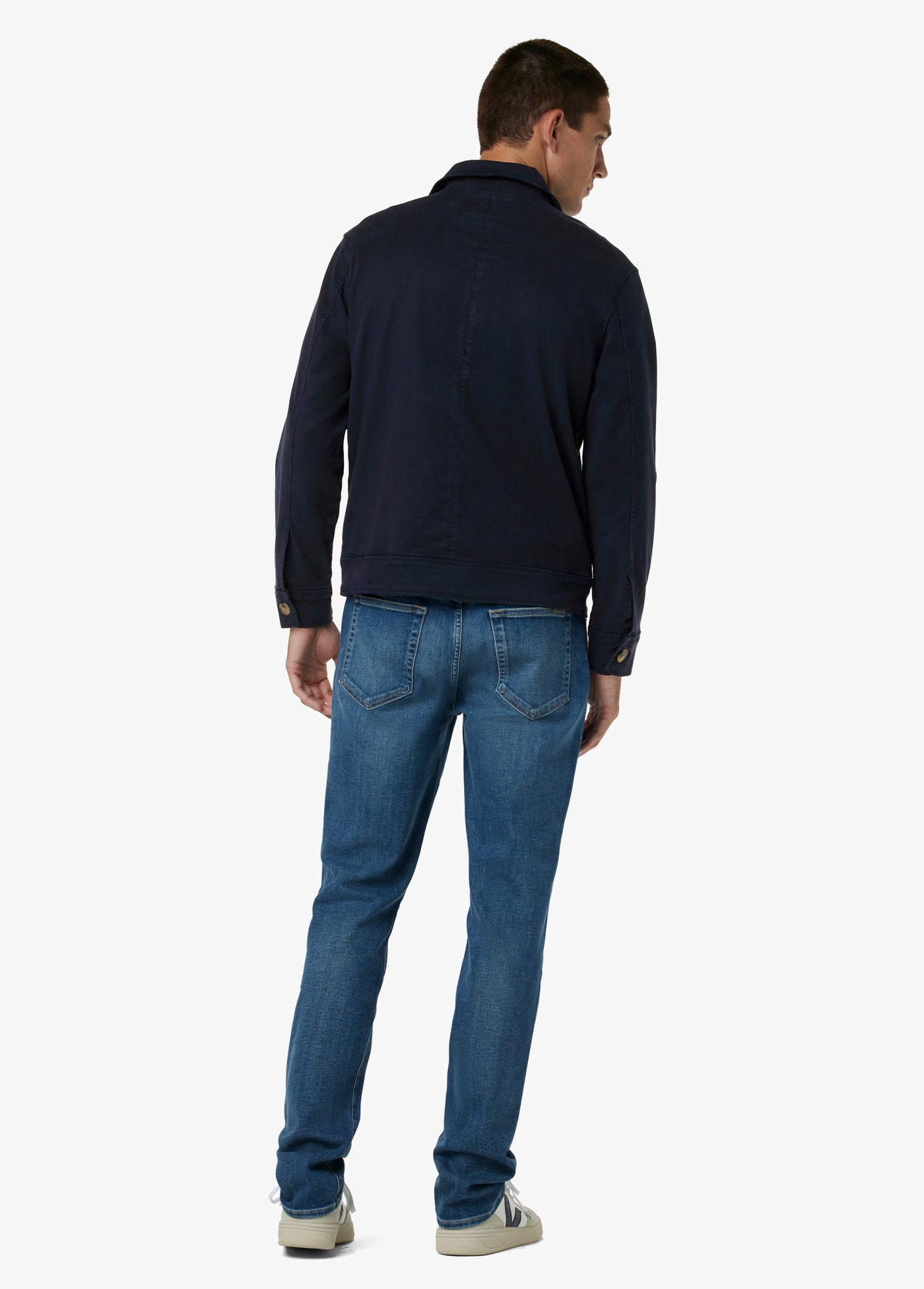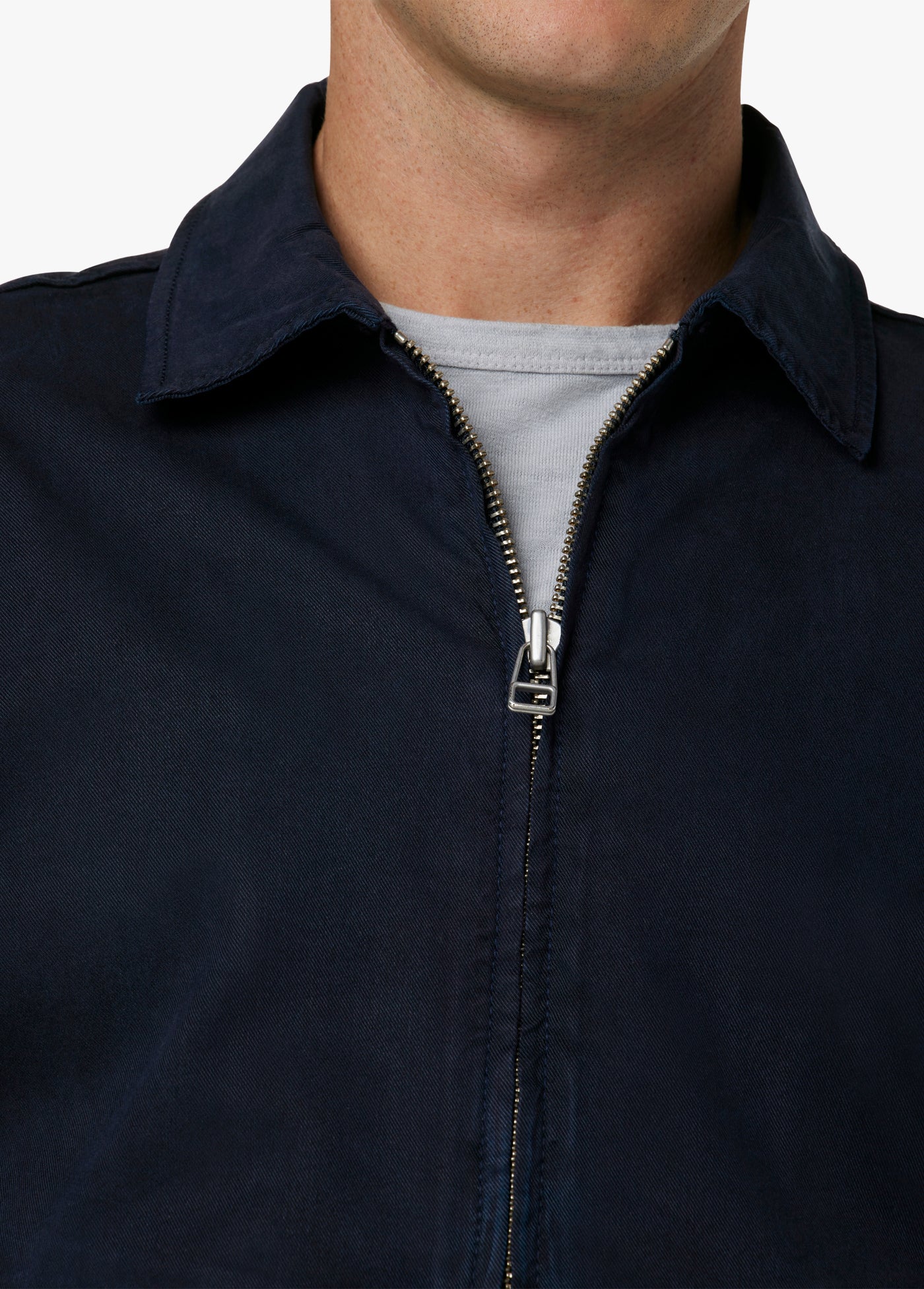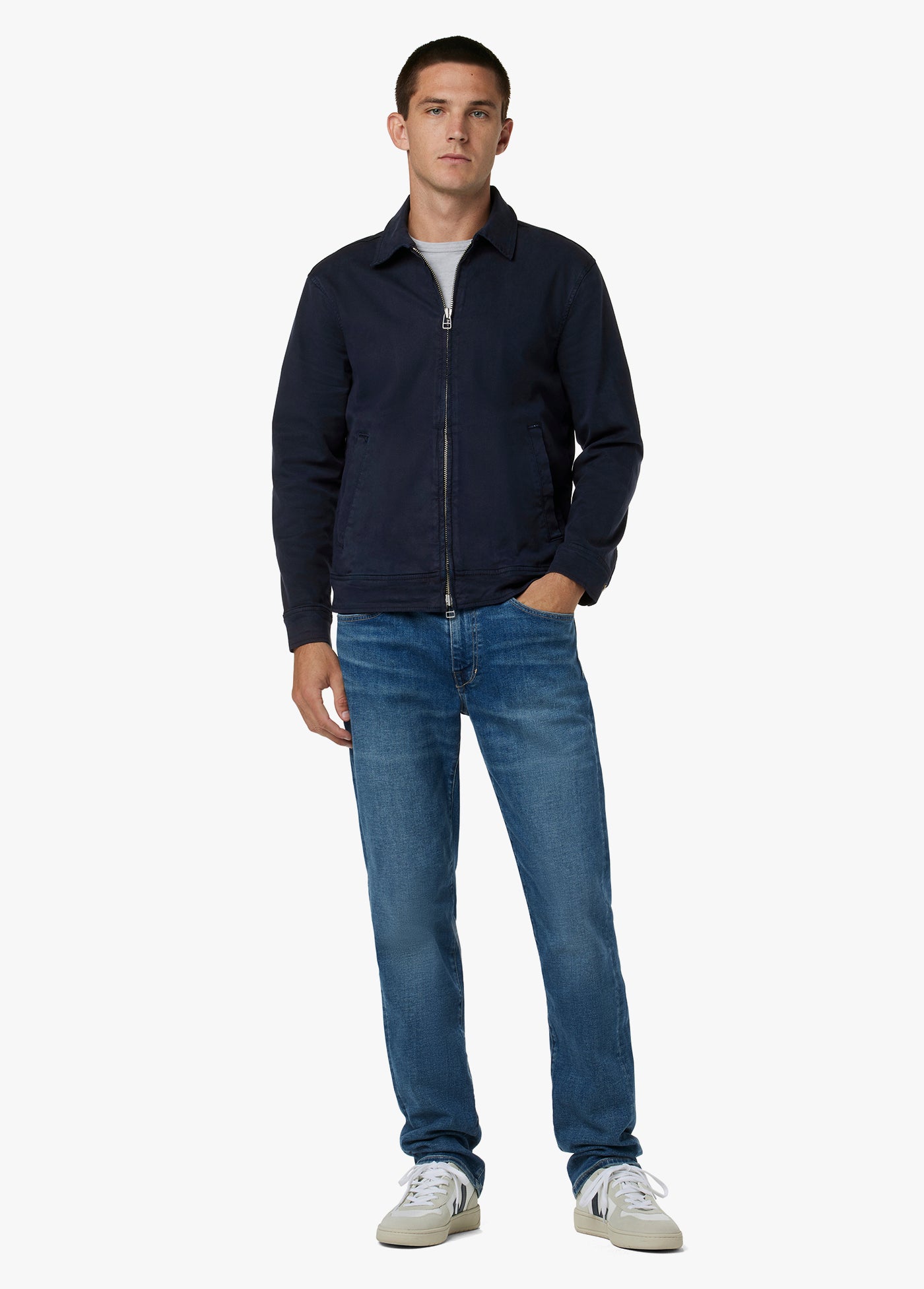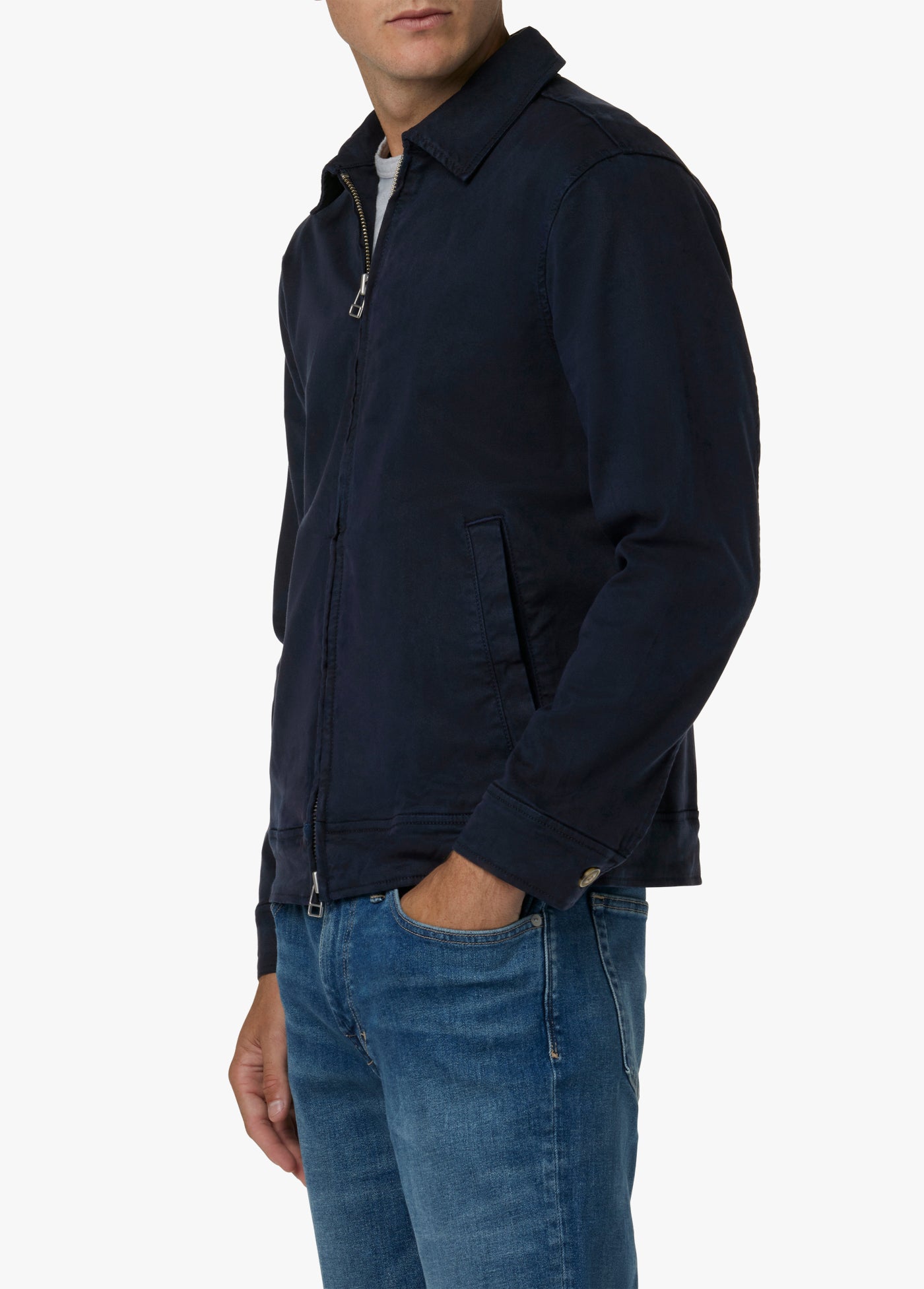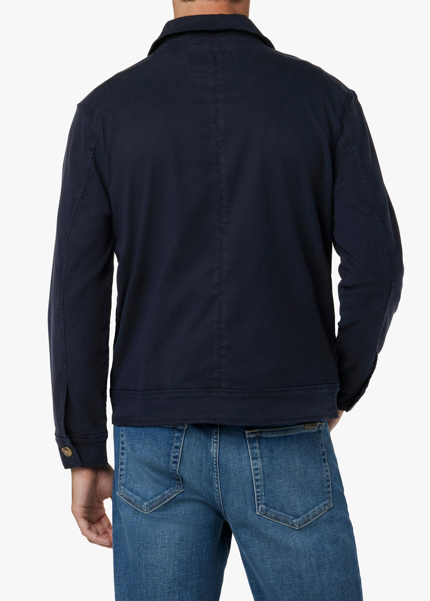 The Mechanic Jacket in Night Sky has vintage-inspired styling with modern stretch-blend fabric for comfort and softness. It features a zipper closure, binding details and pointed collar in the perfect weight to be worn all year.