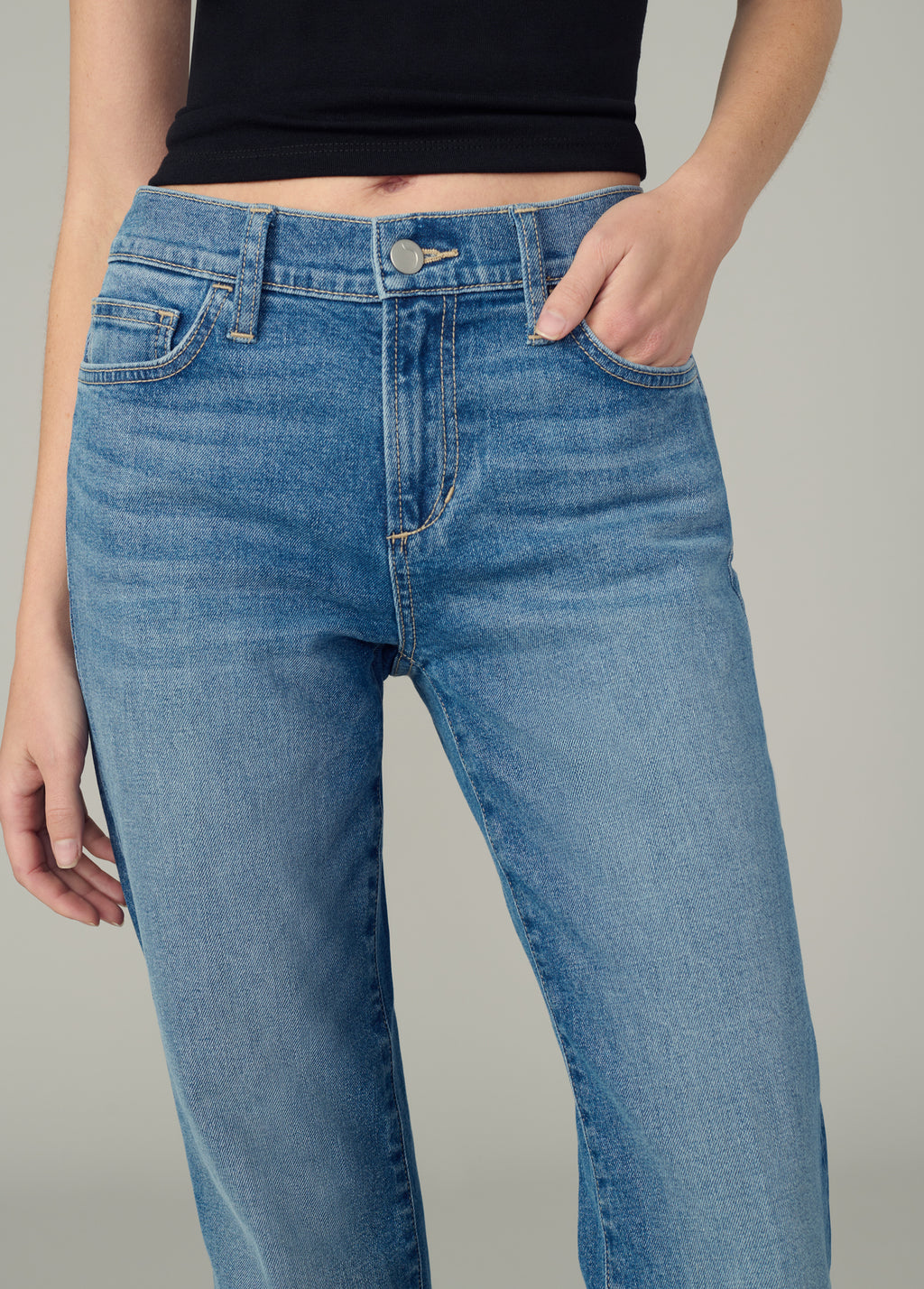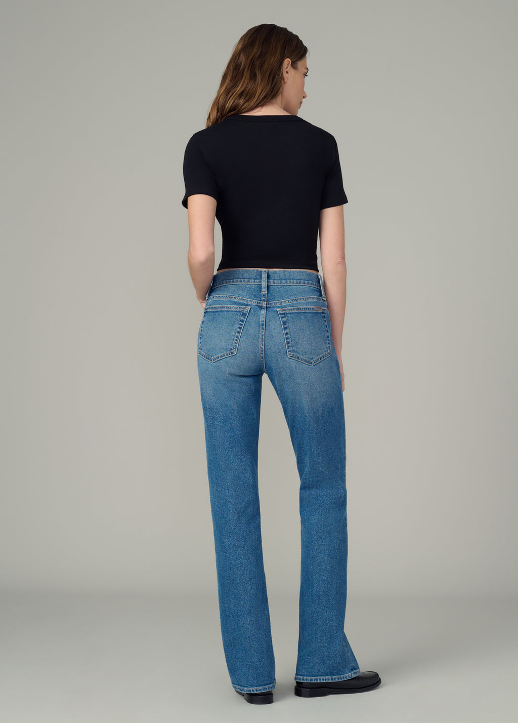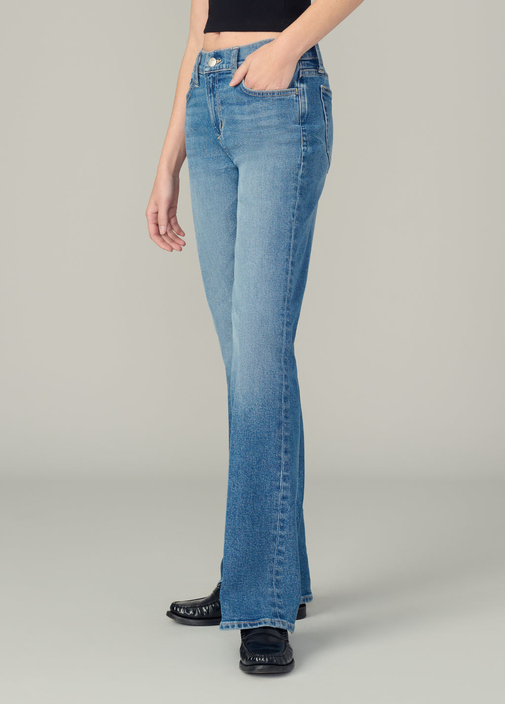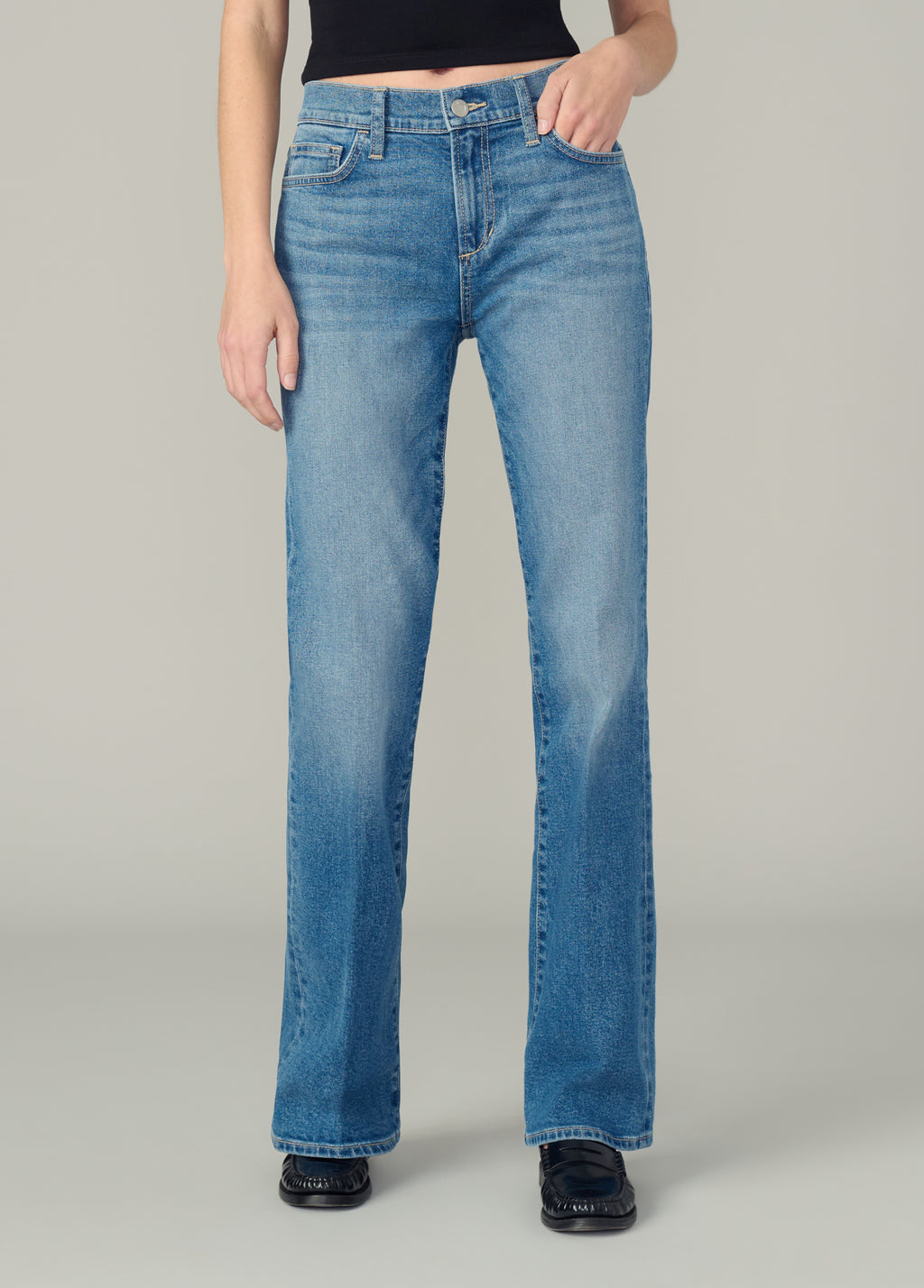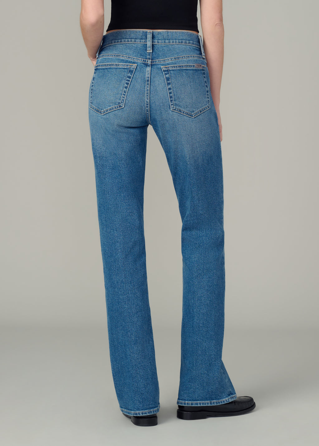 A mid rise and slim fit through the waist, hip and thigh with a 31" full-length bootcut, perfectly proportioned for 5'4" and under. Featured in Tunsia, a medium-indigo wash.