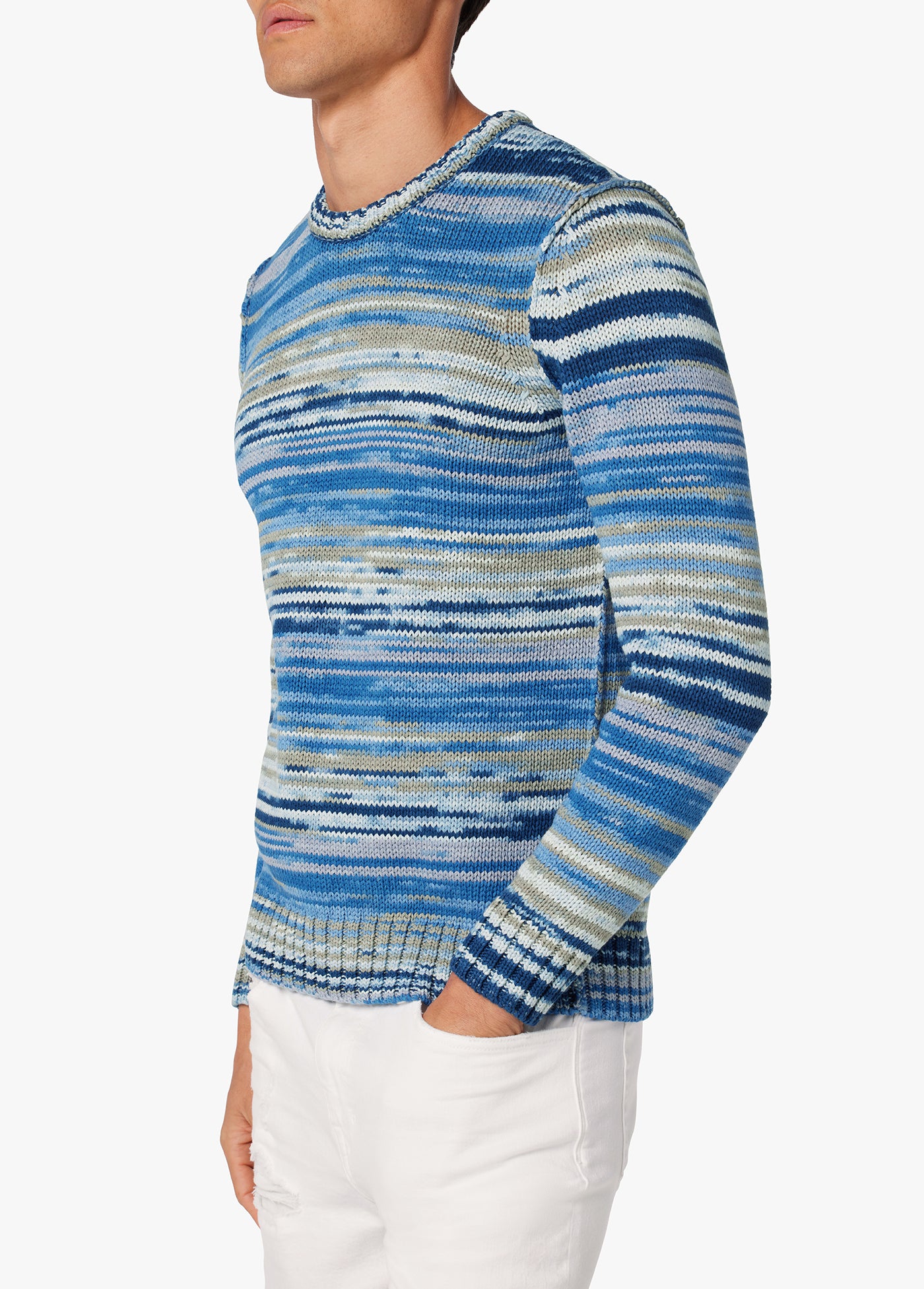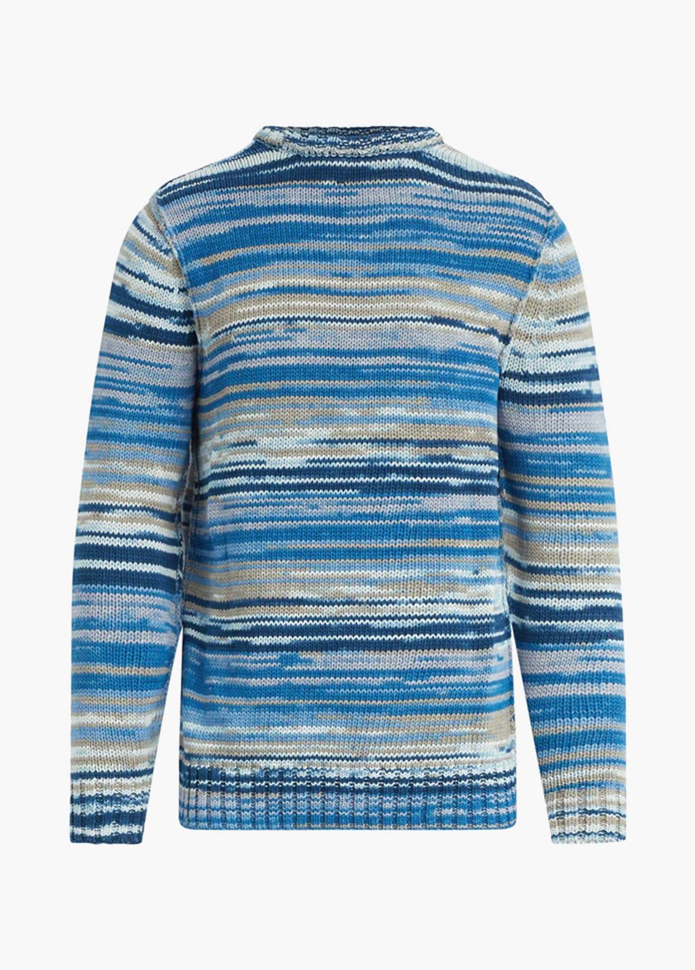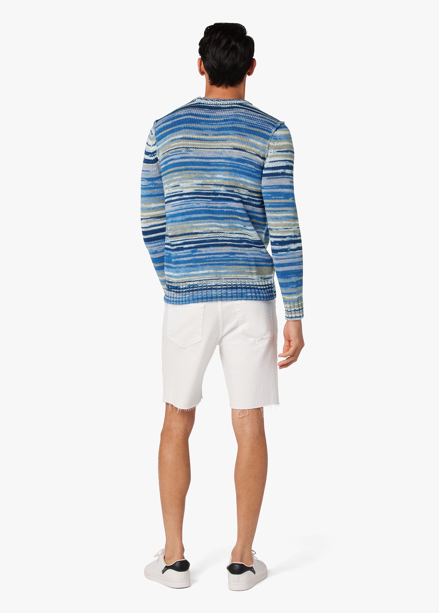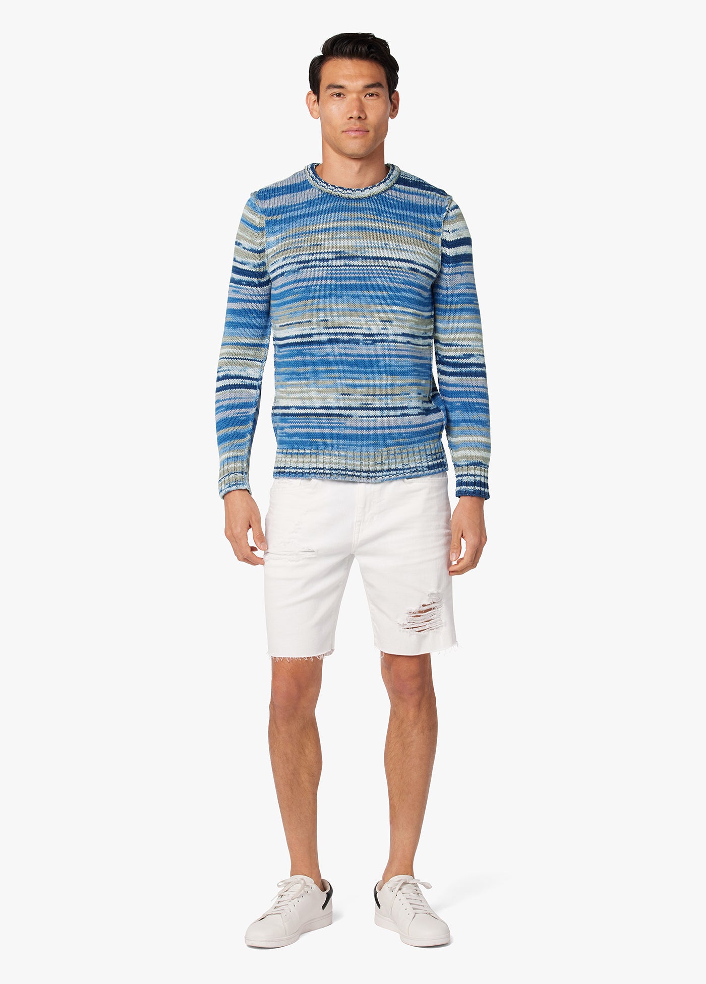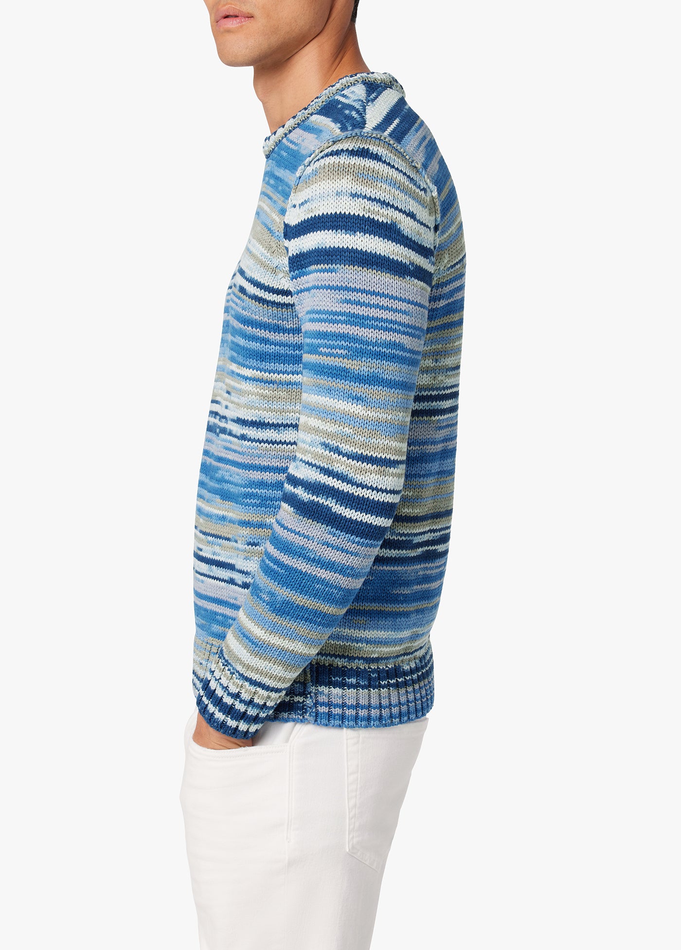 Because the imported Italian cotton is knit in an abstract pattern, the Space Dyed Sweater is a one-of-a-king multi-color creation. With exposed seams and a unique colorway, this sweater pairs well with summer shorts and light washed denim.