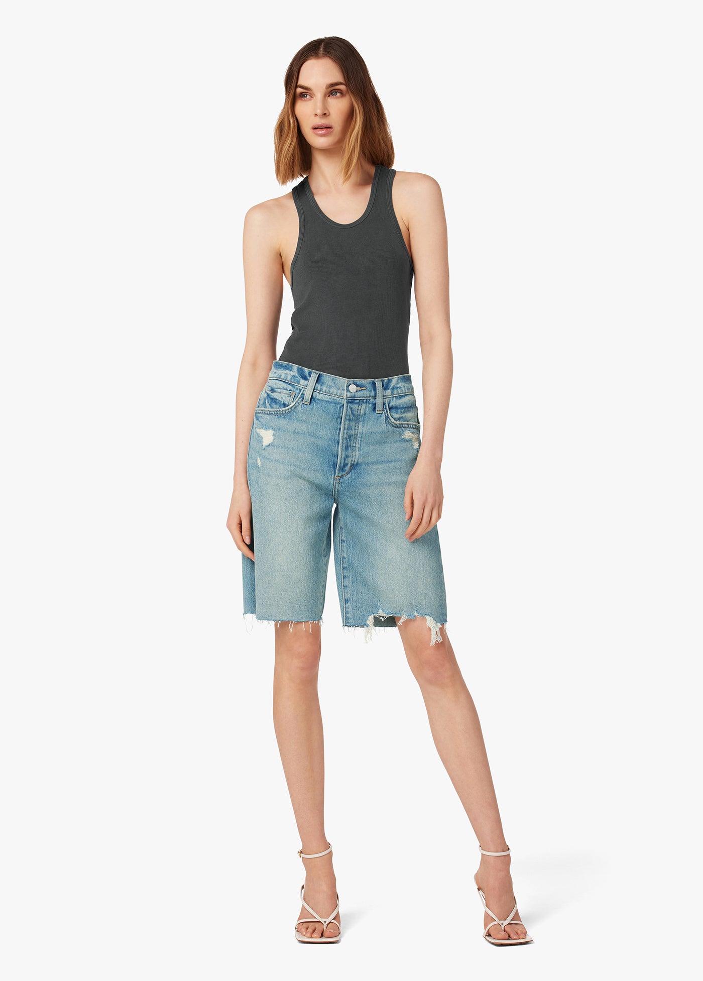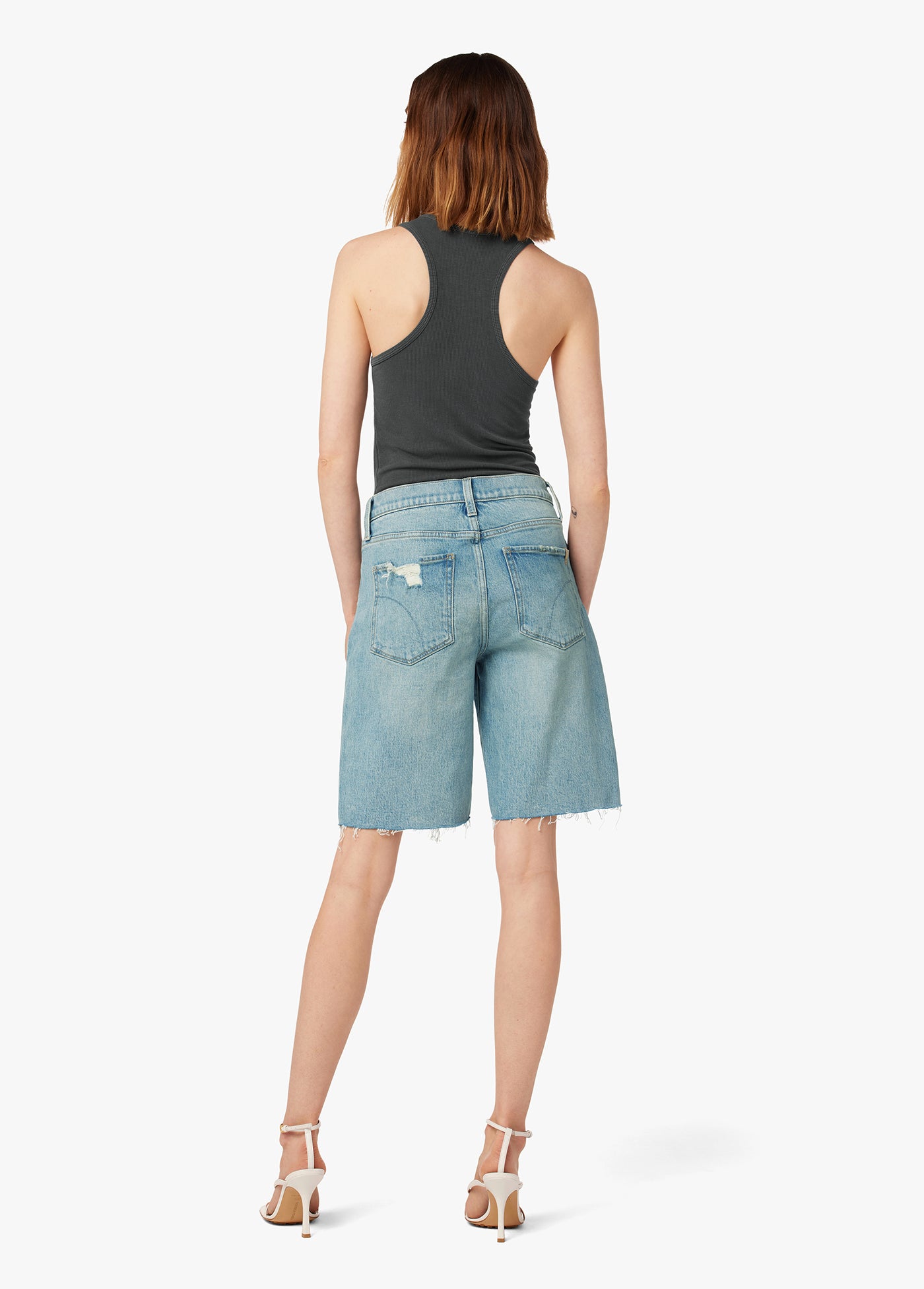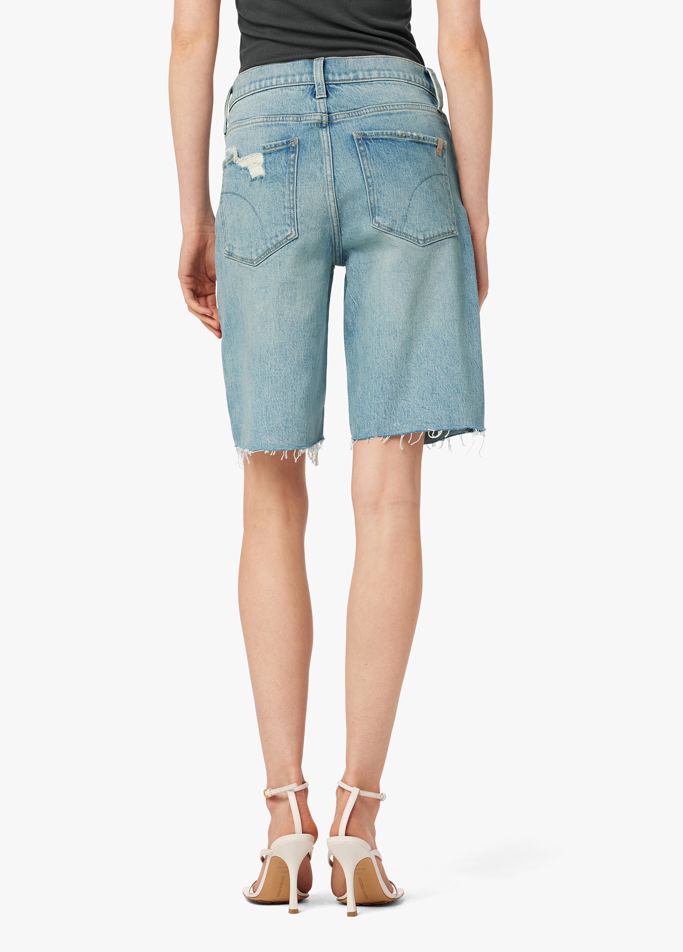 The 90s Bermuda Short in 'Indiana' is the perfect pair for warm, sunny days. Designed with modern stretch and a vintage look, this five-pocket style features softly frayed hems with mild destruction near the front pockets and hem. The vintage character of the workwear hue has a casual finish and a throwback look.