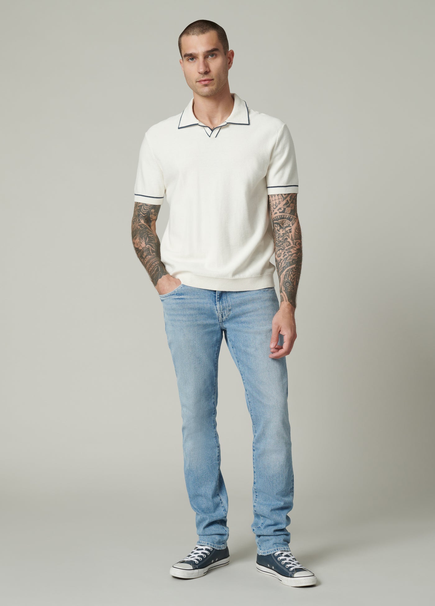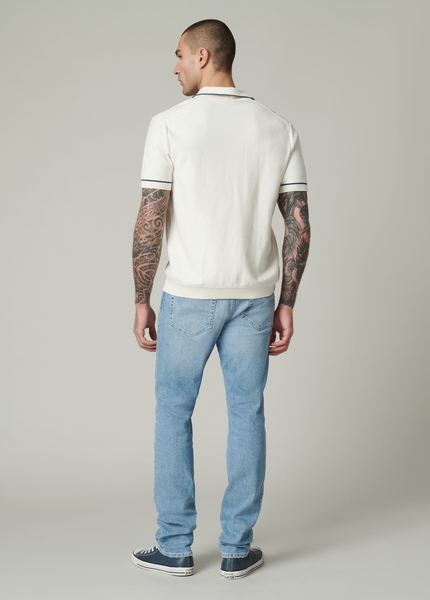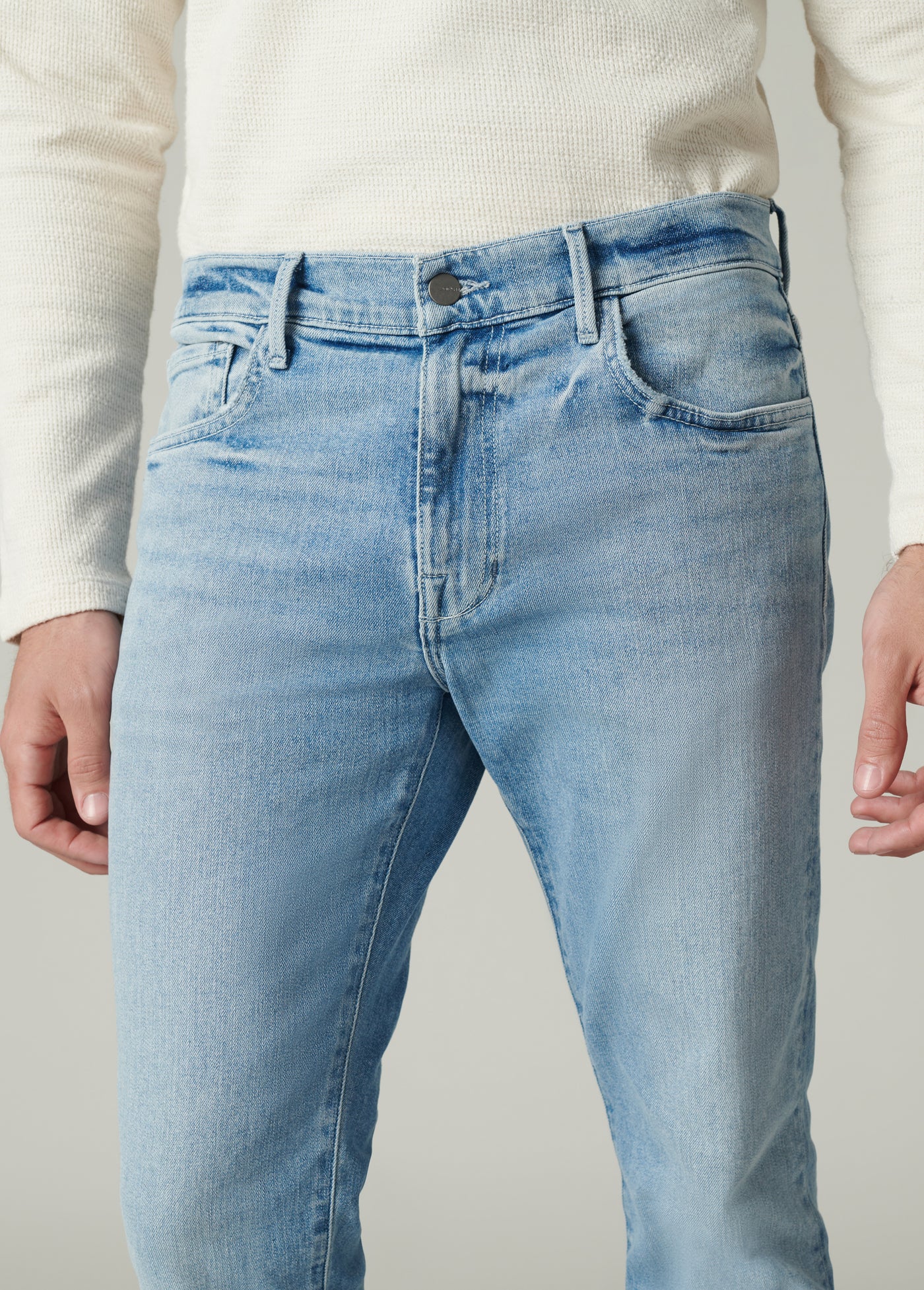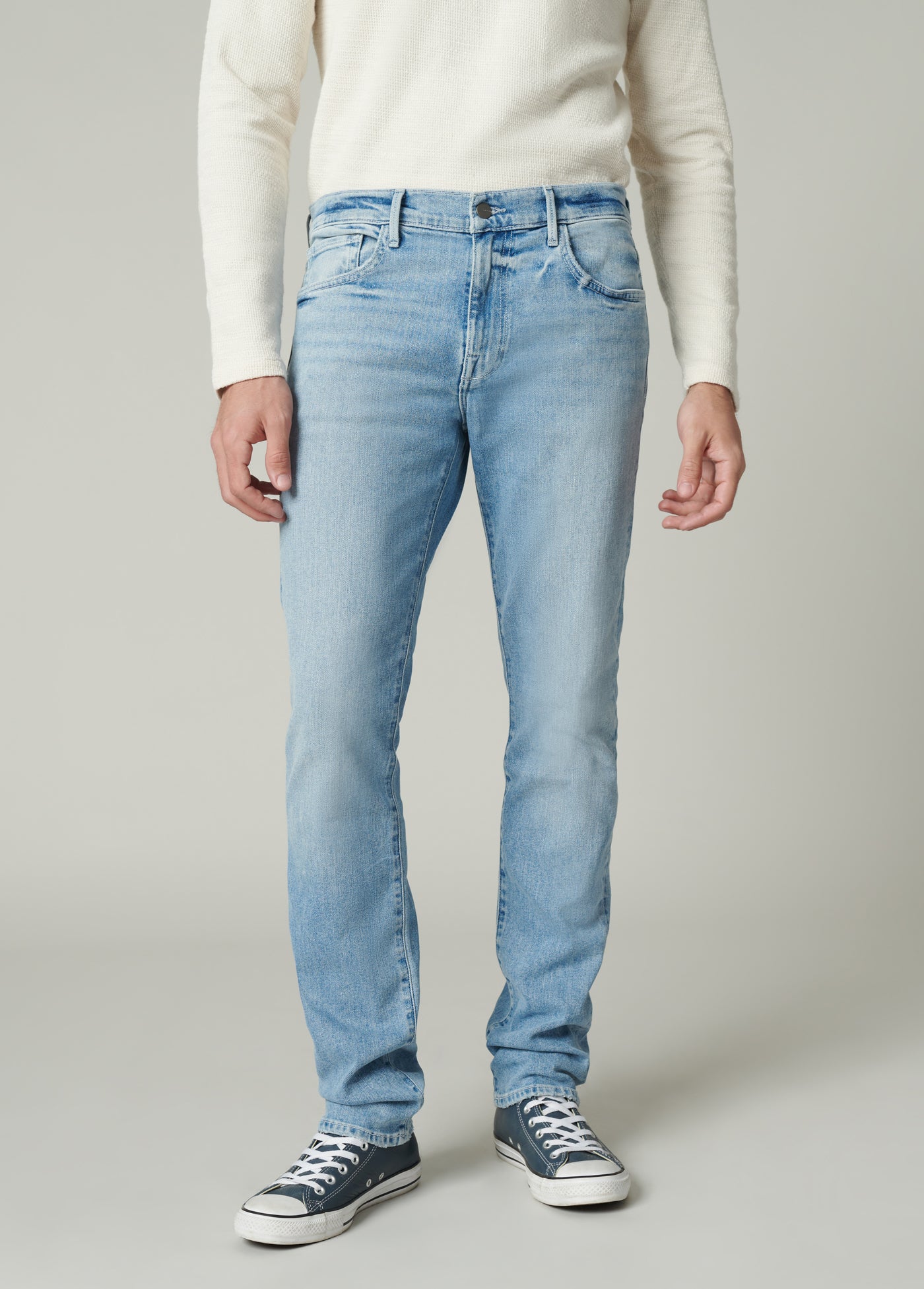 The Asher in Jaxx is a slim fit jean in a light-indigo wash. Cut from Kinetic Stretch denim designed for comfort, the Jaxx wash is finished with subtle abrasion highlighting the high-low denim details.