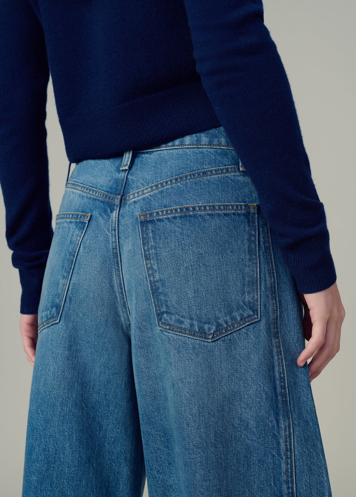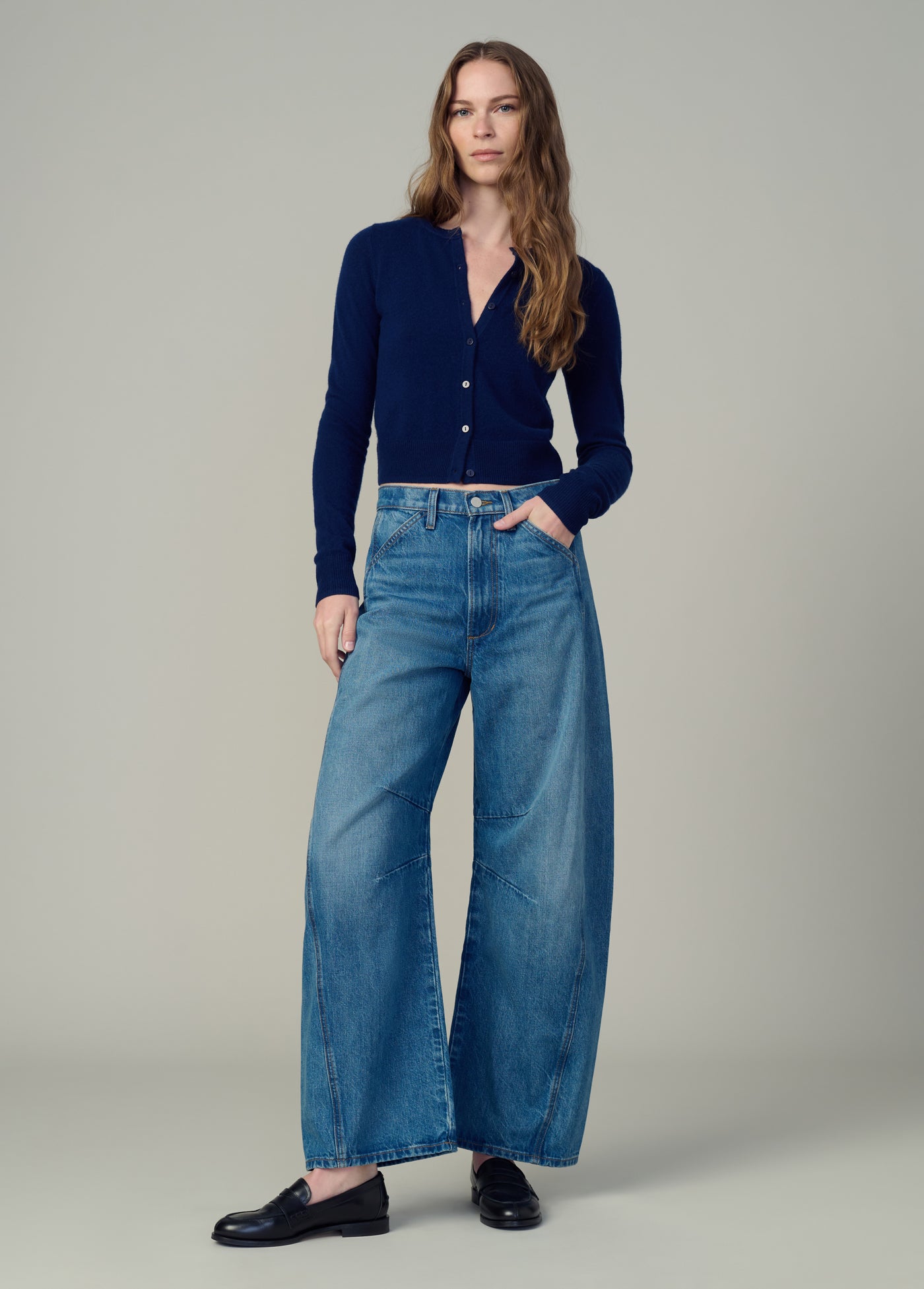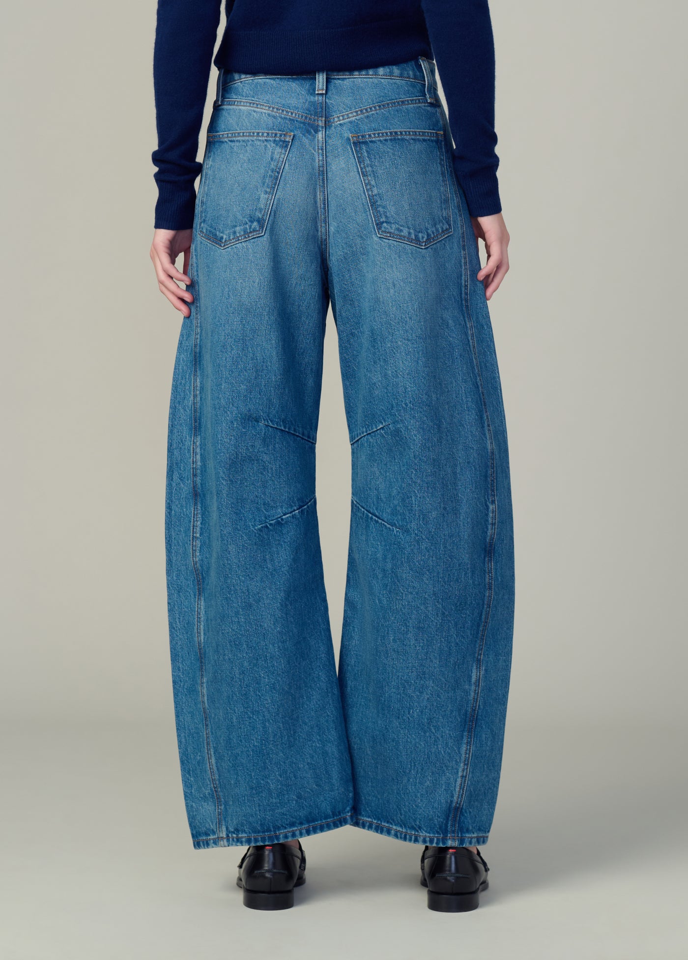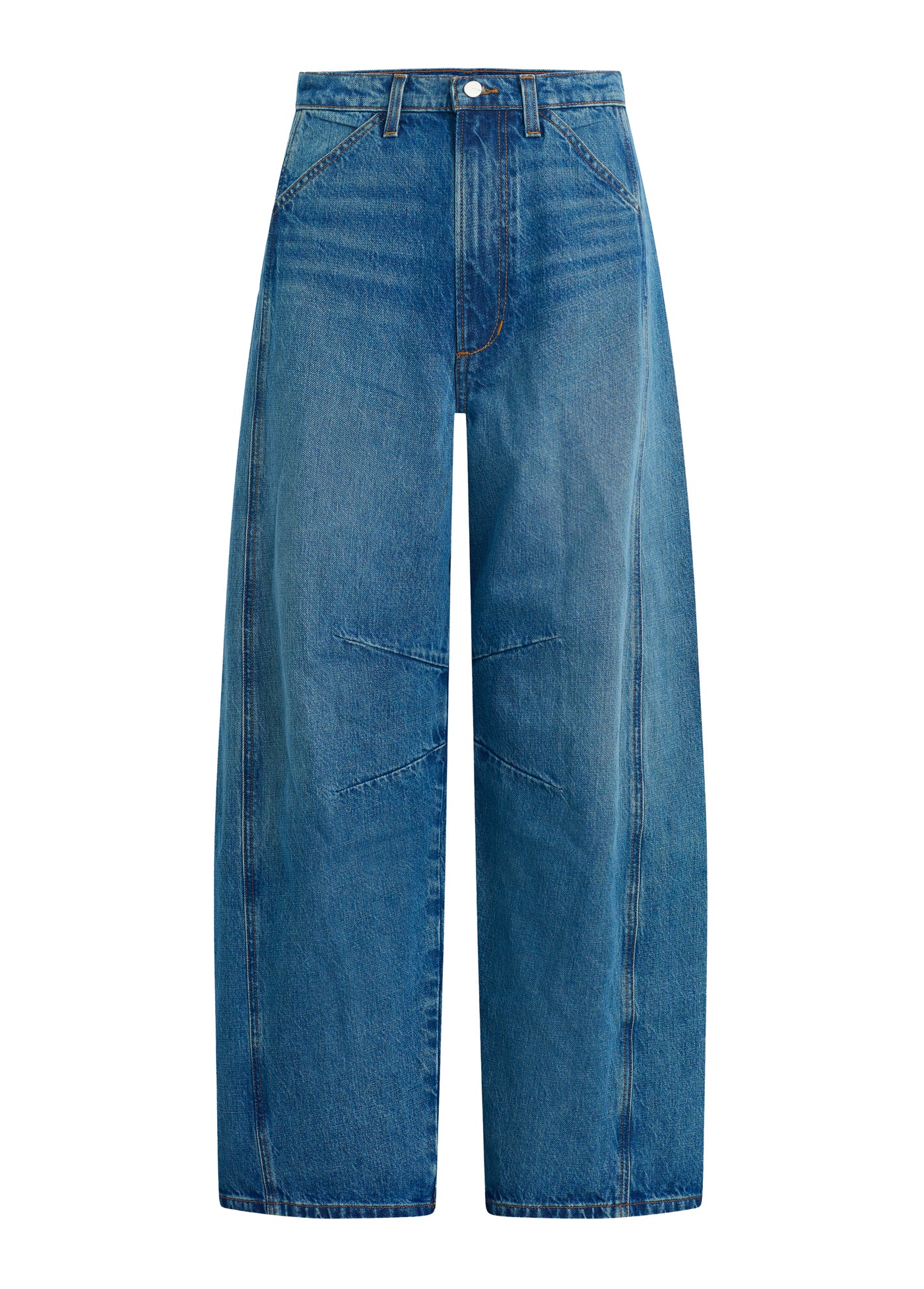 A horseshoe-shaped jean that has a relaxed rise that sits at the waist with an easy hip and exaggerated leg shape that hits at the ankle.