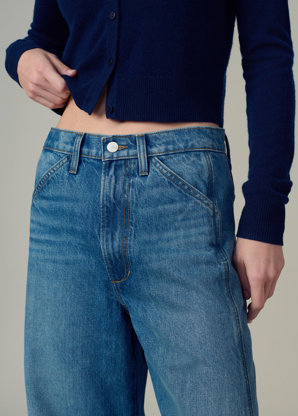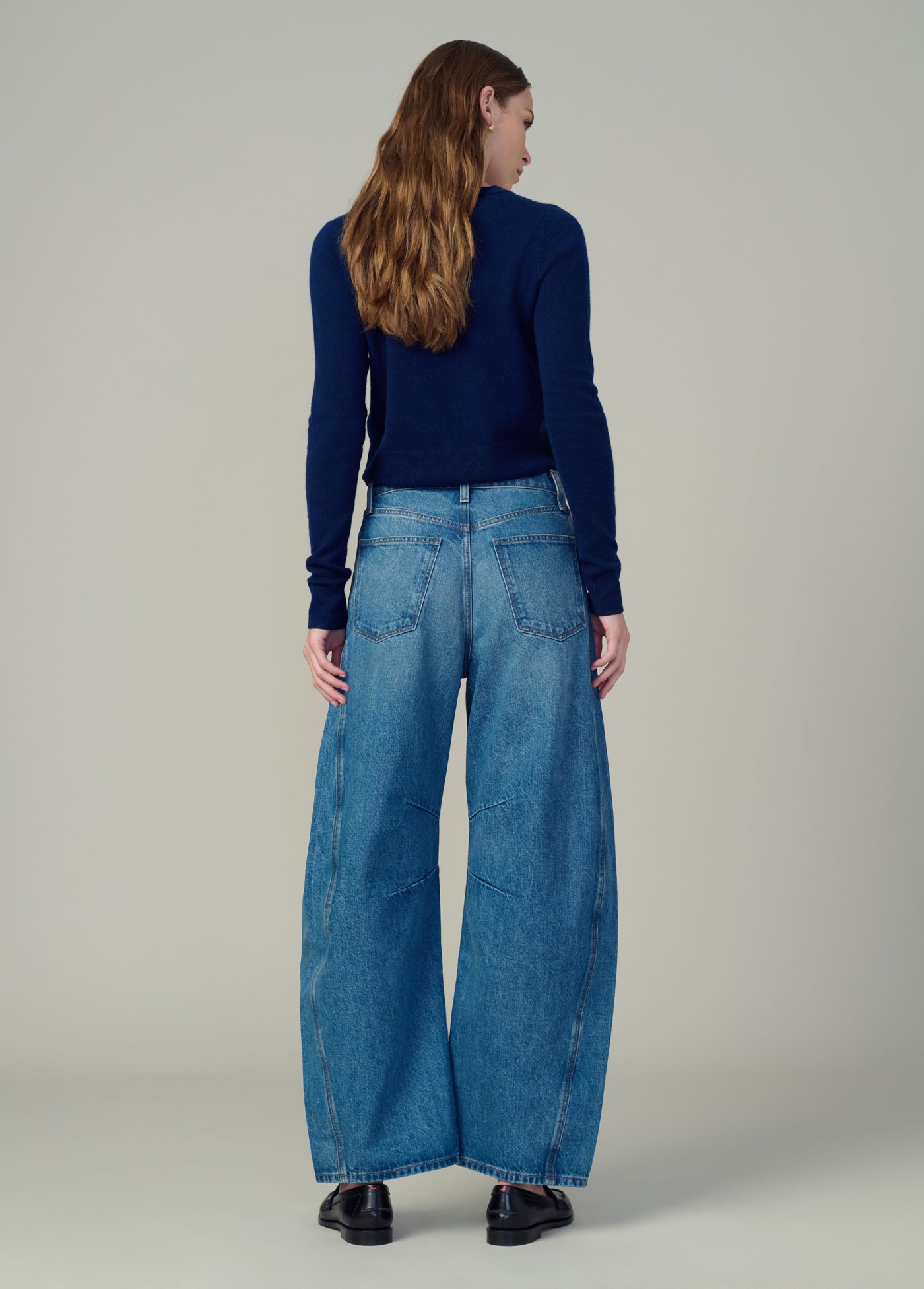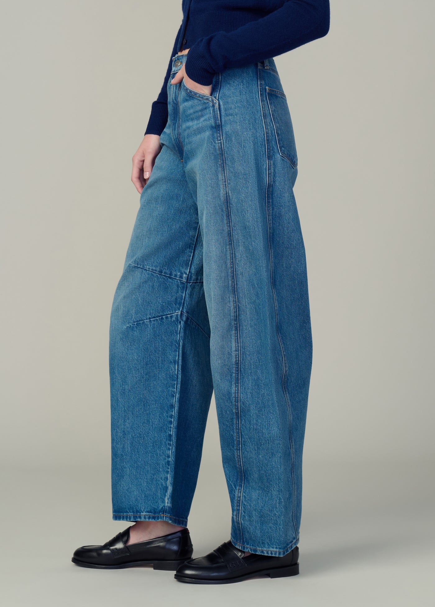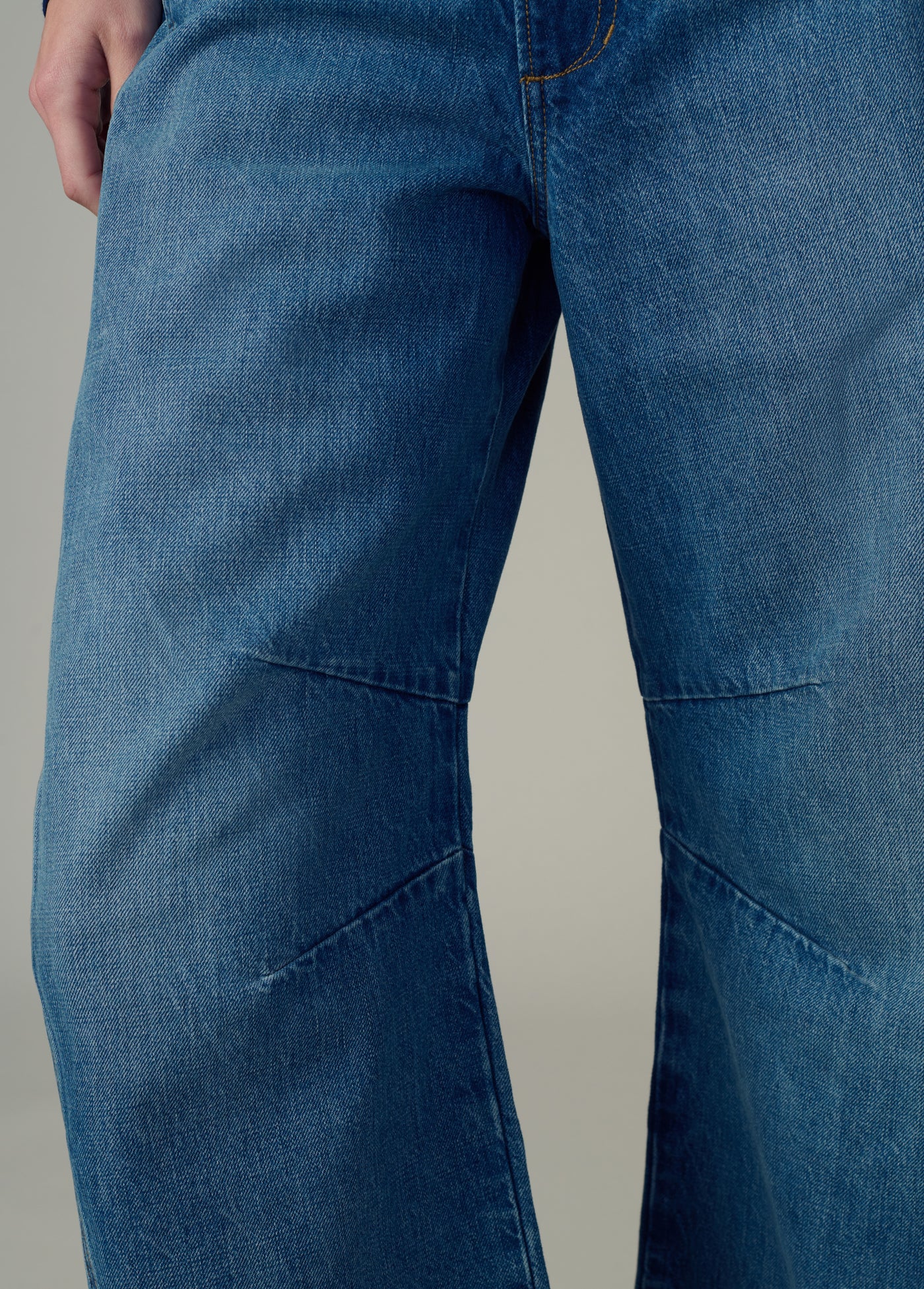 A horseshoe-shaped jean that has a relaxed rise that sits at the waist with an easy hip and exaggerated leg shape that hits at the ankle.