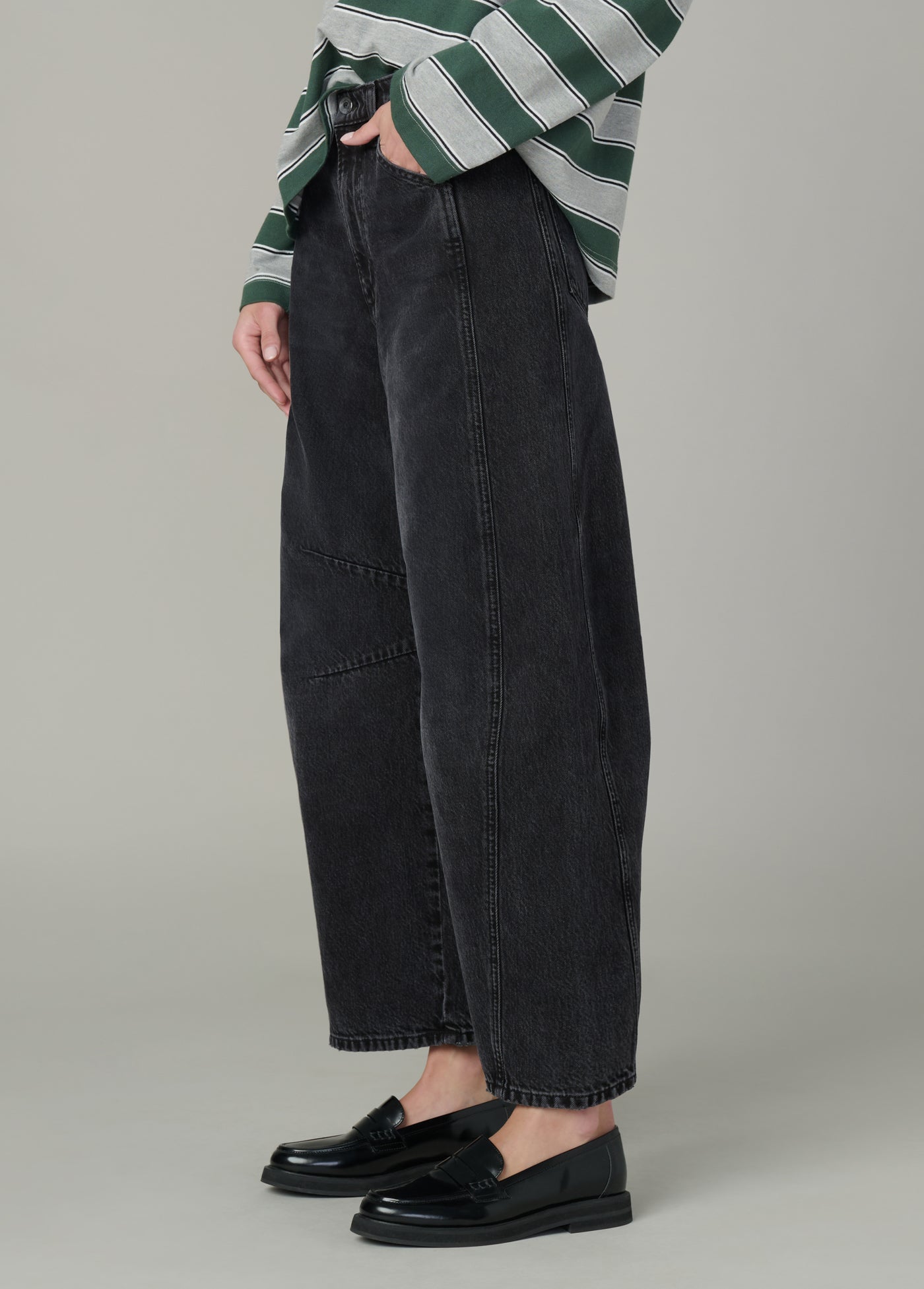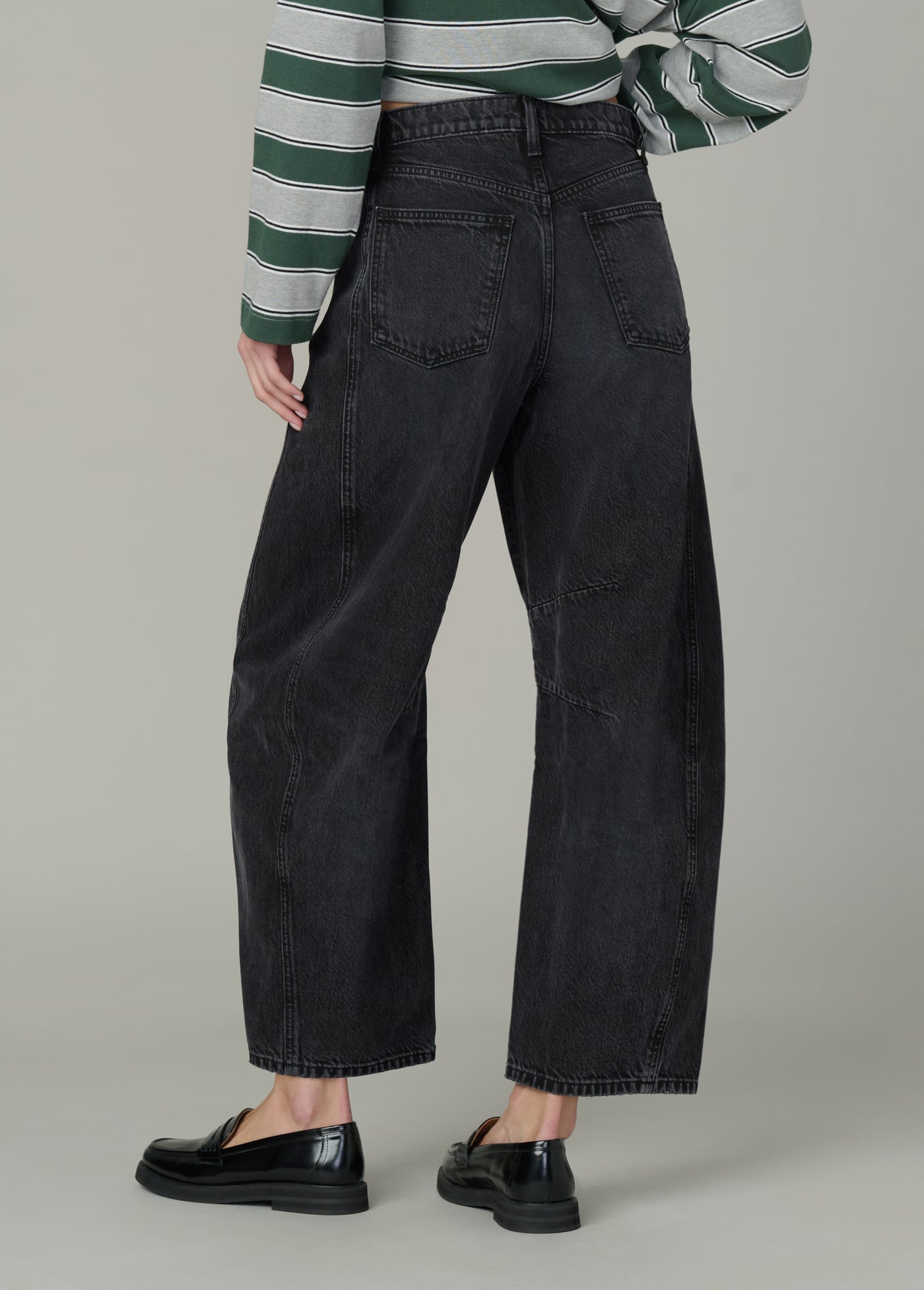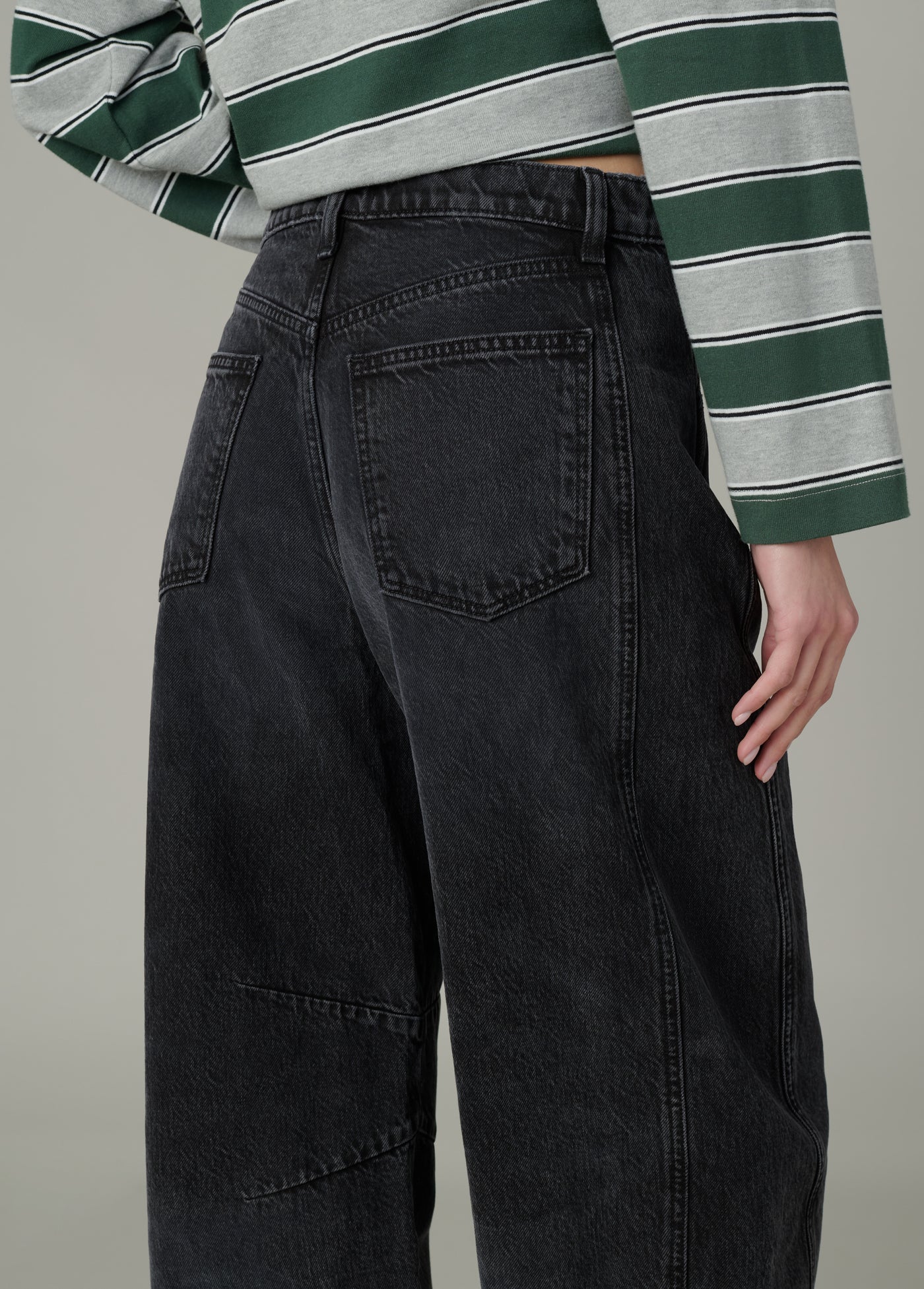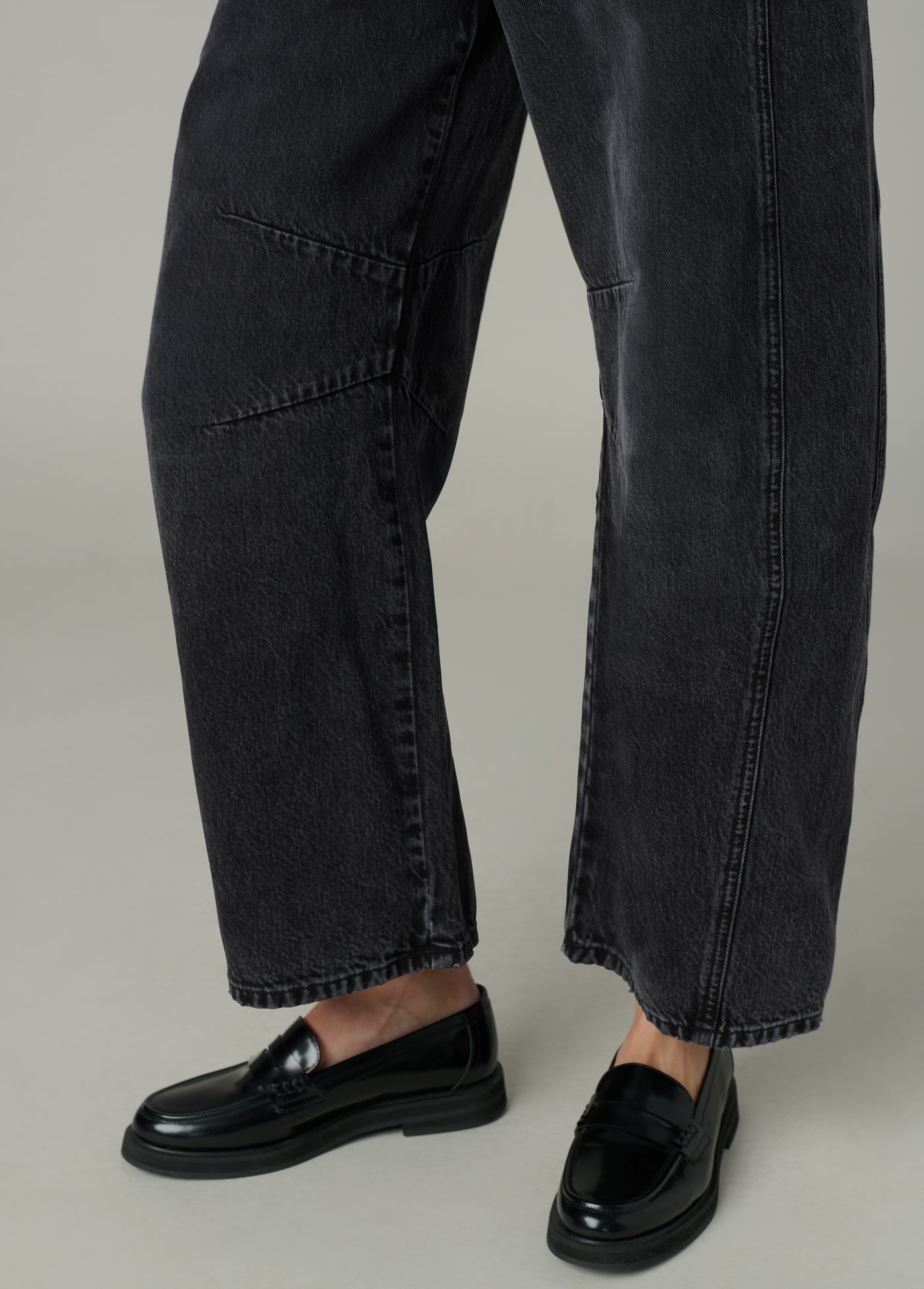 A horseshoe-shaped jean that has a relaxed rise that sits at the waist with an easy hip and exaggerated leg shape that hits at the ankle.
