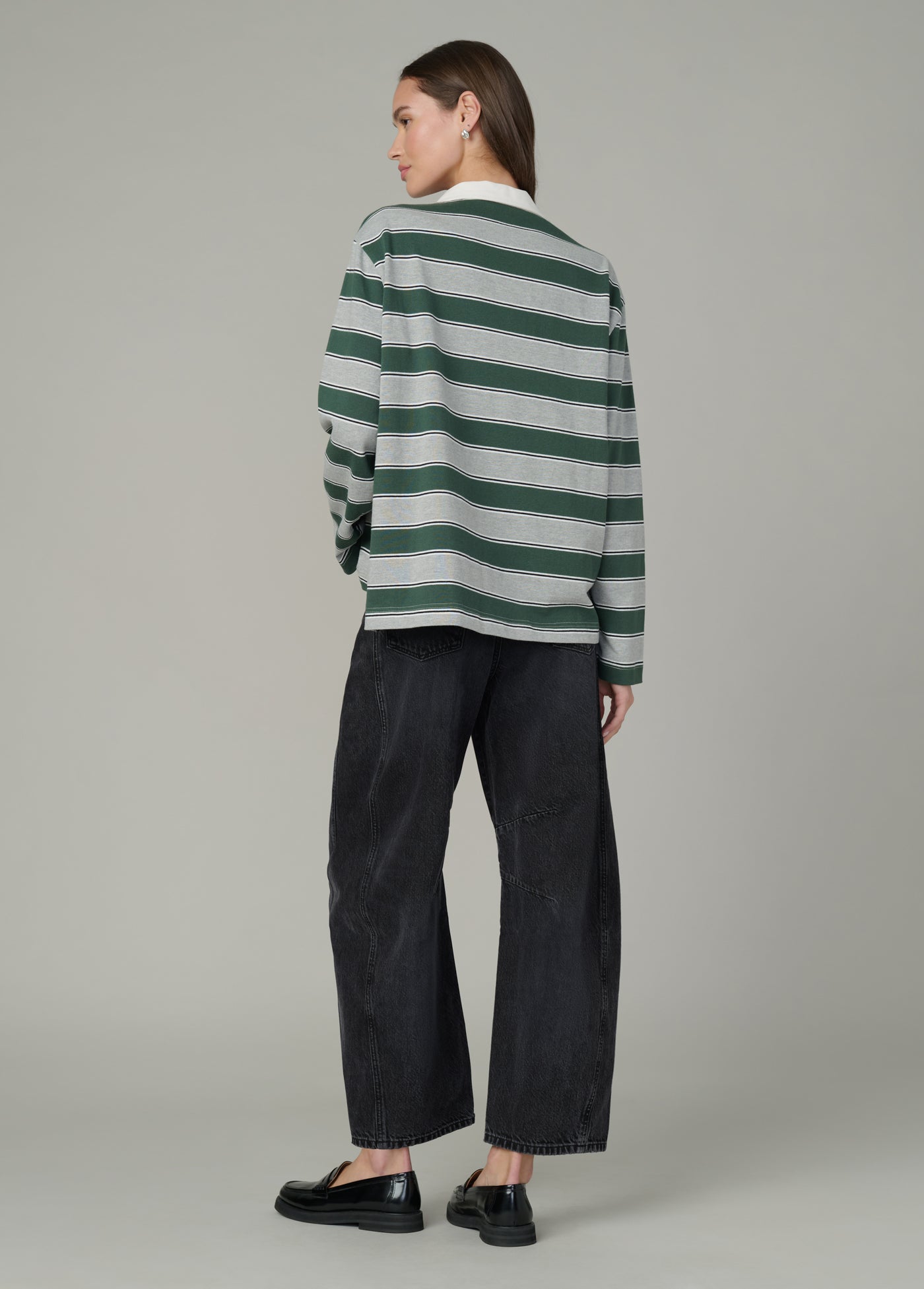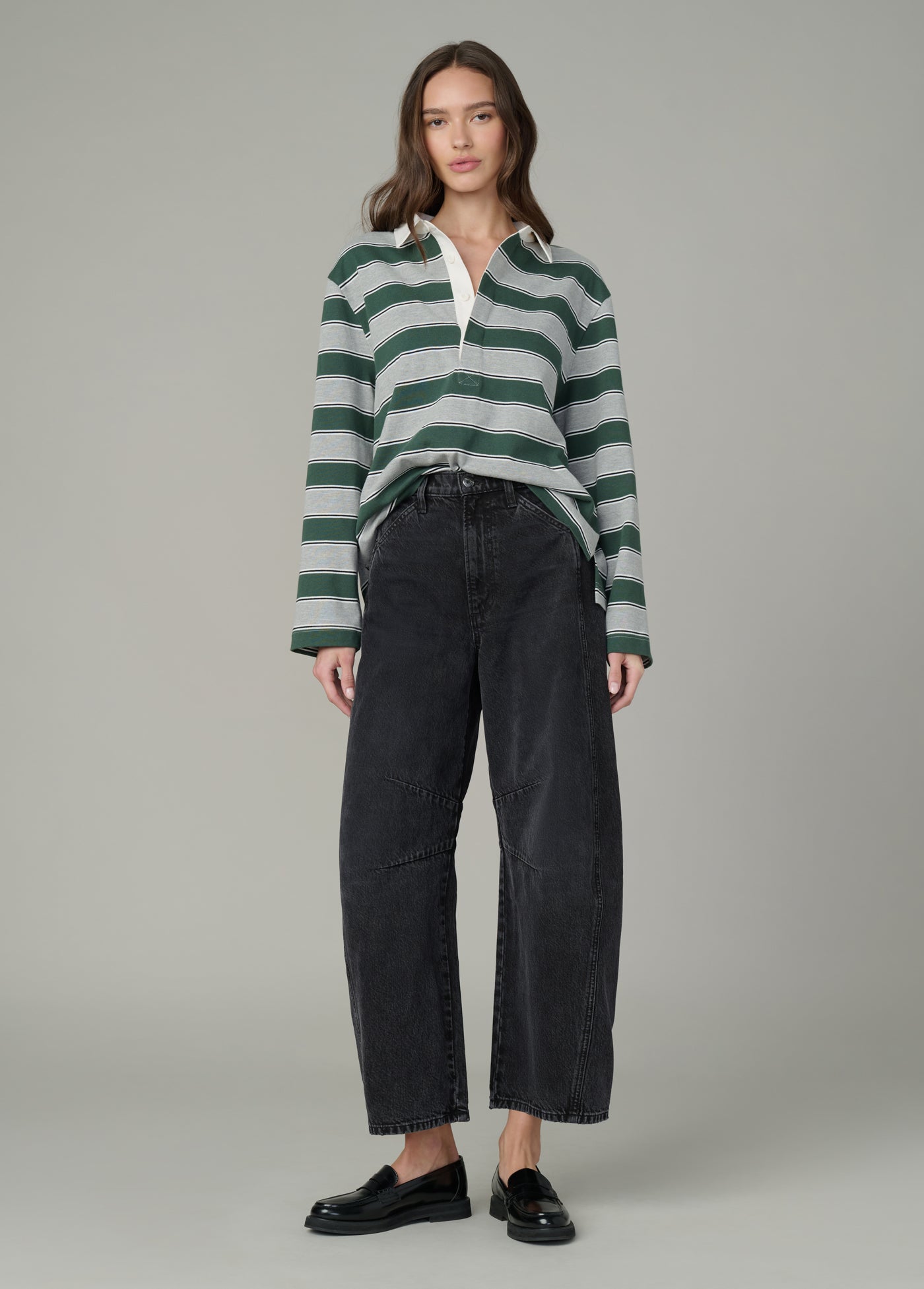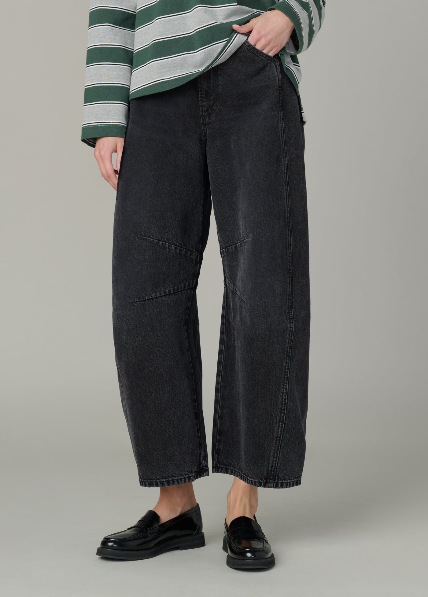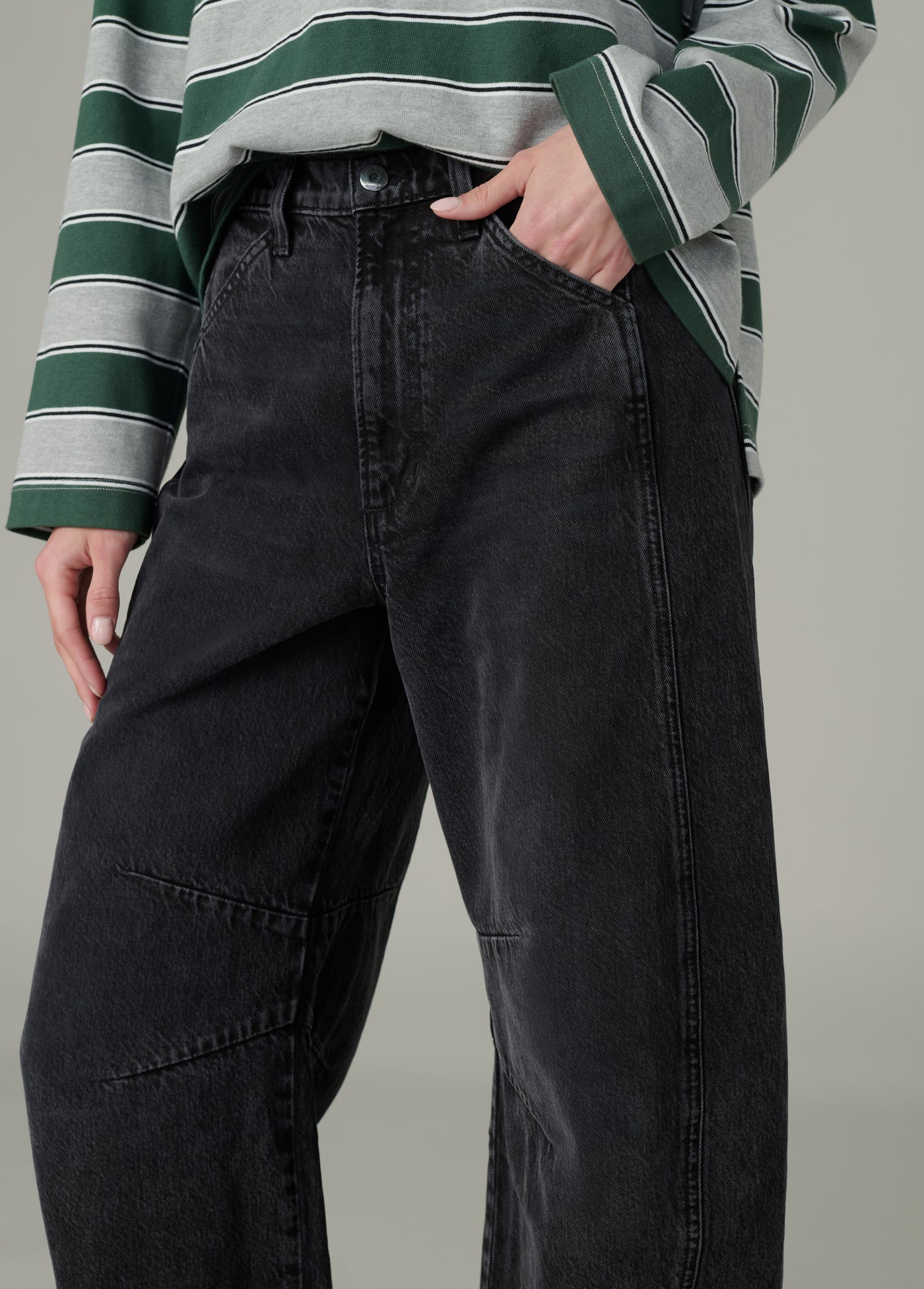 A horseshoe-shaped jean that has a relaxed rise that sits at the waist with an easy hip and exaggerated leg shape that hits at the ankle.