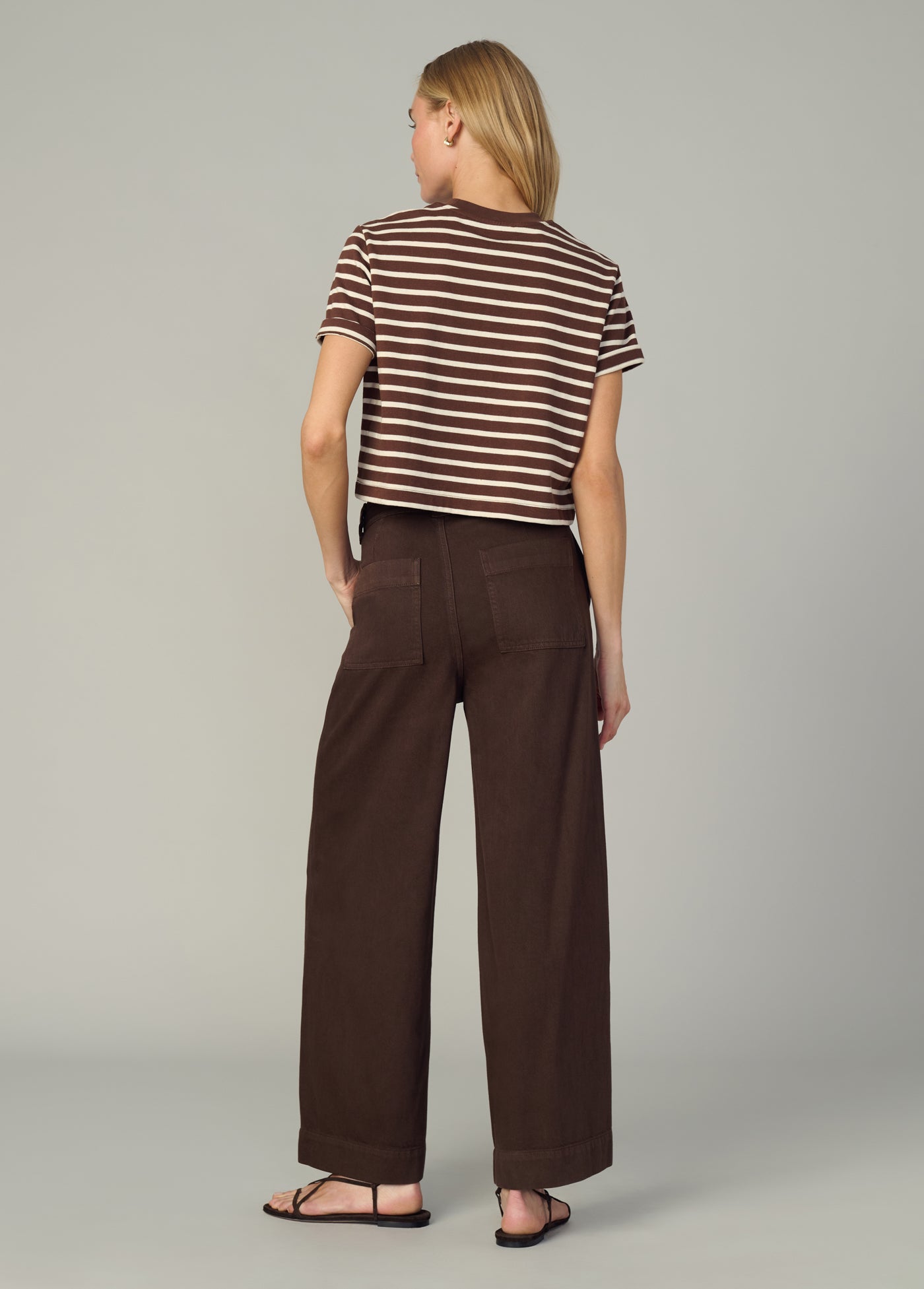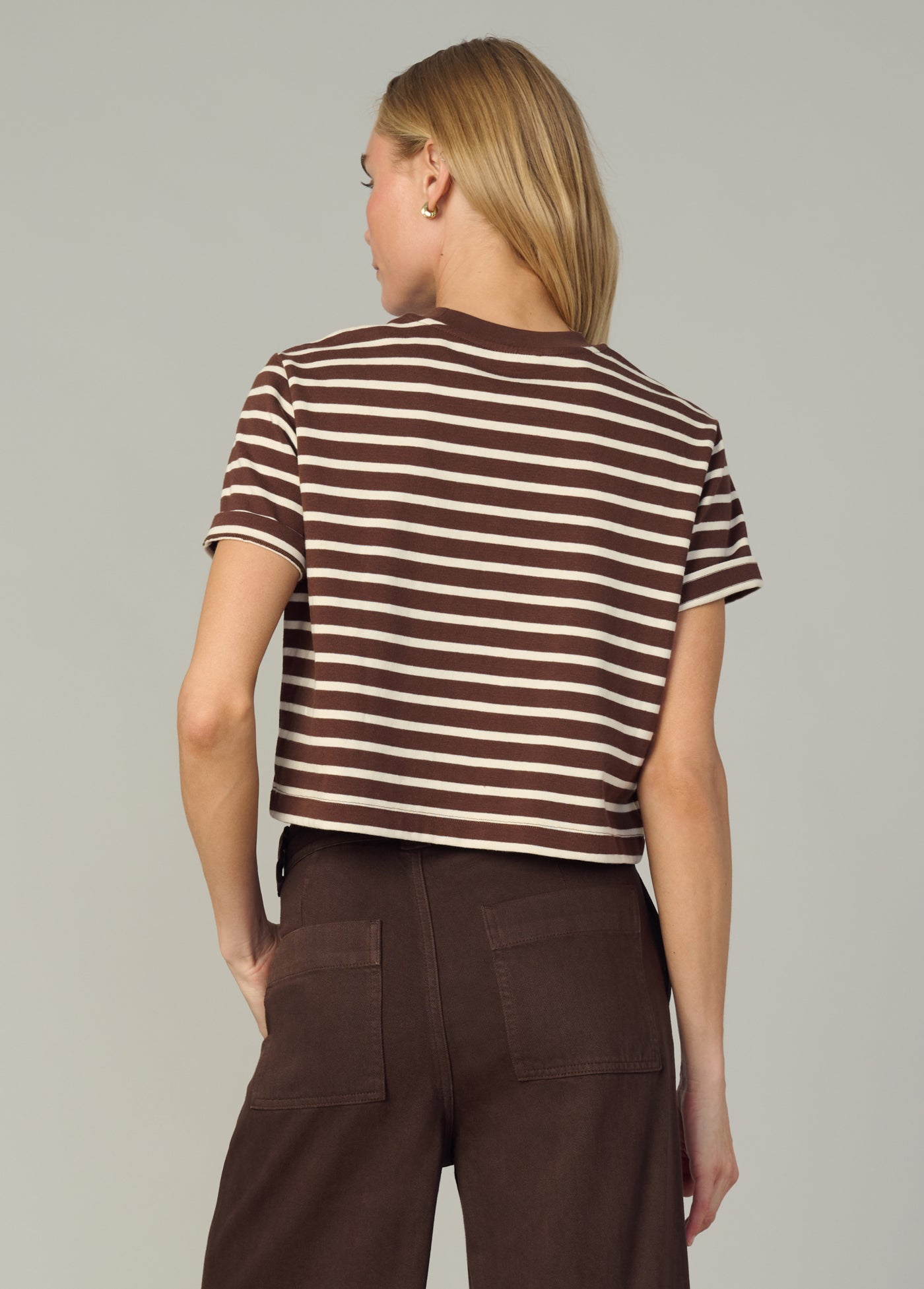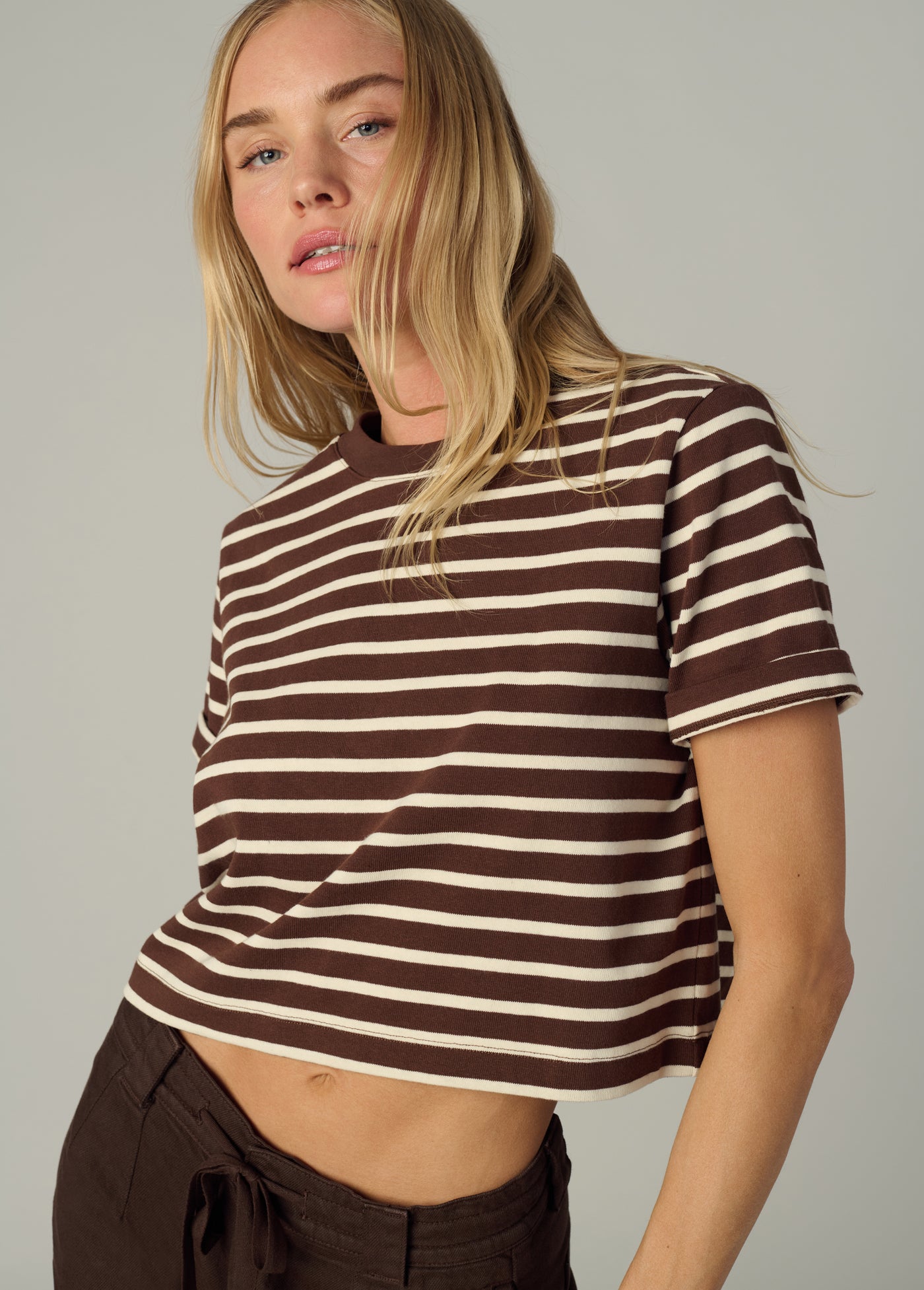 A closet staple: the perfect cropped, structured cotton tee with short sleeves modernizes a classic.