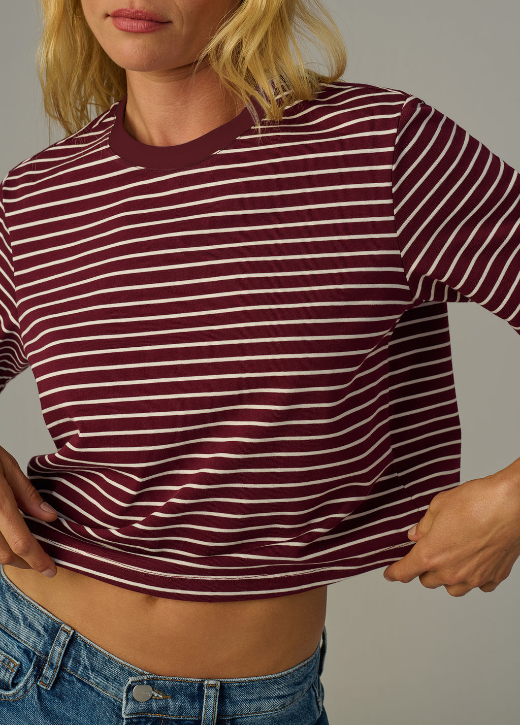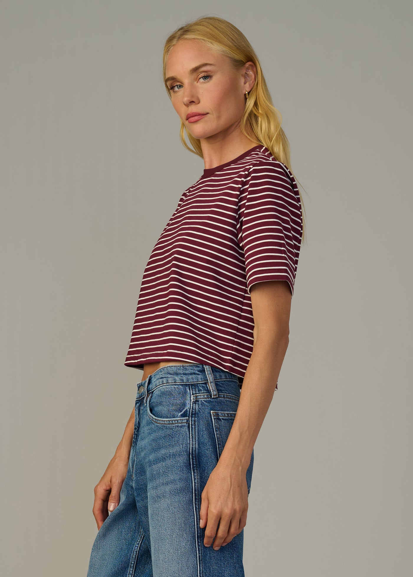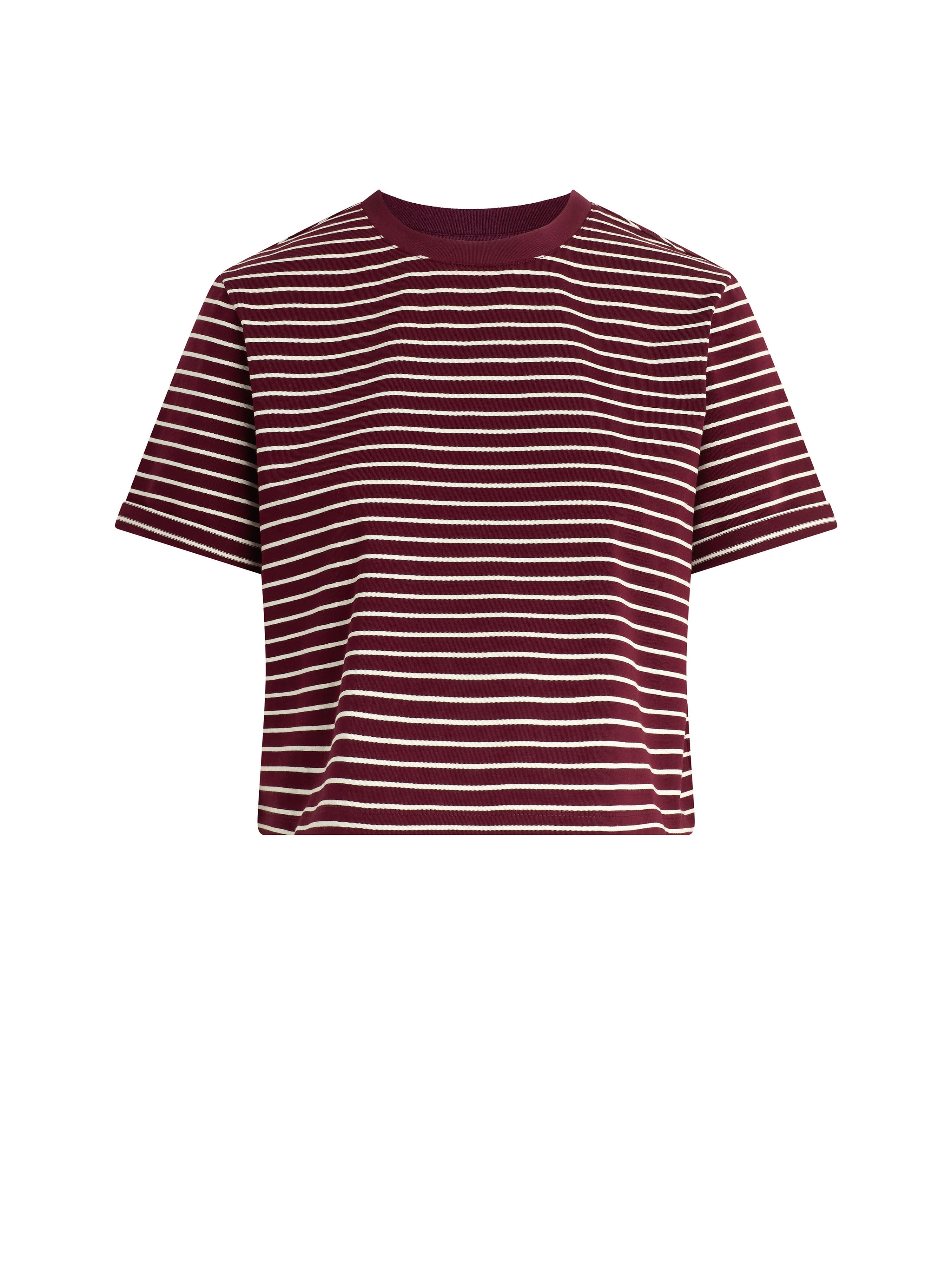 A closet staple: the perfect cropped, structured cotton tee with short sleeves modernizes a classic.