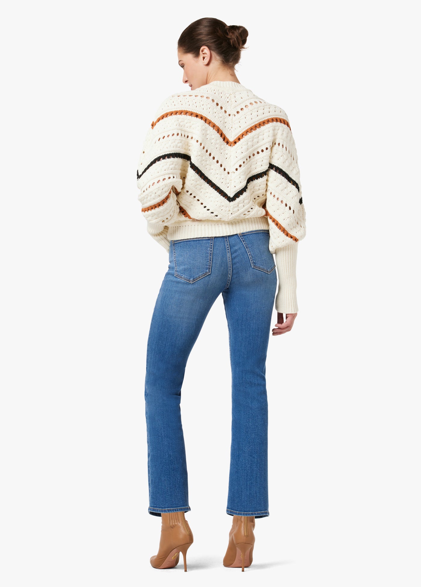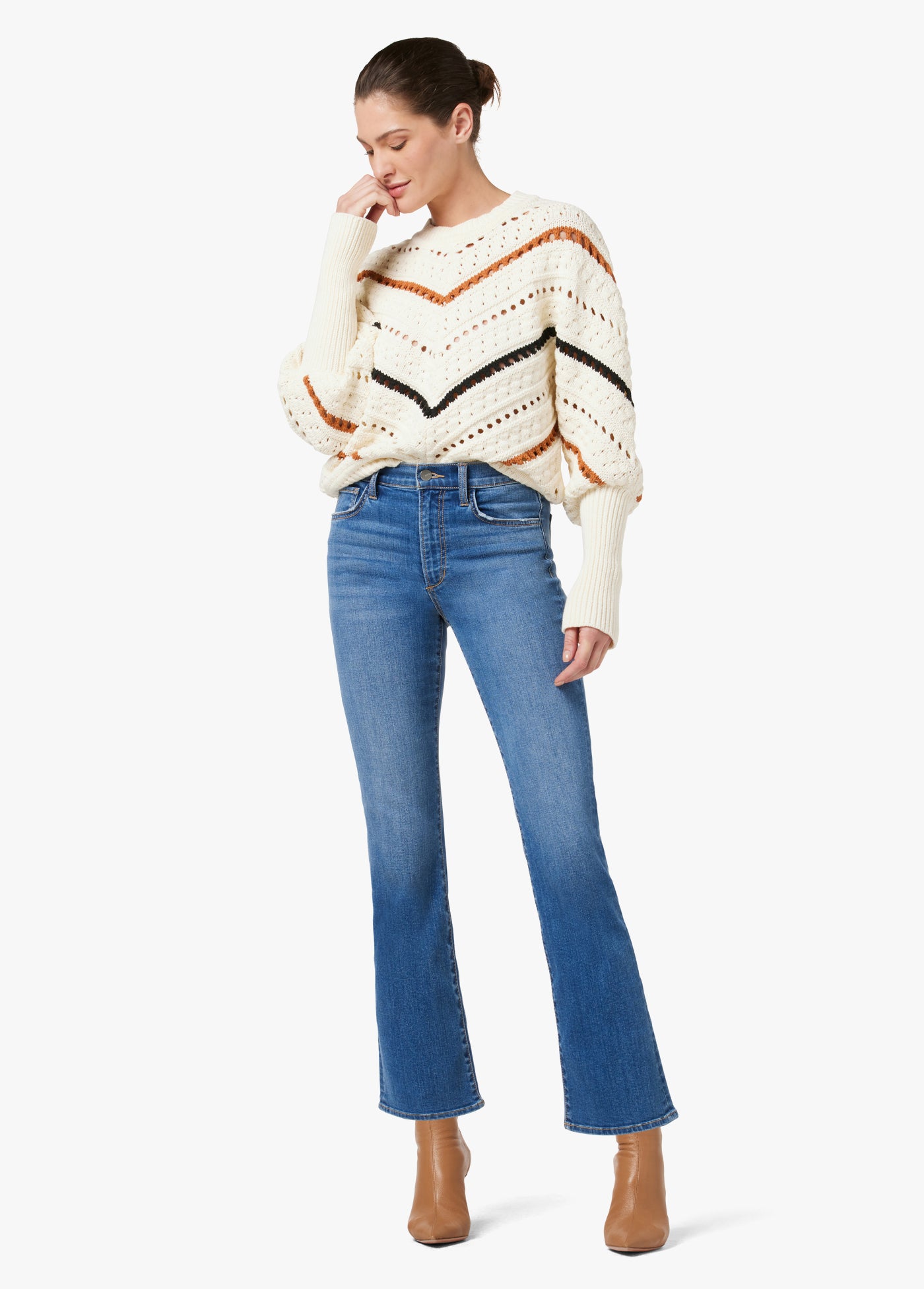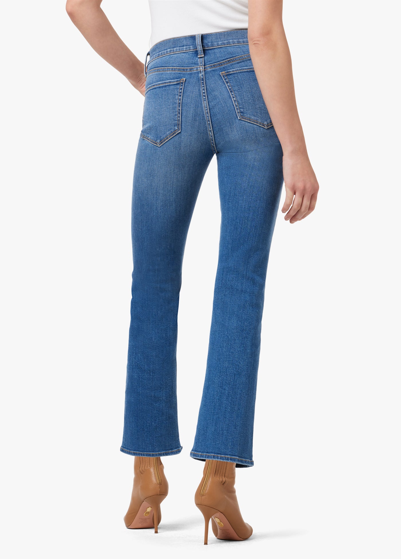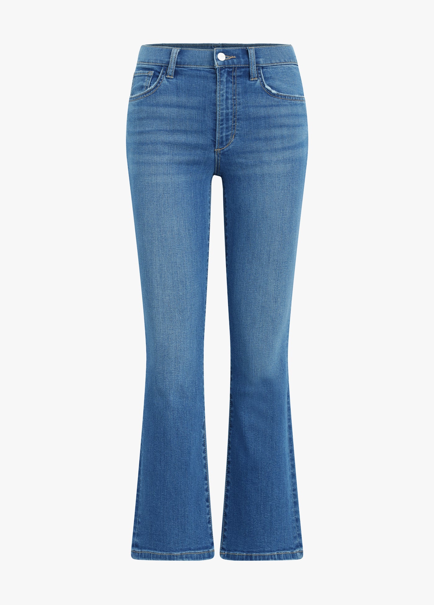 The Callie in Optimist is a high-rise cropped bootcut jean with the comfort and ease of super stretch. The washed down medium-dark shade is finished with local sanding and whiskering.