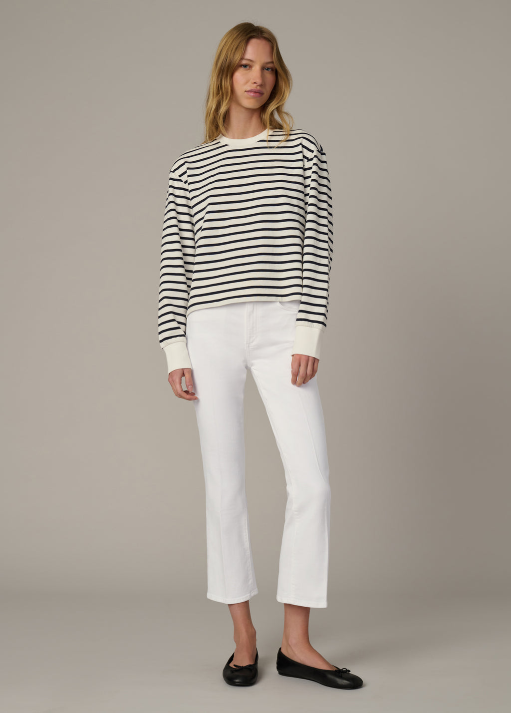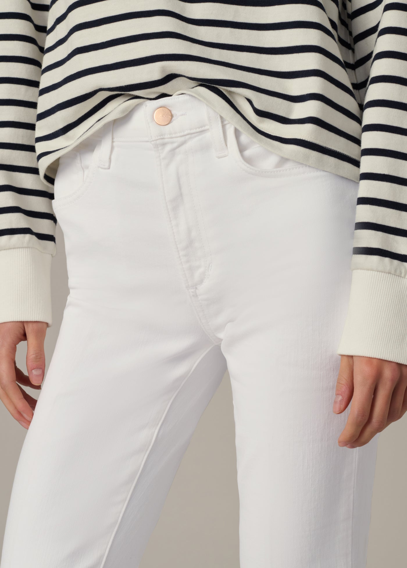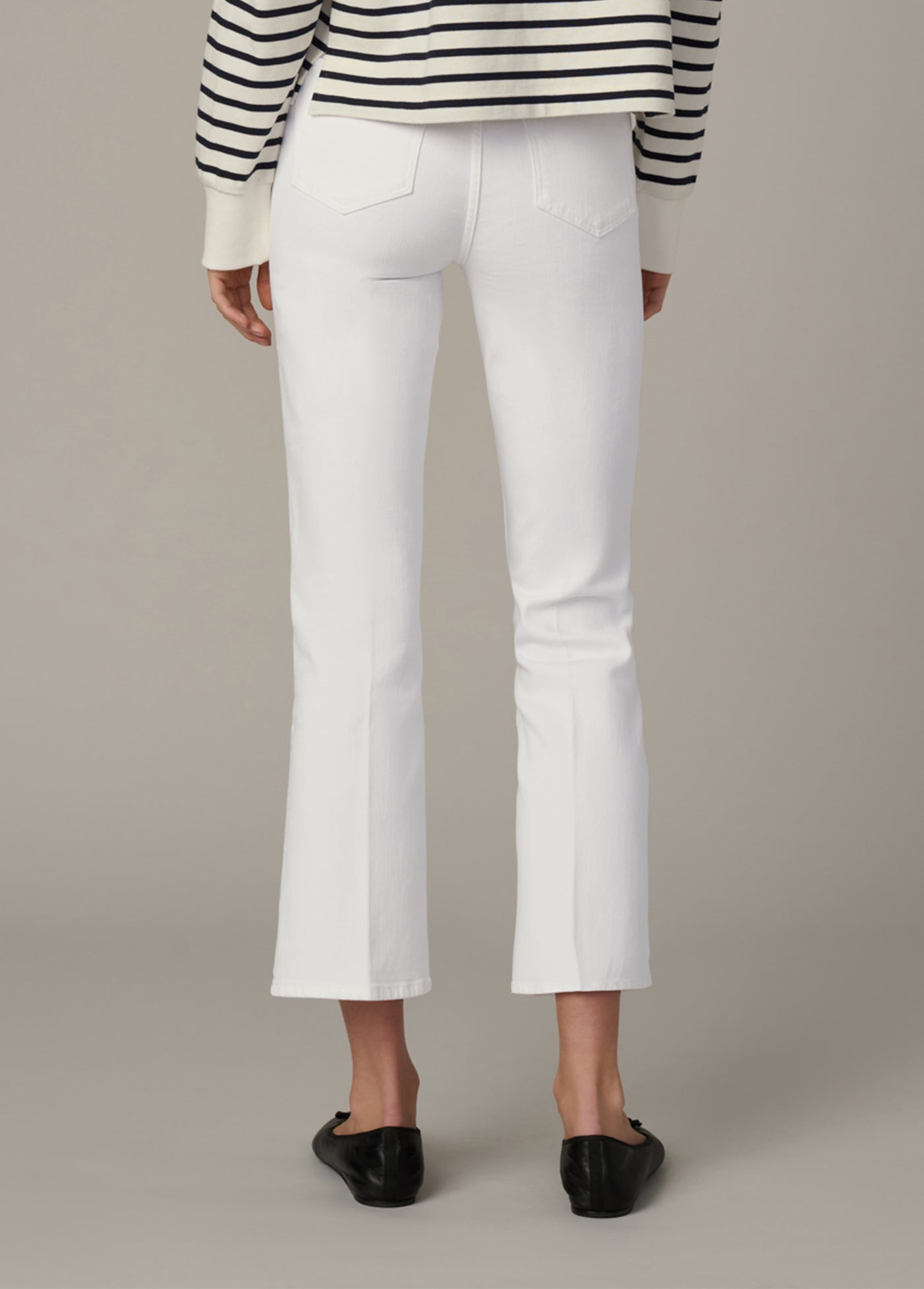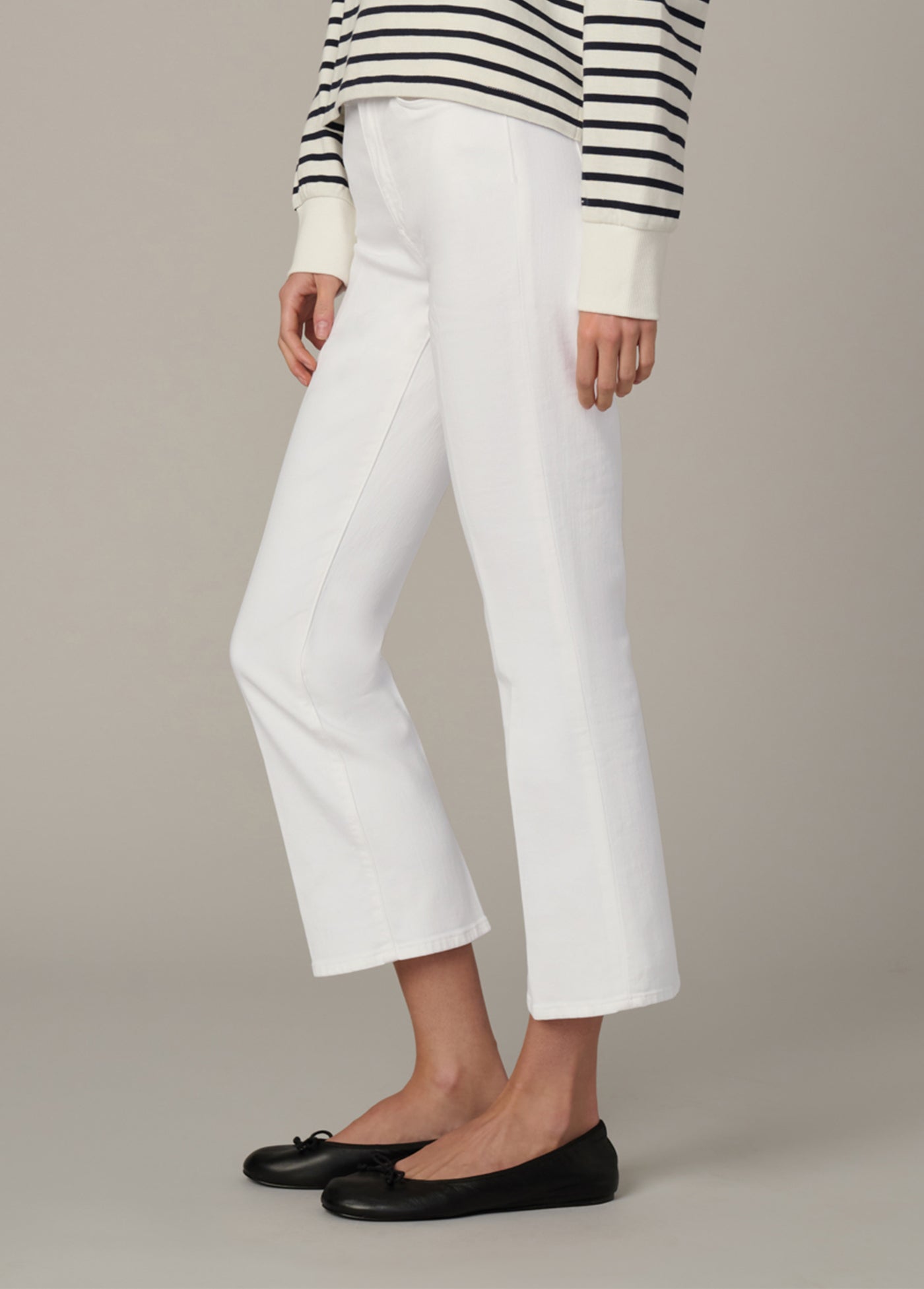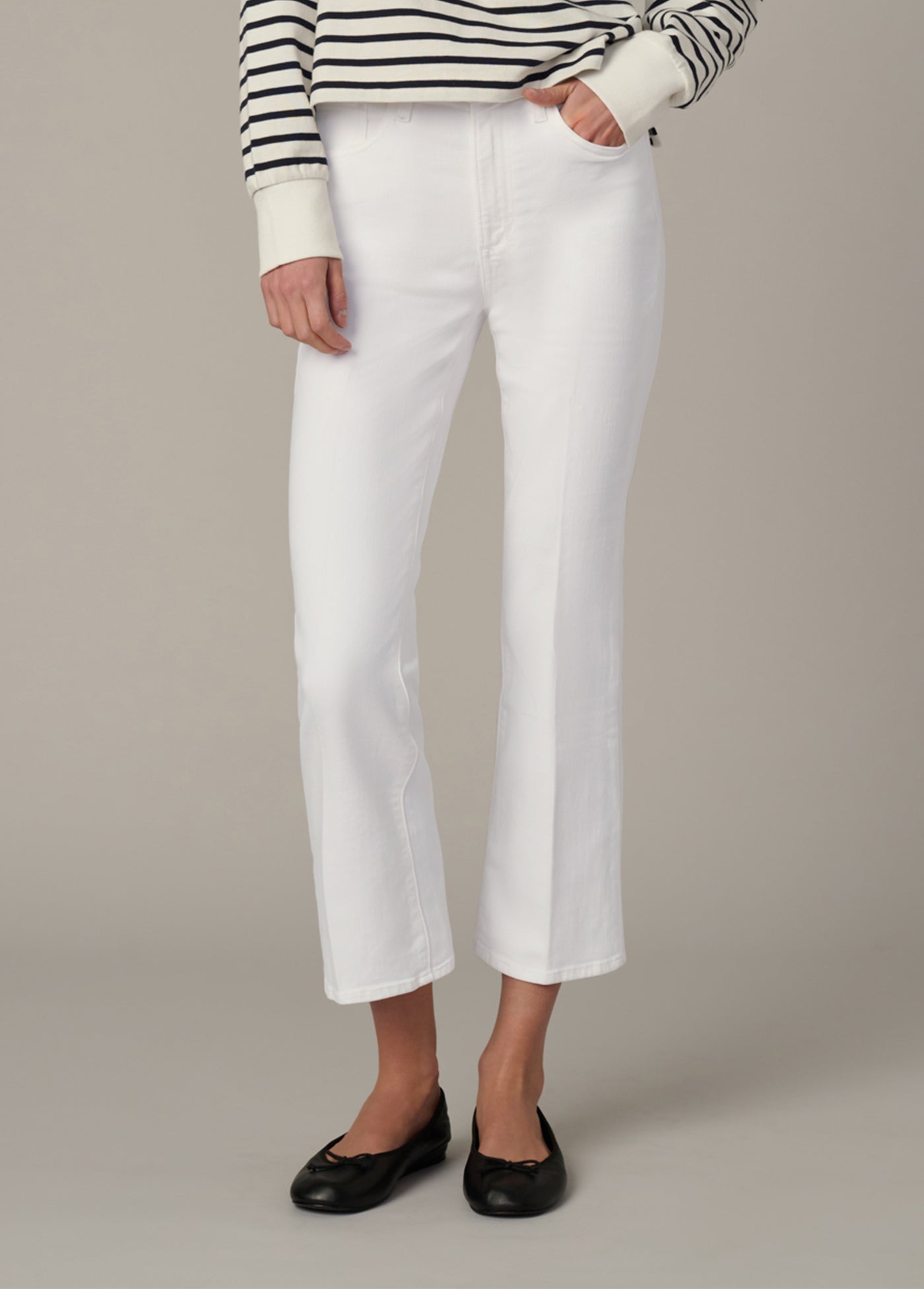 The Callie in 'White' is a high-rise cropped bootcut jean with the comfort and ease of stretch. The optic white wash and cropped length make the Callie the perfect warm weather companion.