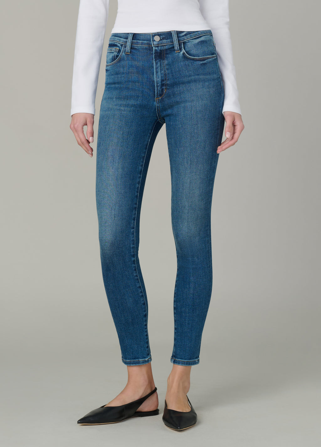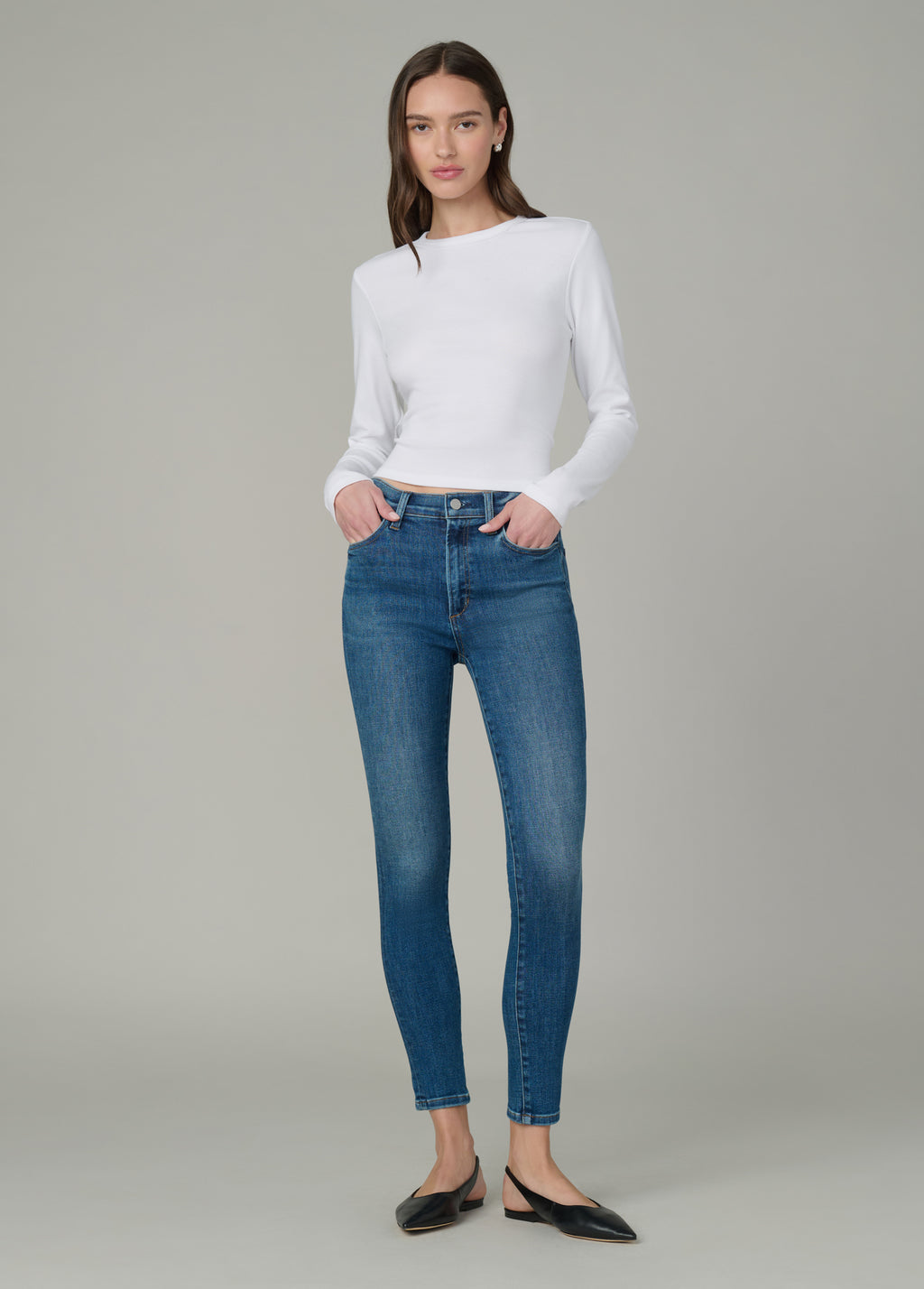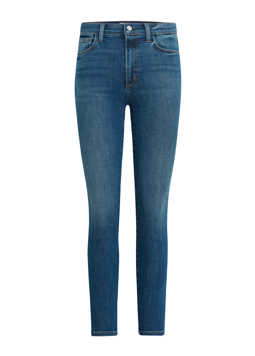 A high rise, skinny fit that hugs the body with an ankle-length leg.
