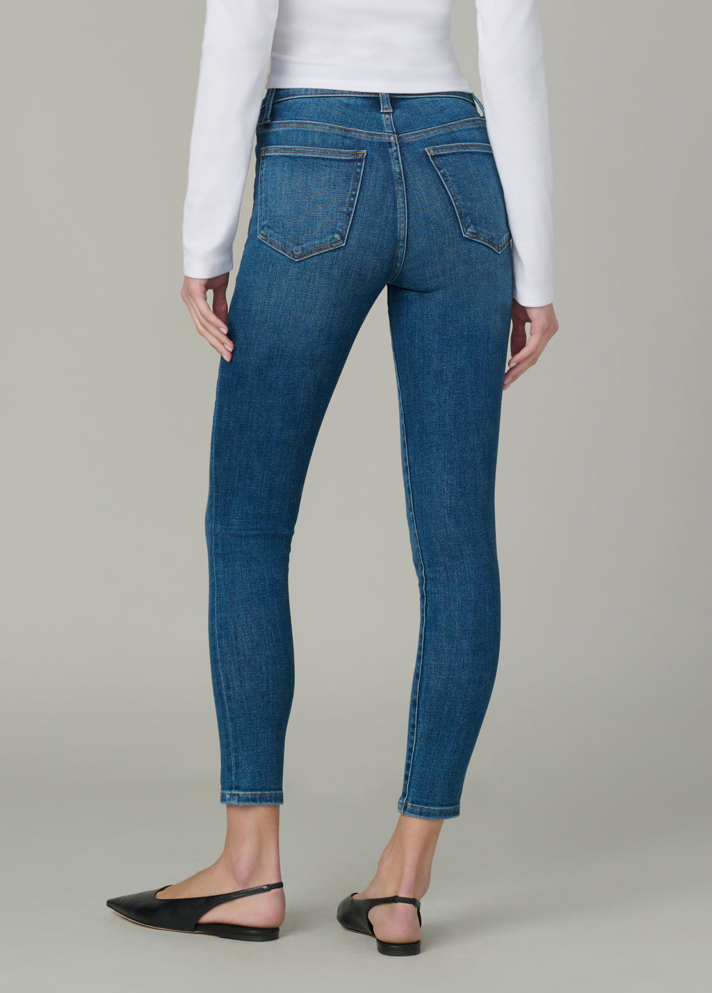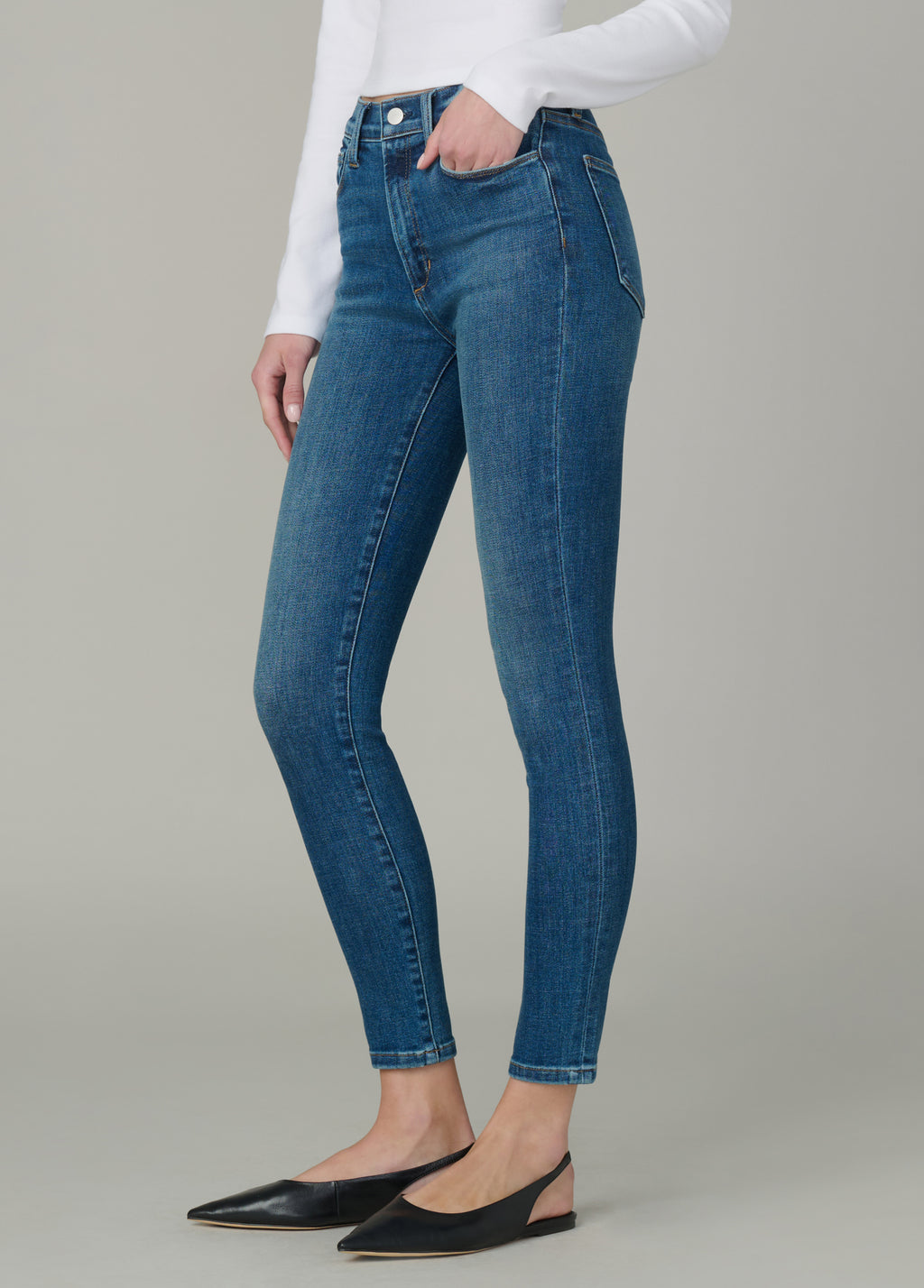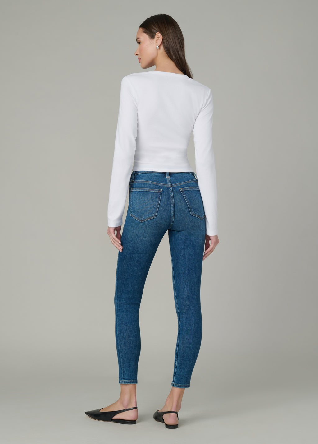 A high rise, skinny fit that hugs the body with an ankle-length leg.