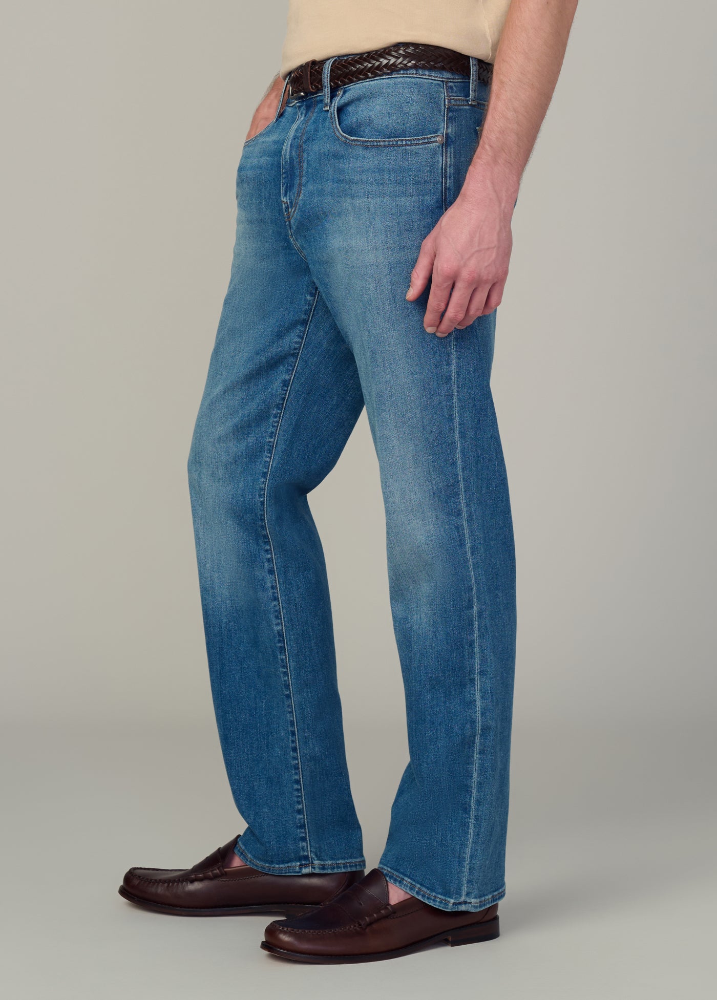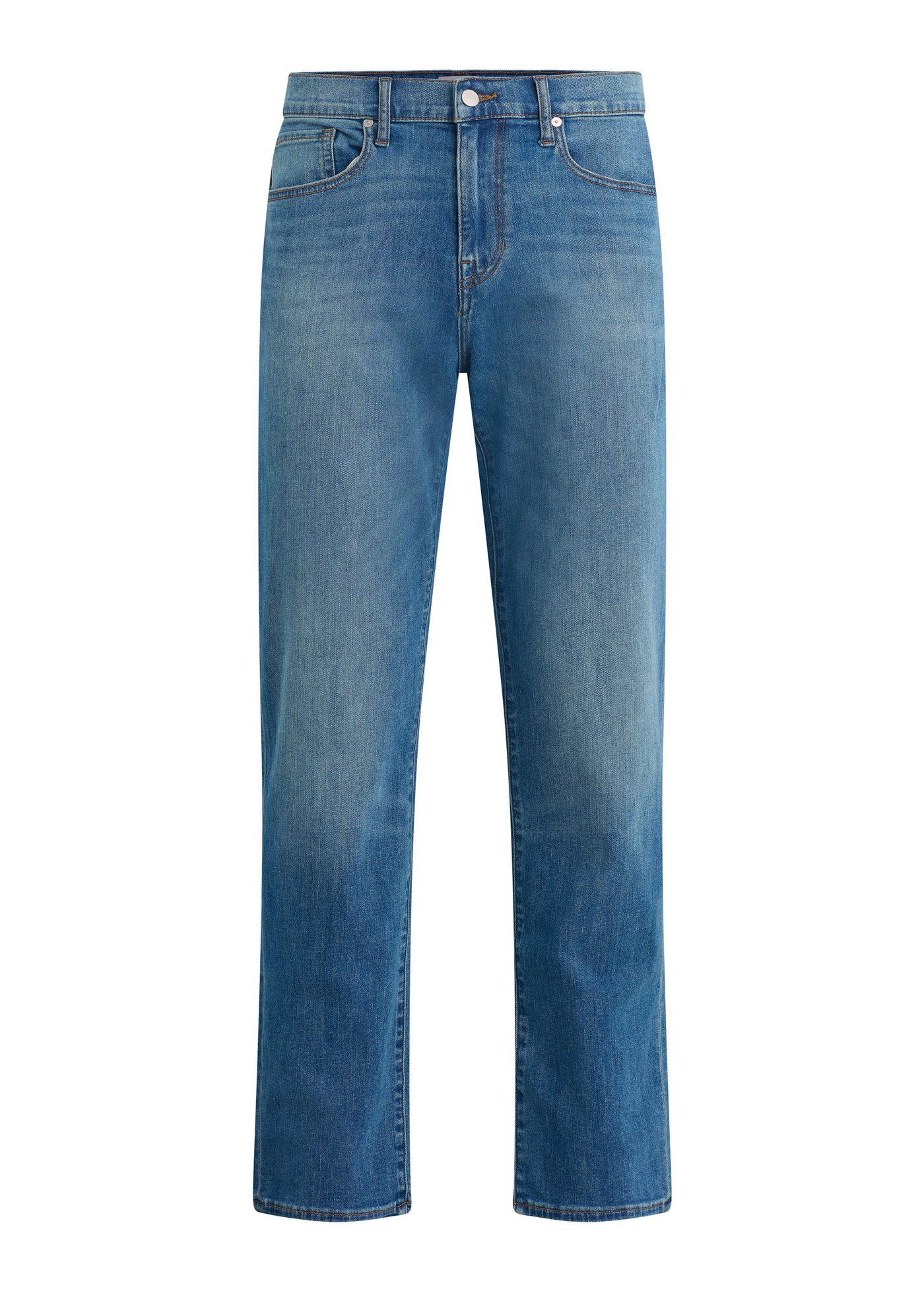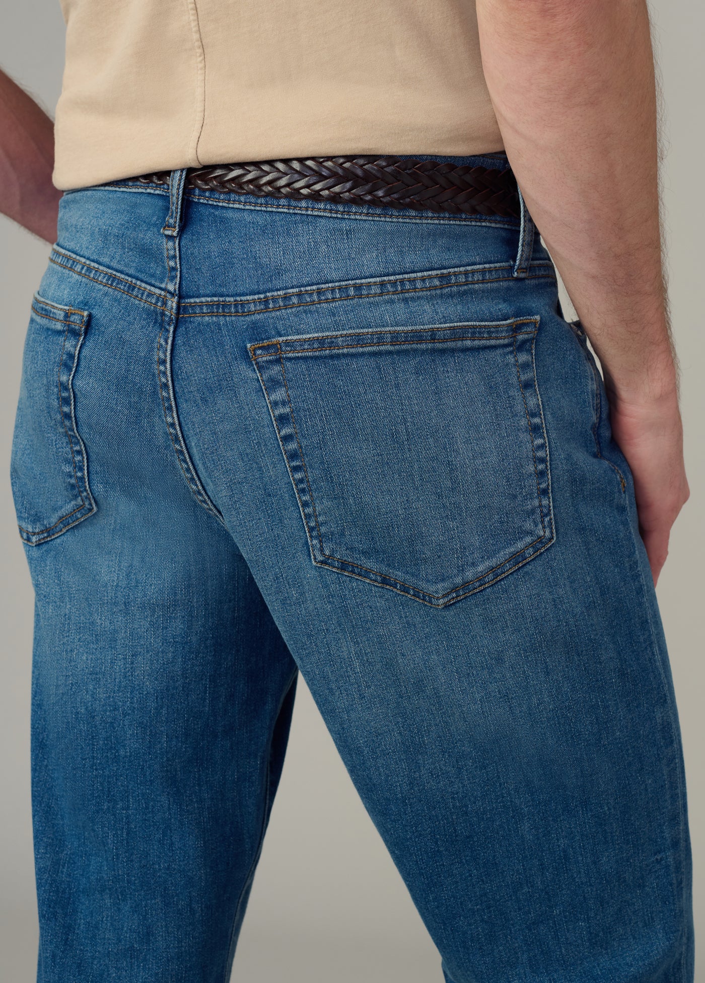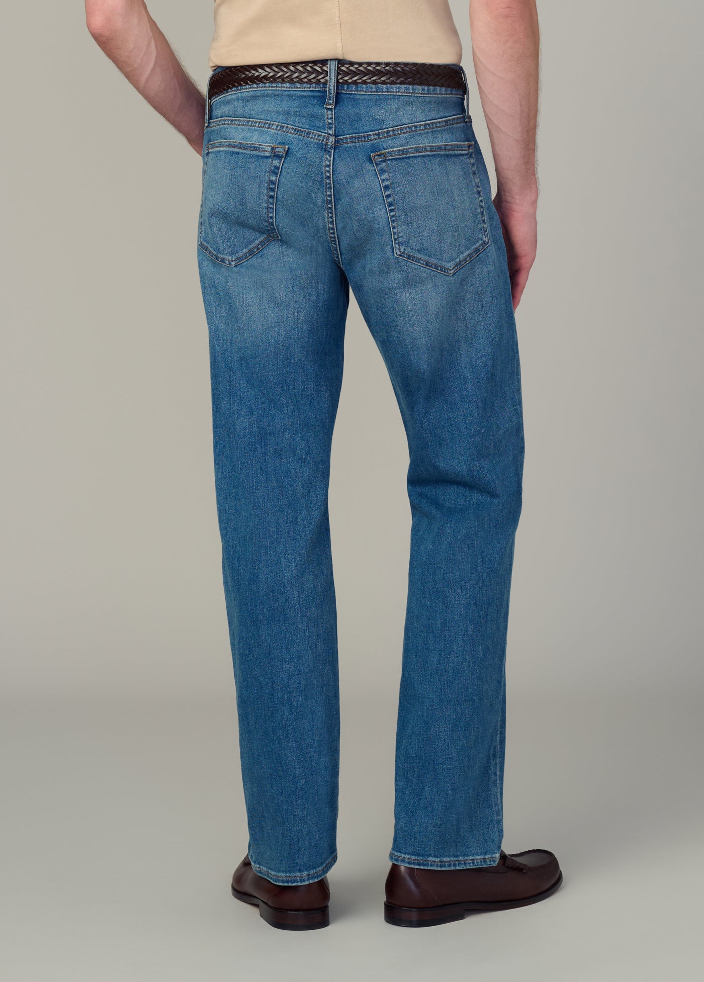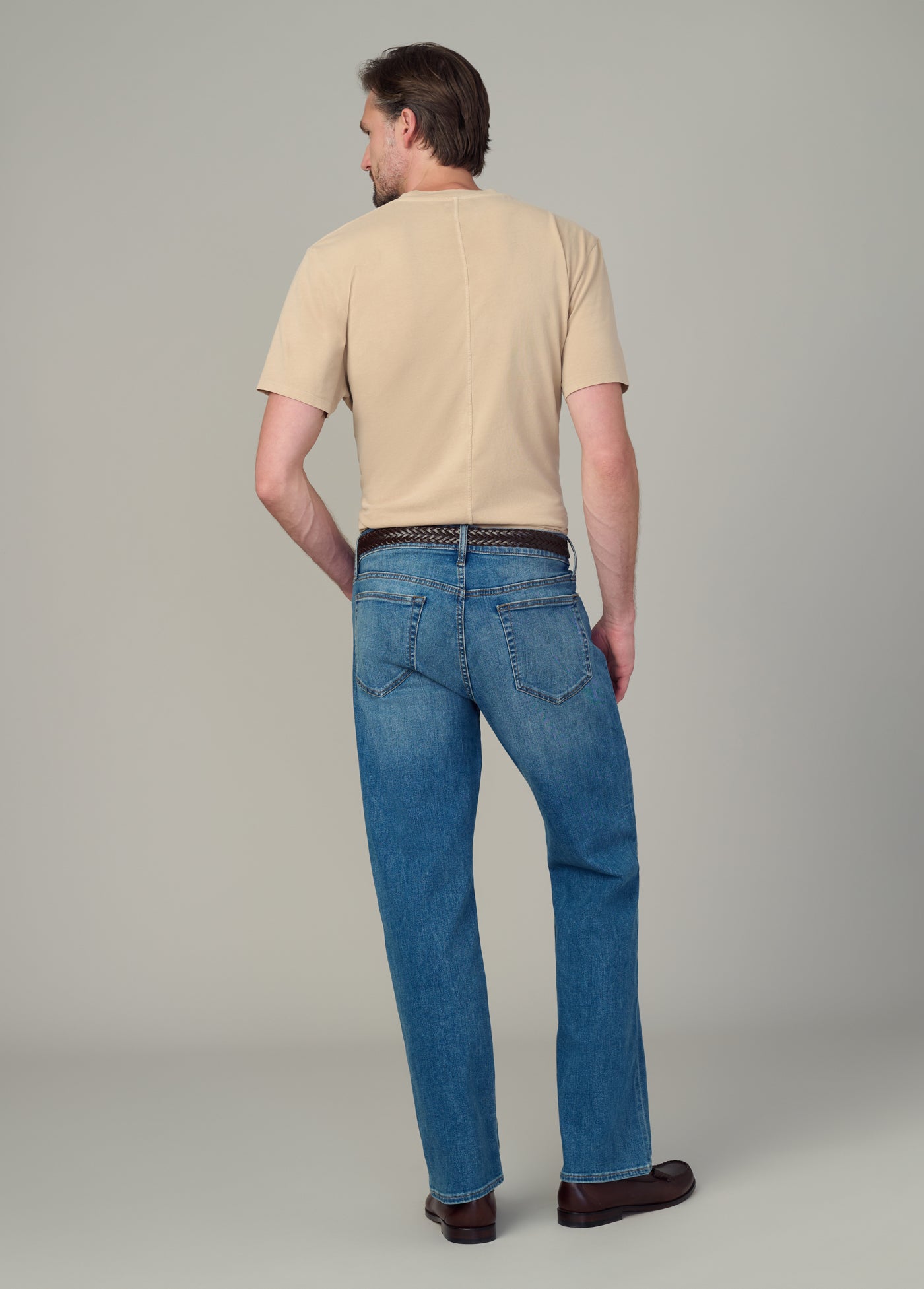 An easy fit from hip to ankle with a mid rise and straight leg opening.
