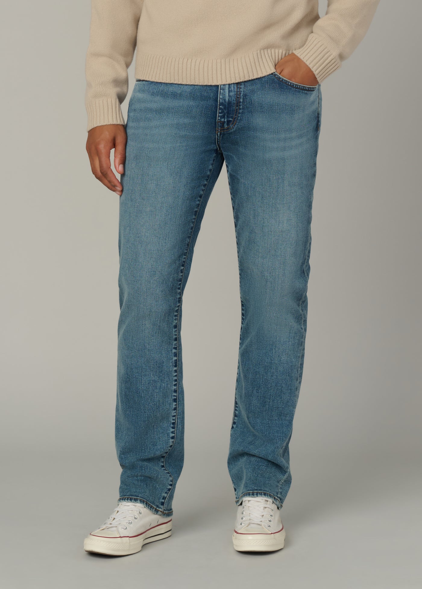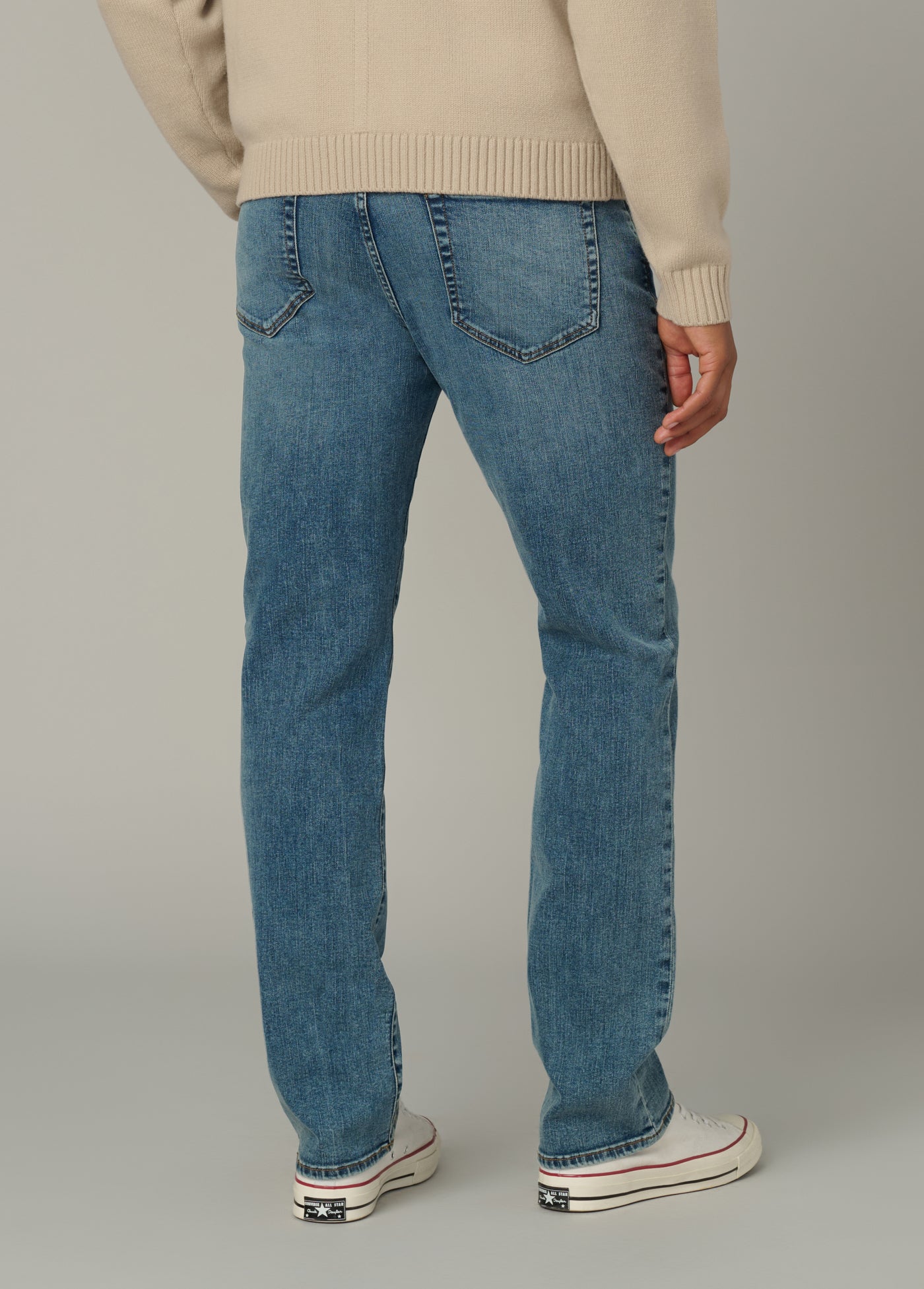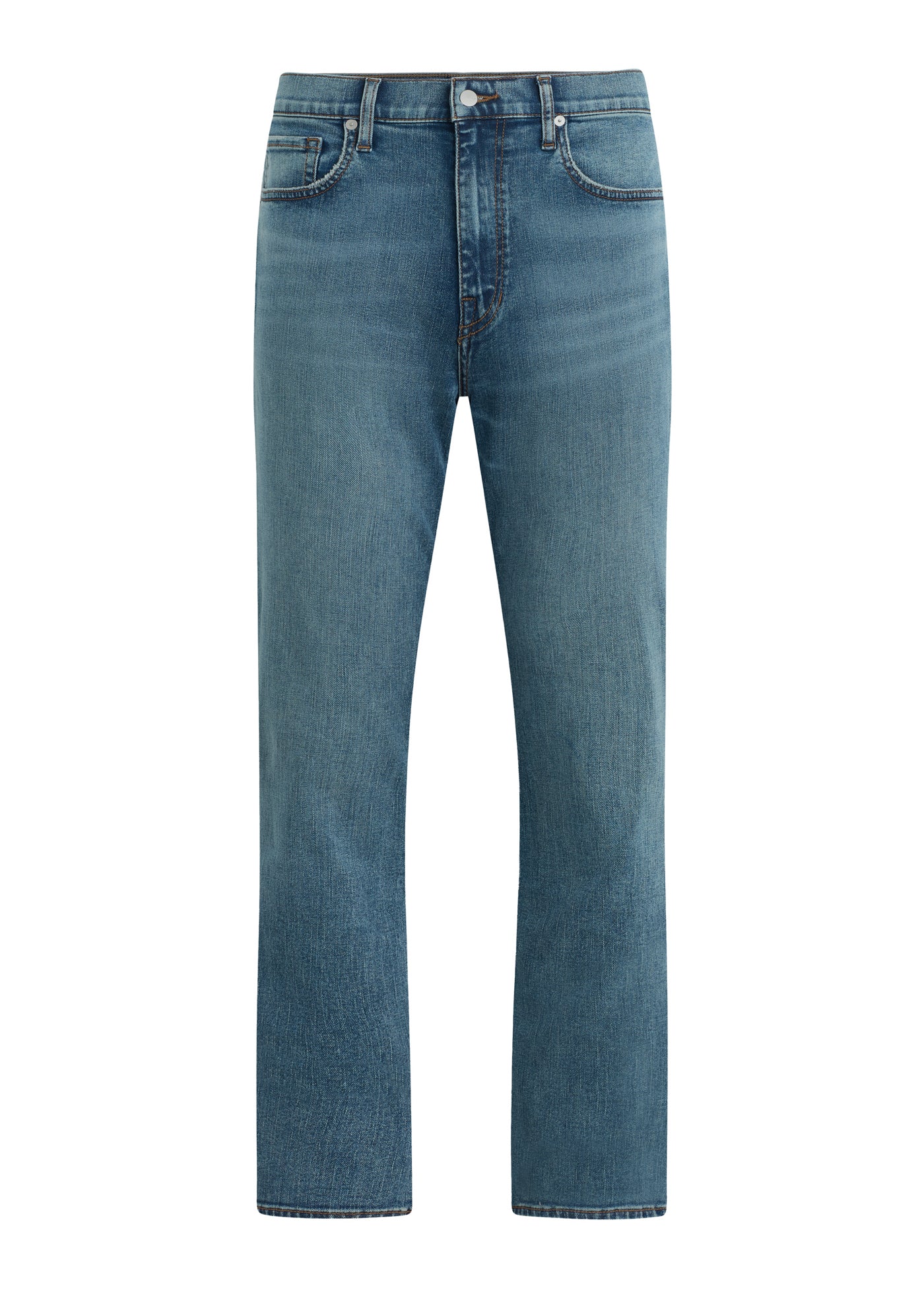An easy fit from hip to ankle with a mid rise and straight leg opening.