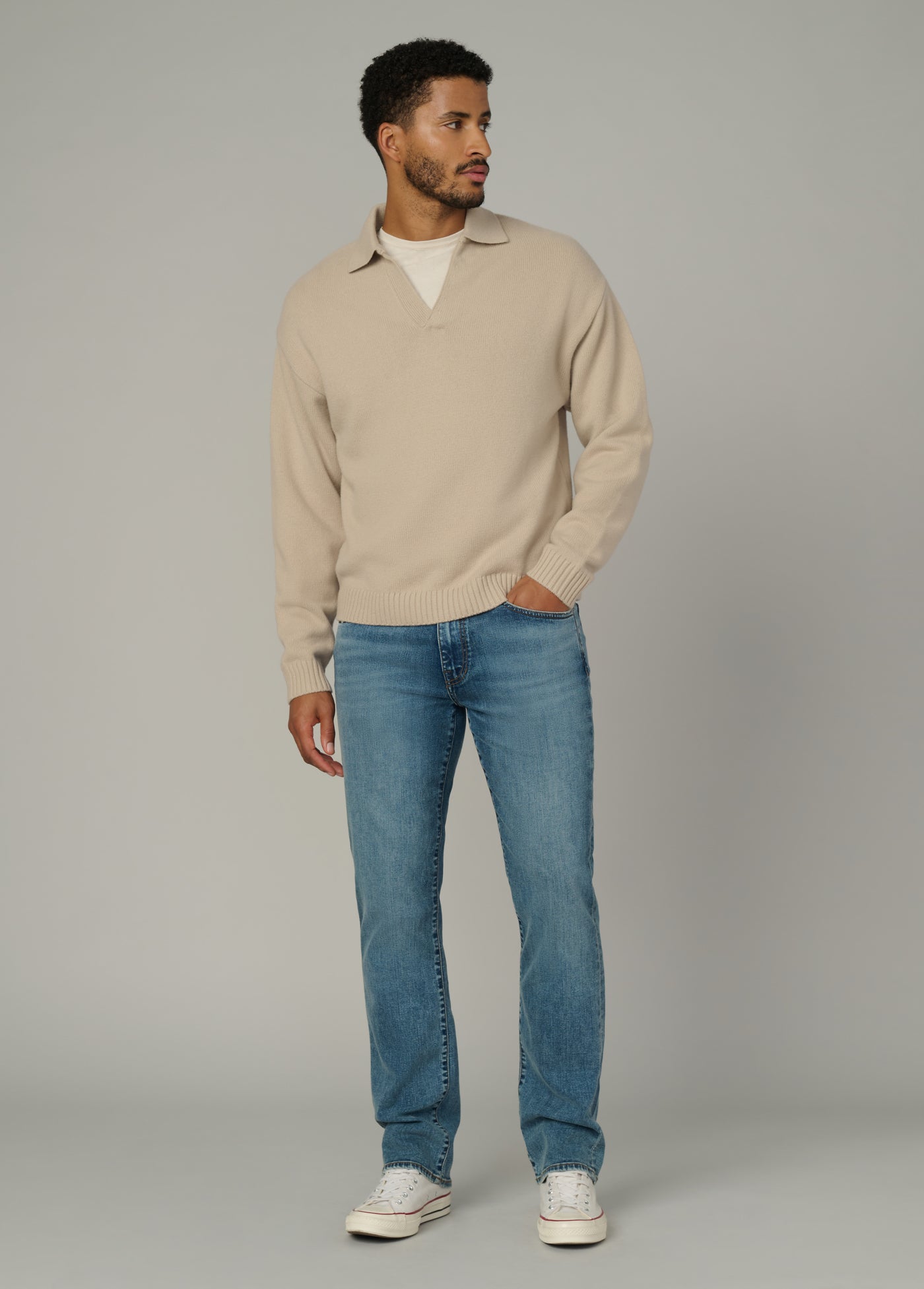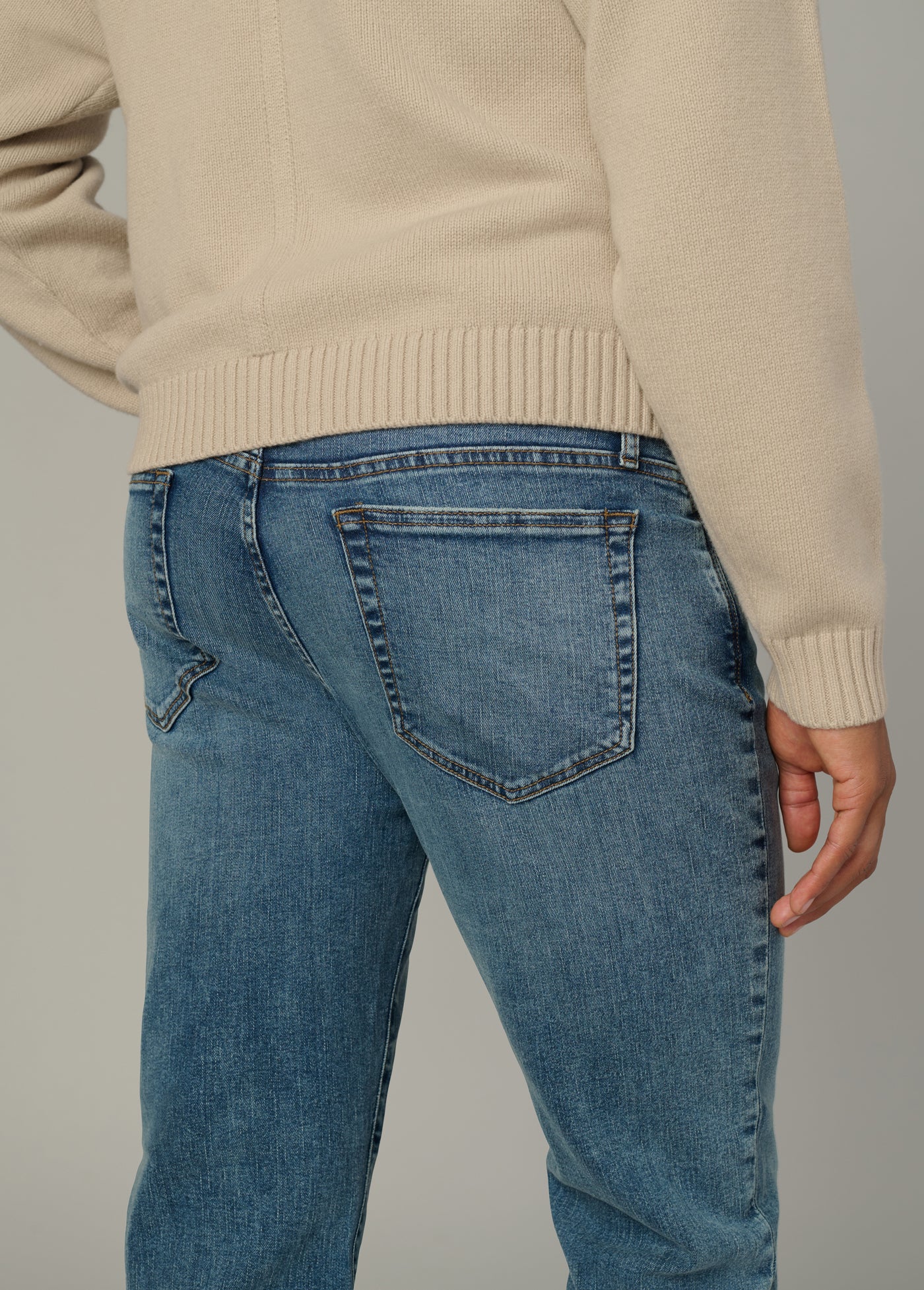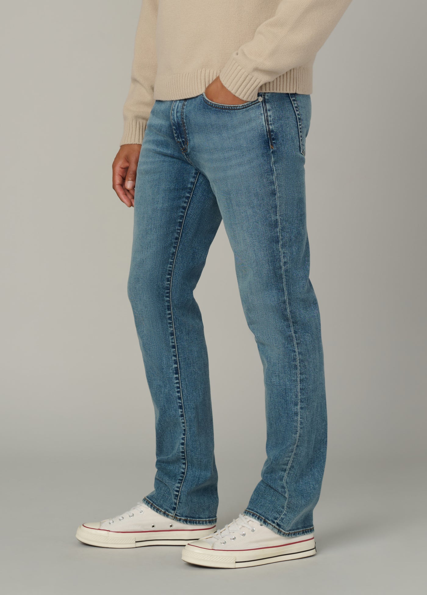 An easy fit from hip to ankle with a mid rise and straight leg opening.