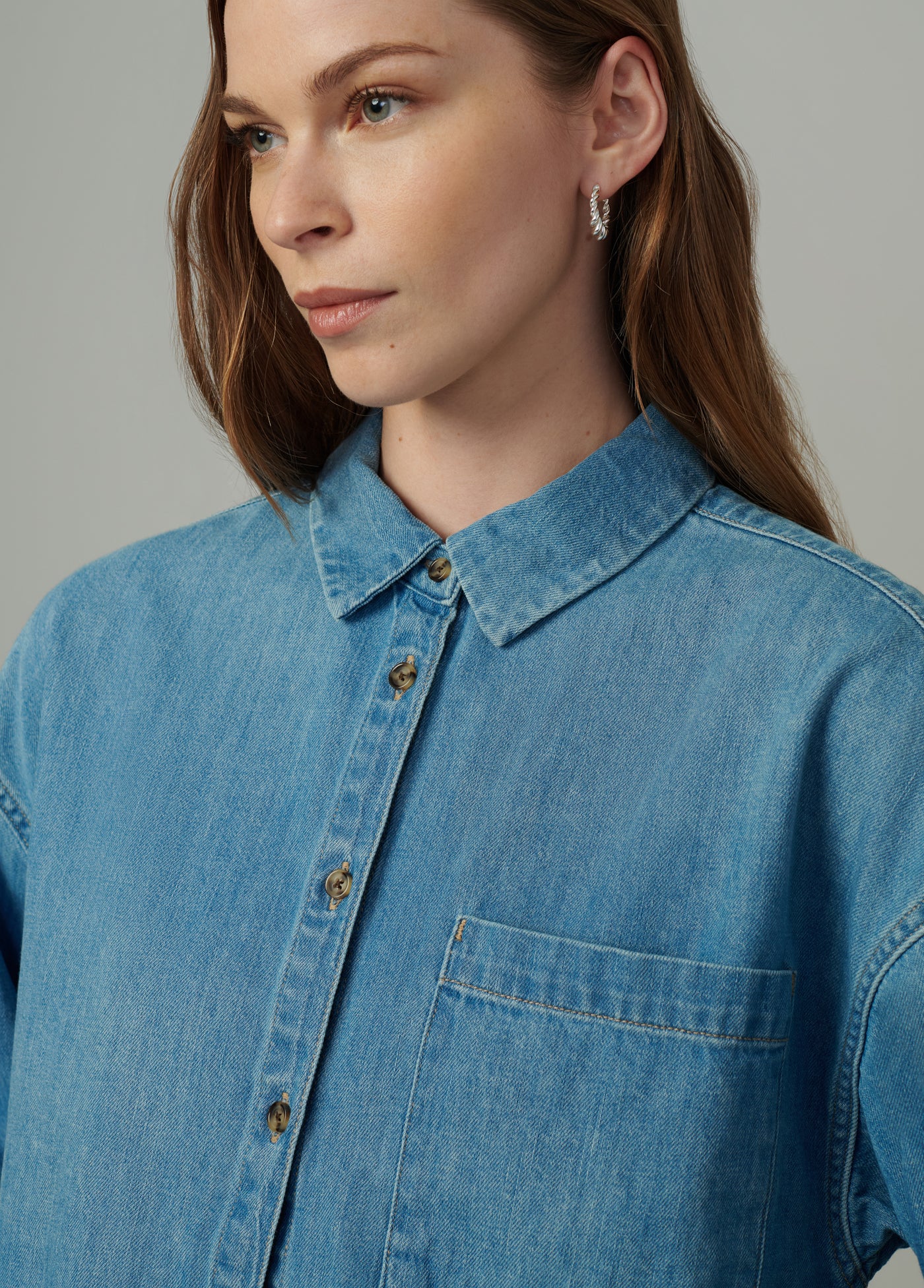 A boxy button-down shirt with a single patch pocket that falls to the hip.