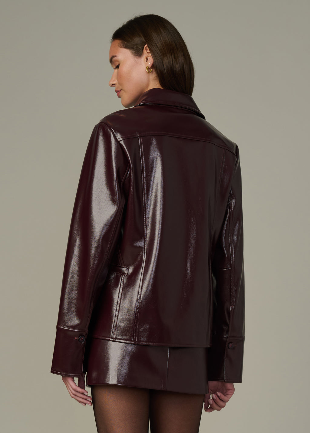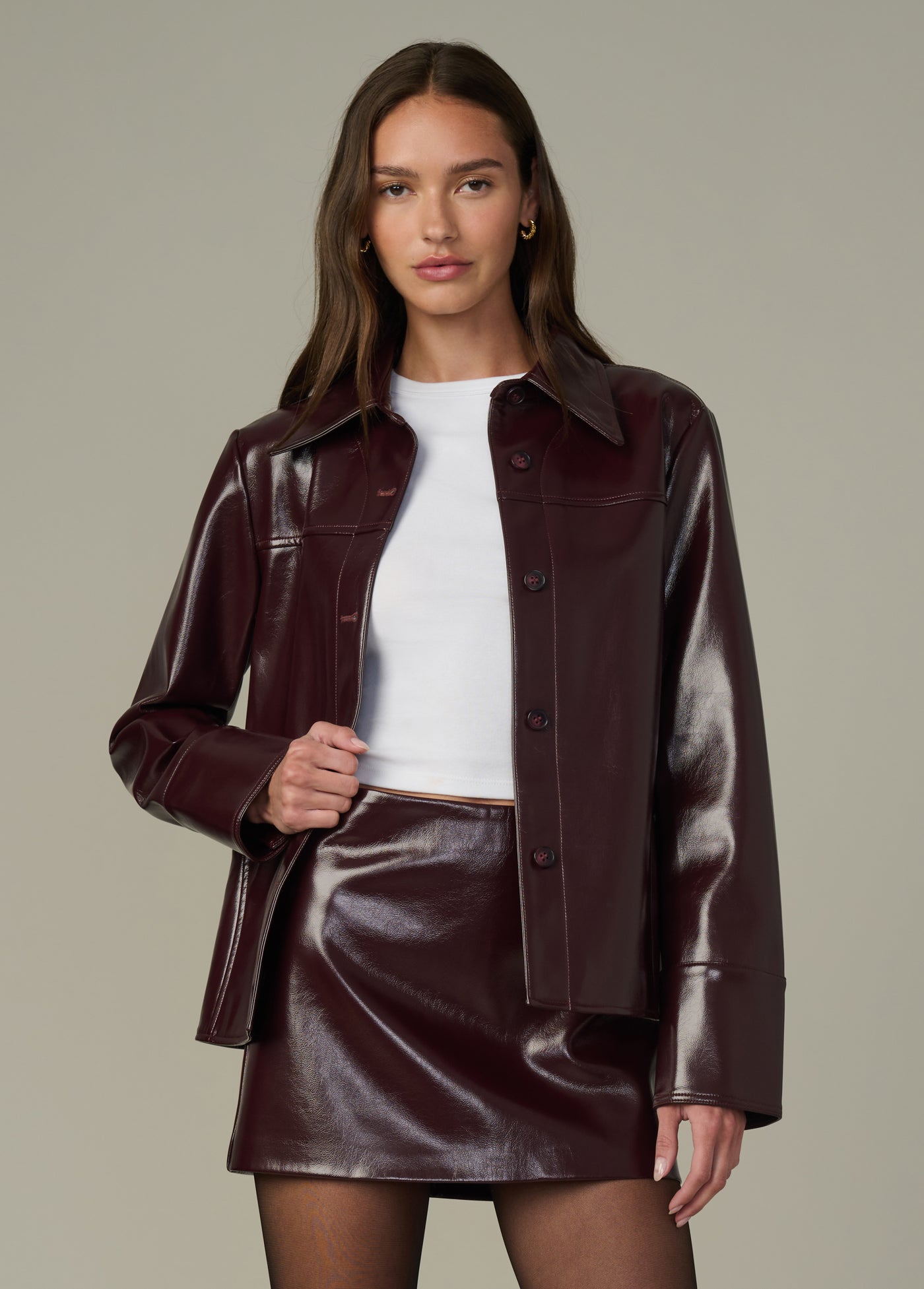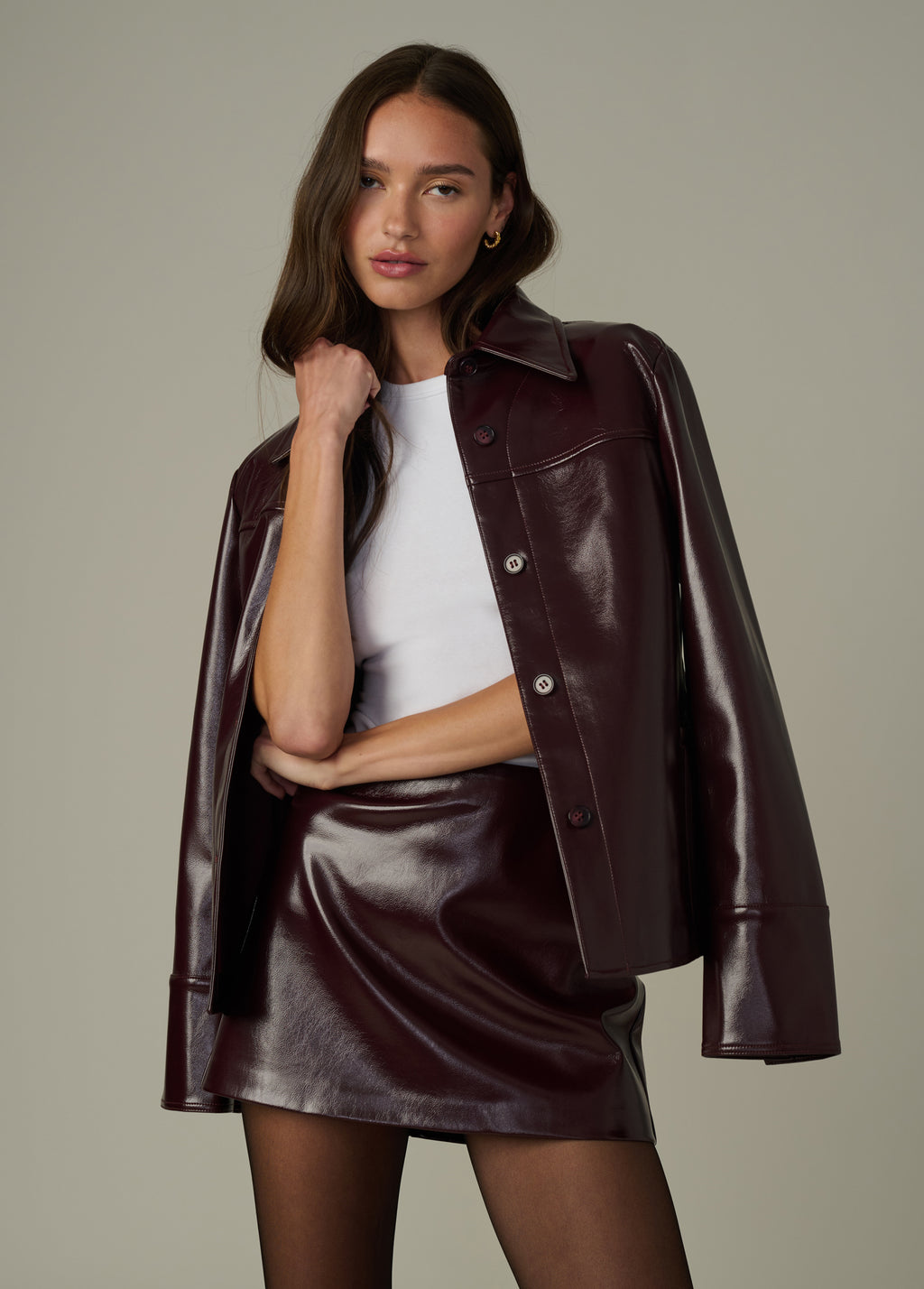 Our vegan leather updated with a luxe patent finish with high shine in a deep burgundy color with warm undertones.