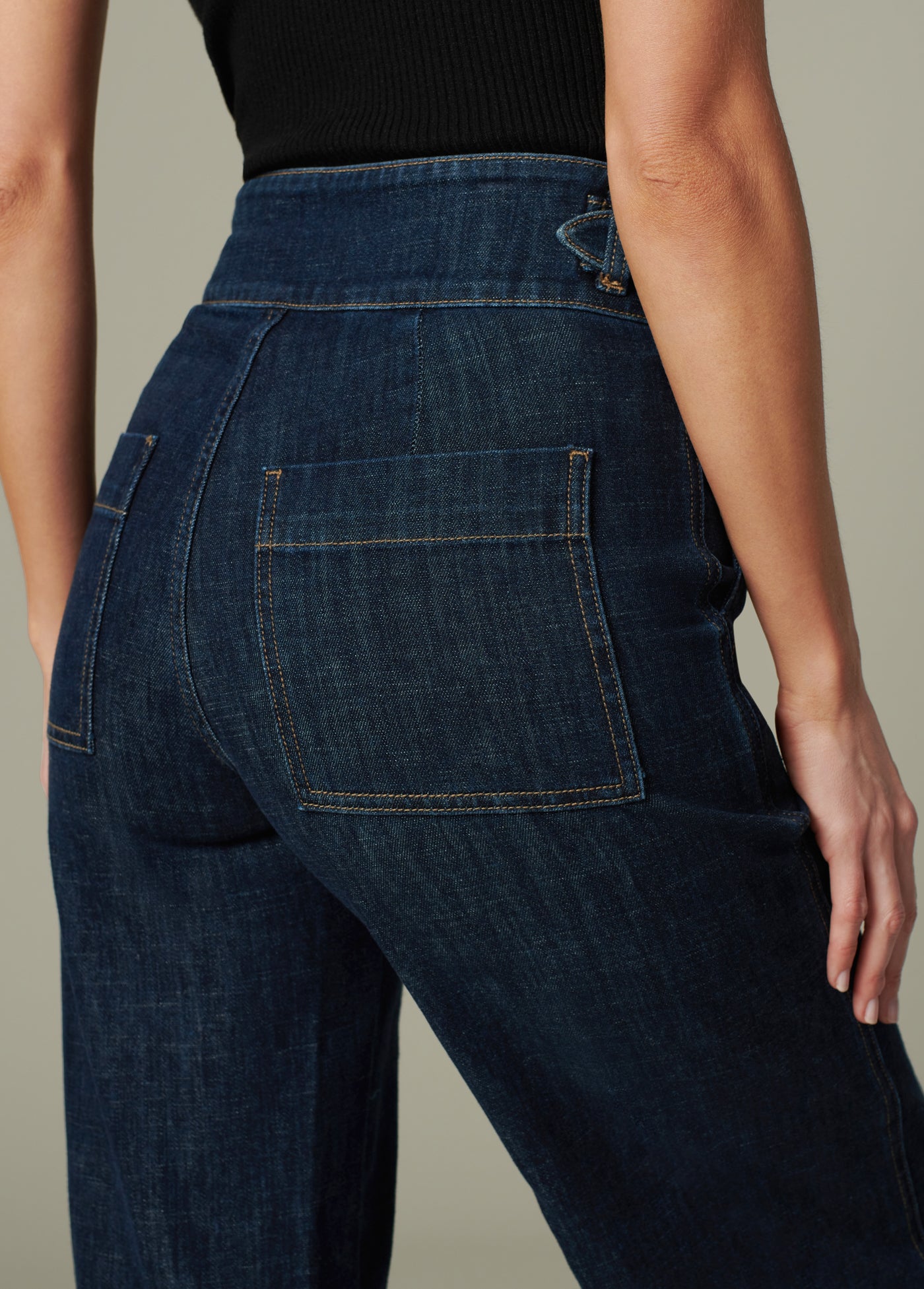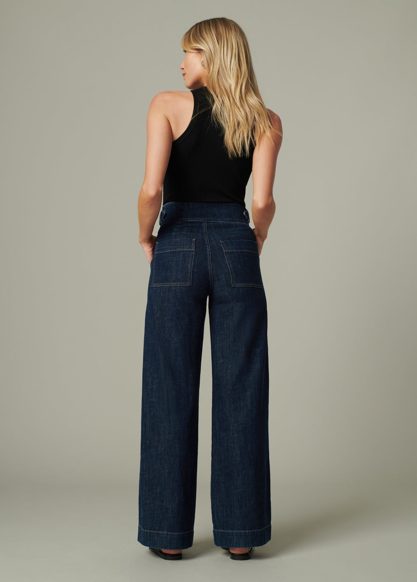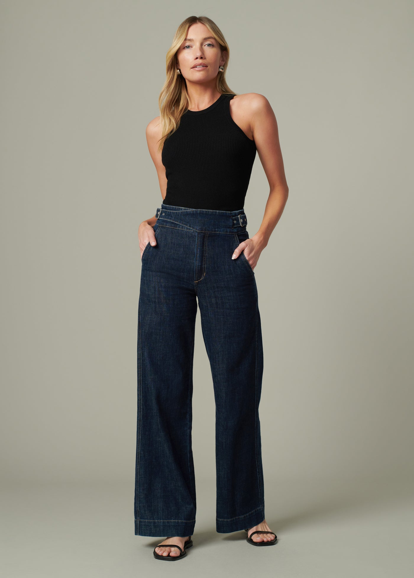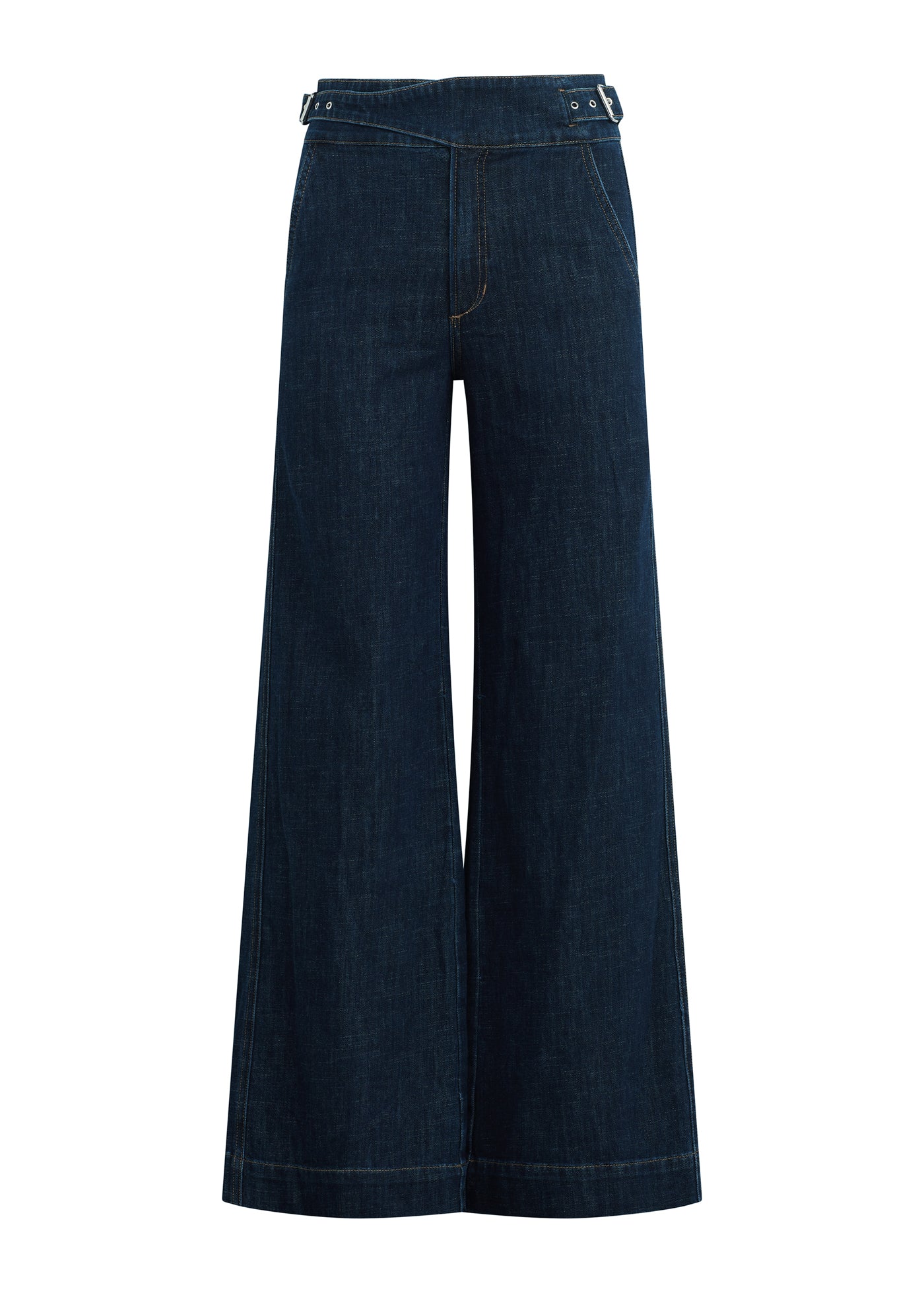 The super high rise and wide waistband of the new Double Buckle Wide Leg Sailor Pant create a defining and leg-lengthening silhouette. Cast in Out Of Control--a dark clean wash with a soft touch, these jeans are finished with a wrap-effect buckle at the waist and wide hems in our lightweight, warm weather Weightless fabric.
