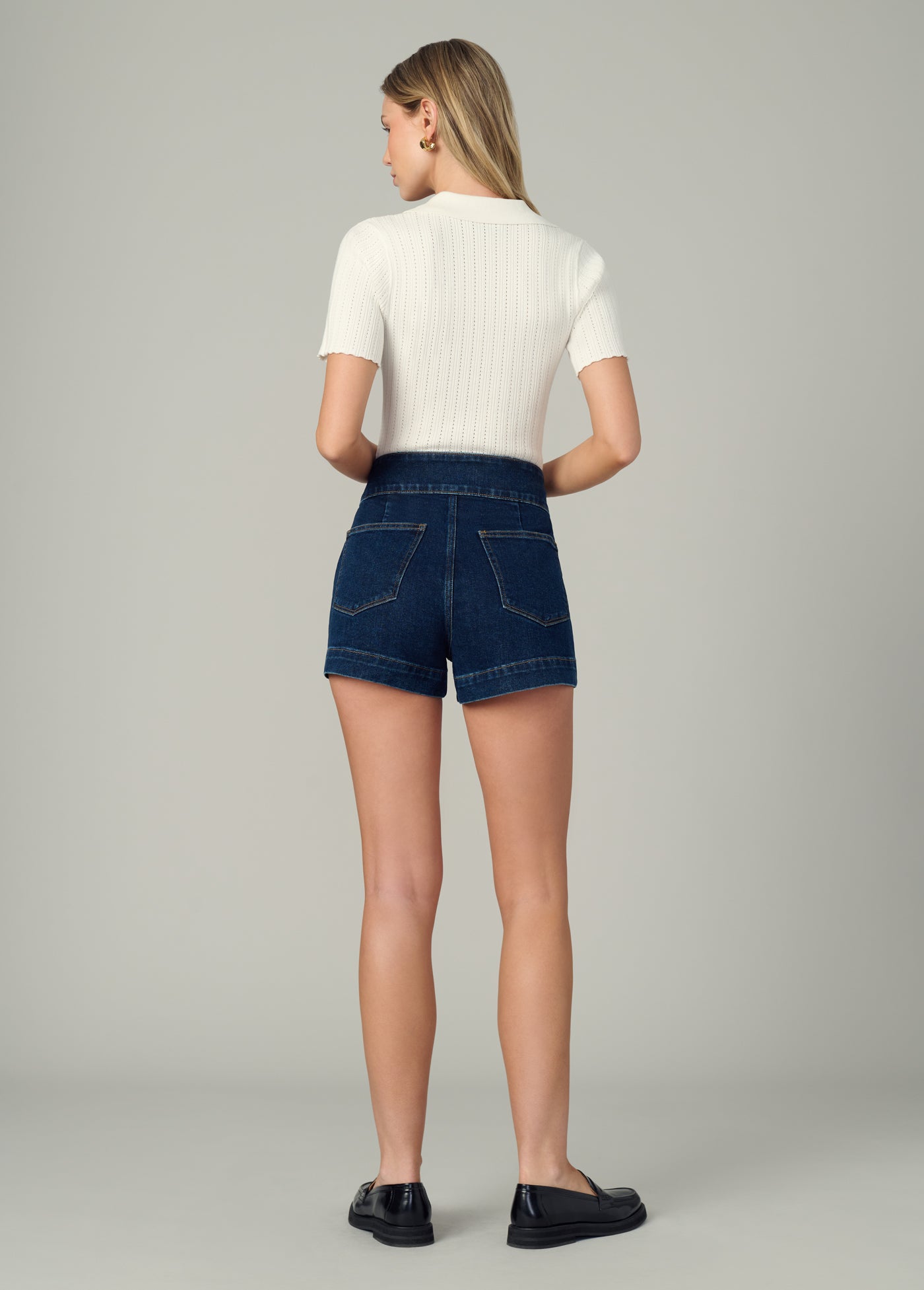 A high rise short with front flap pockets finished with novelty gold buttons.