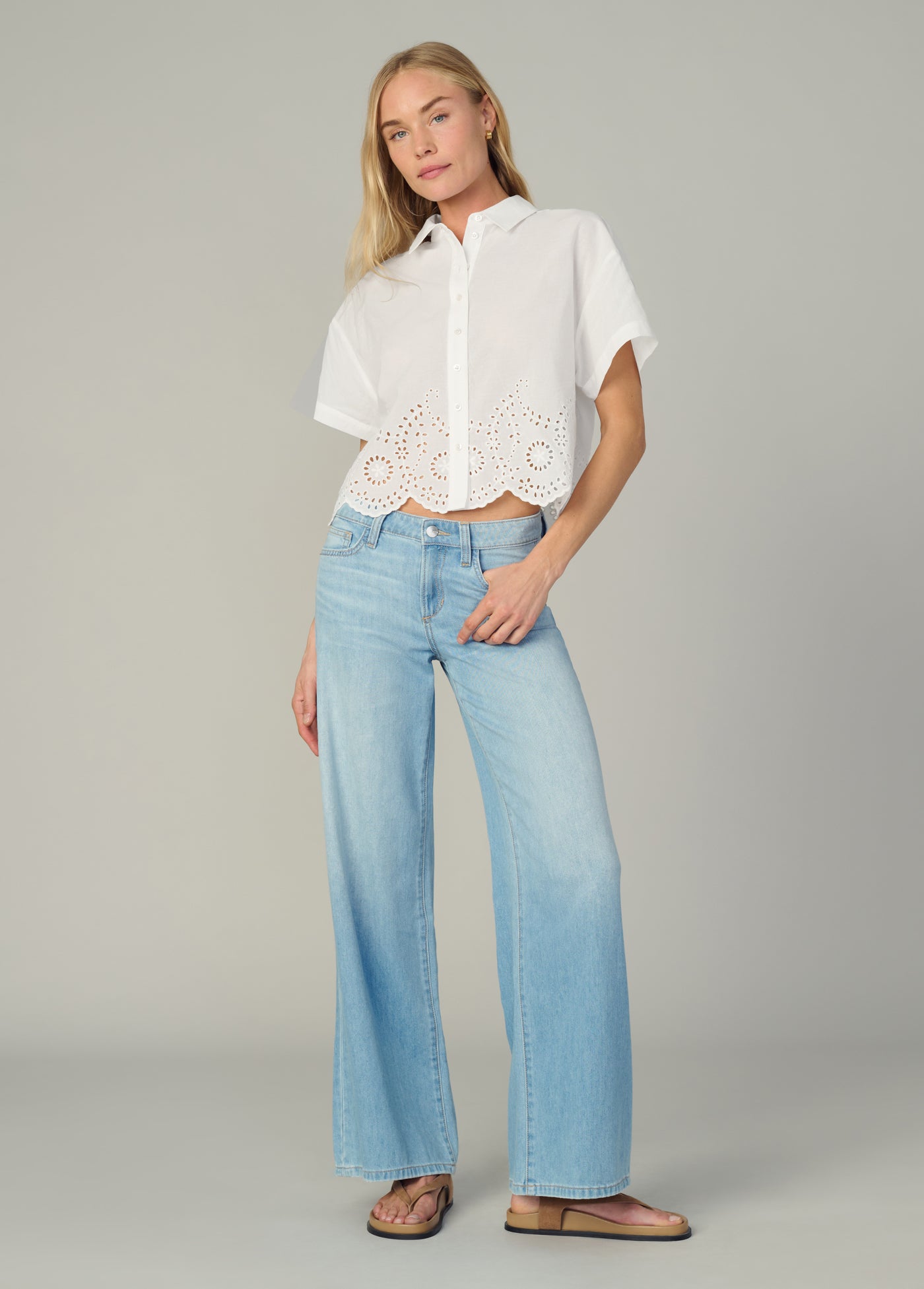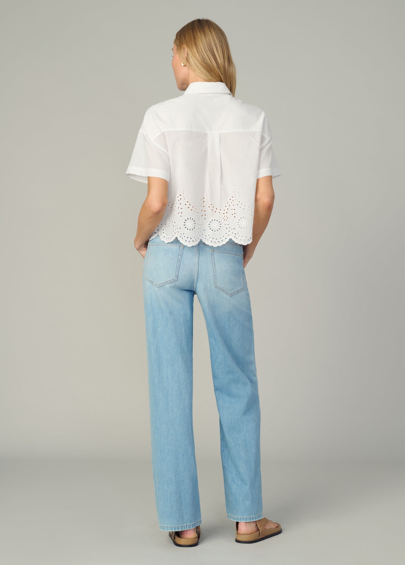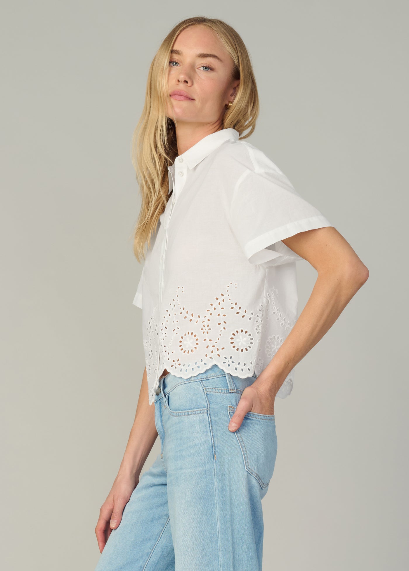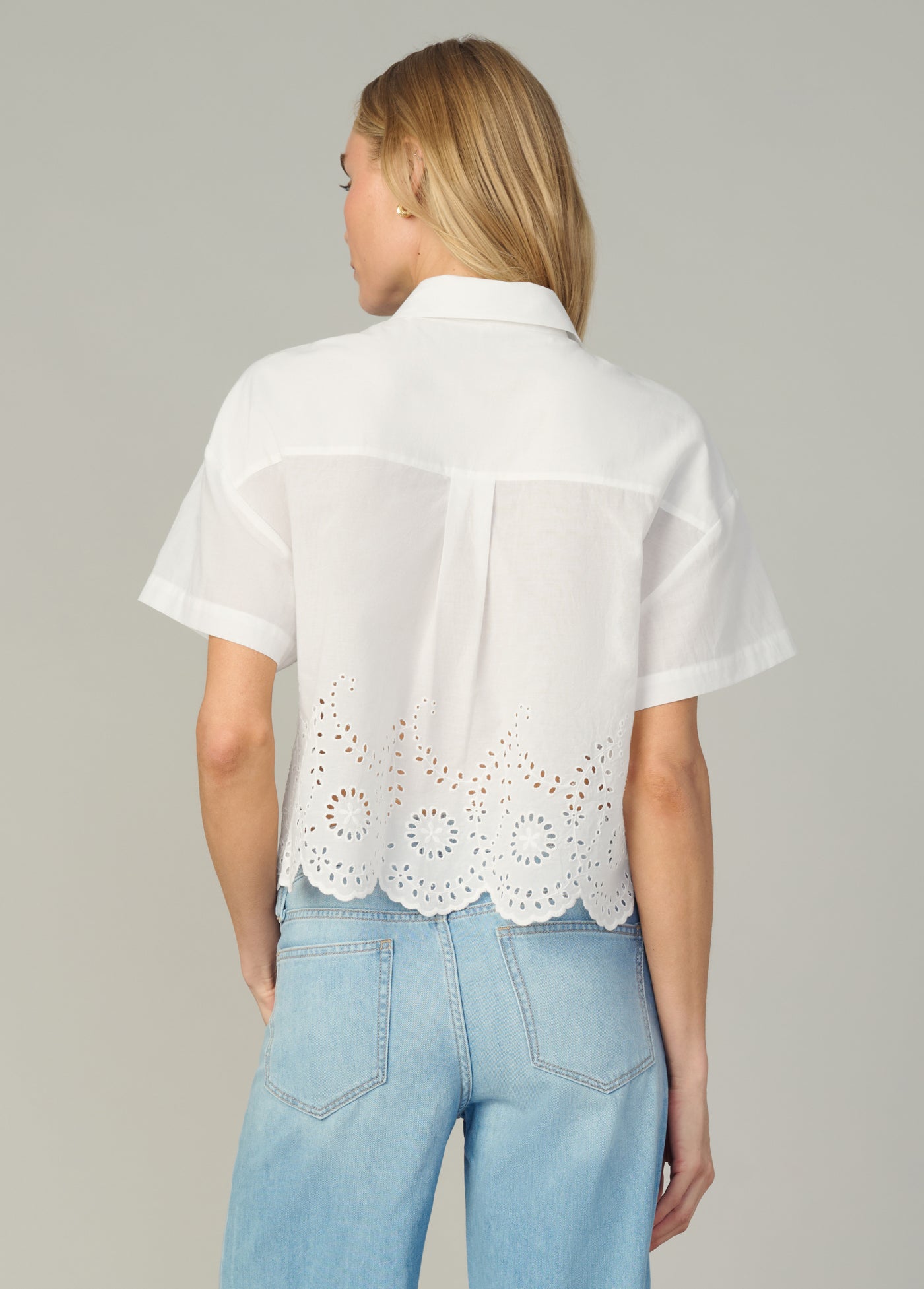 A classic short sleeve button down with a femme scalloped eyelet hem finish.