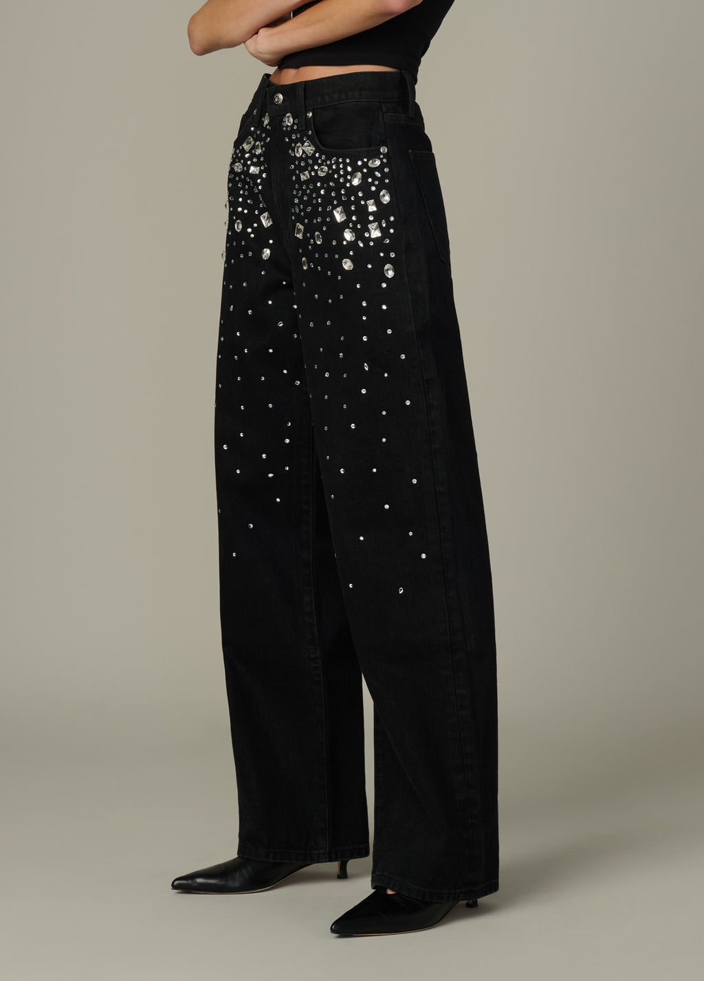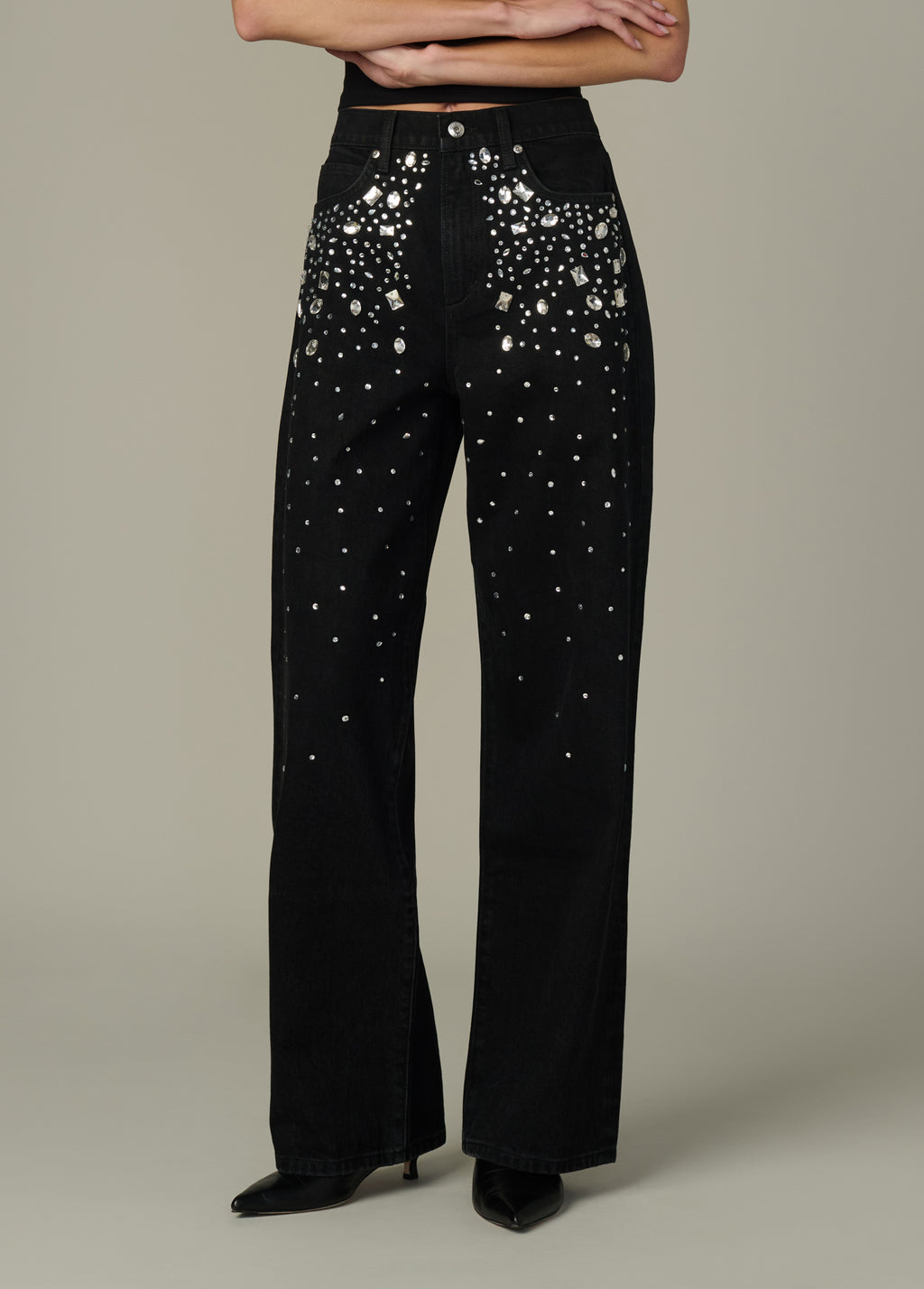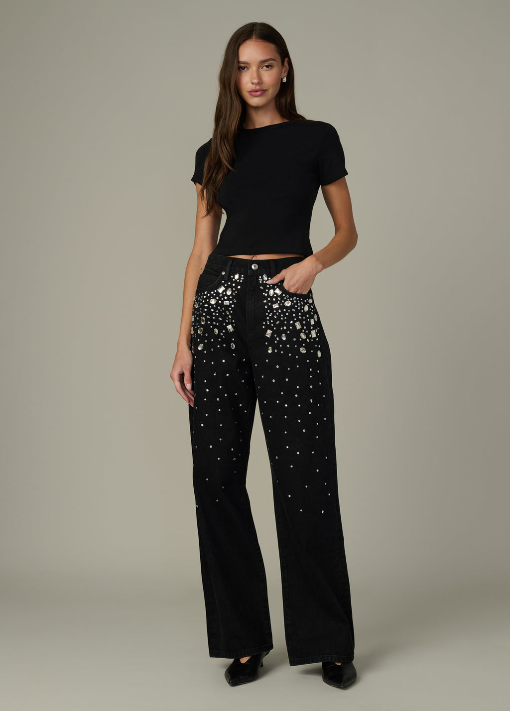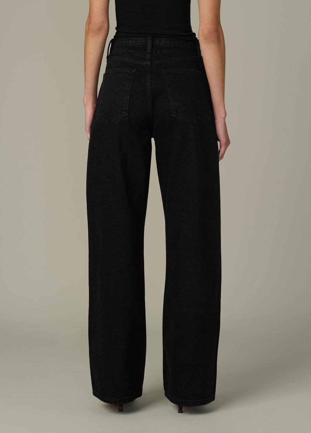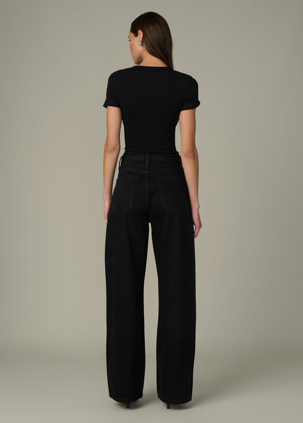 A high rise that sits at the natural waist with a relaxed seat, roomy hip and thigh, and full-length wide leg.