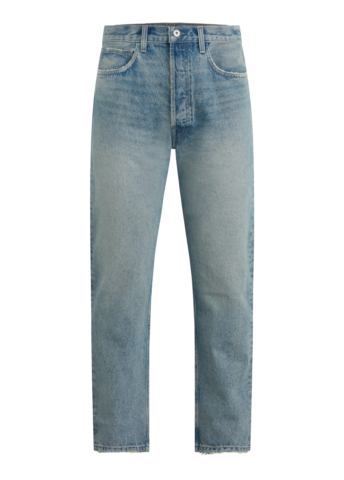 A relaxed fit at the waist and hip with a straight leg opening and shortened inseam.