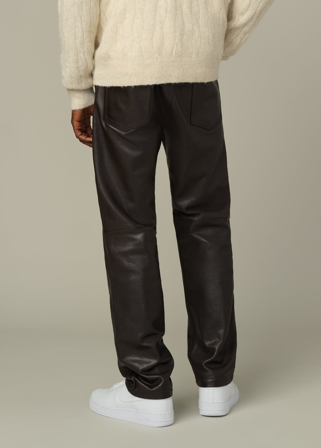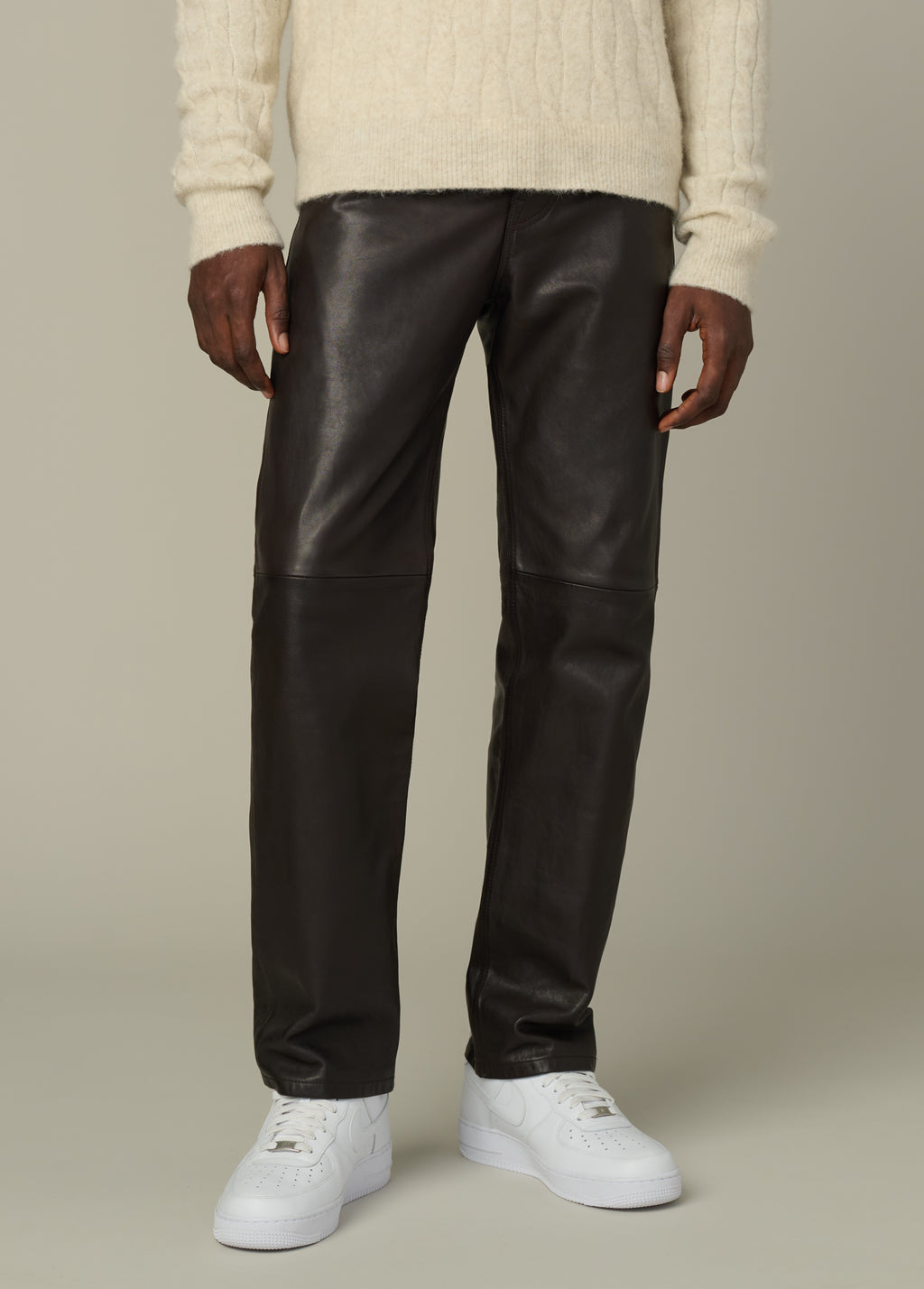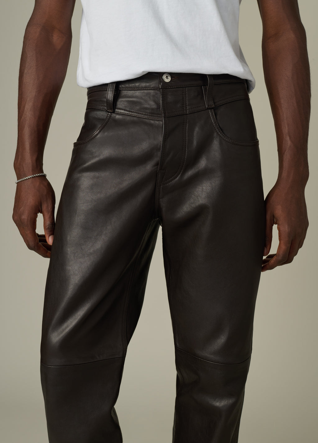 A relaxed fit at the waist and hip with a straight leg opening and shortened inseam upgraded in 100% lamb leather.