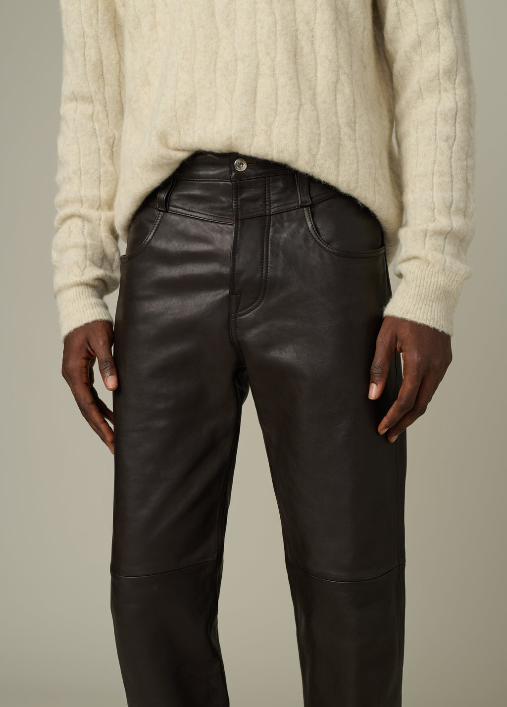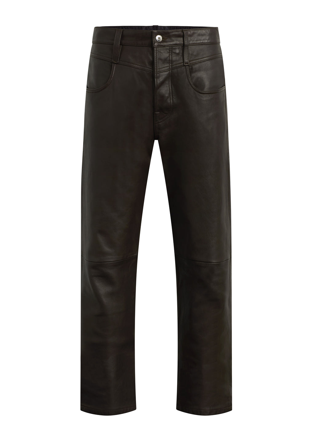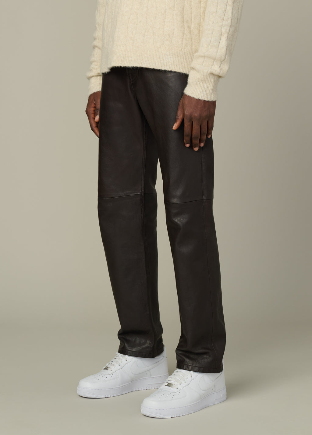 A relaxed fit at the waist and hip with a straight leg opening and shortened inseam upgraded in 100% lamb leather.