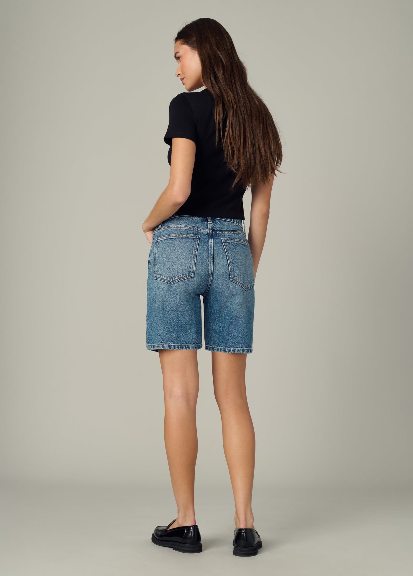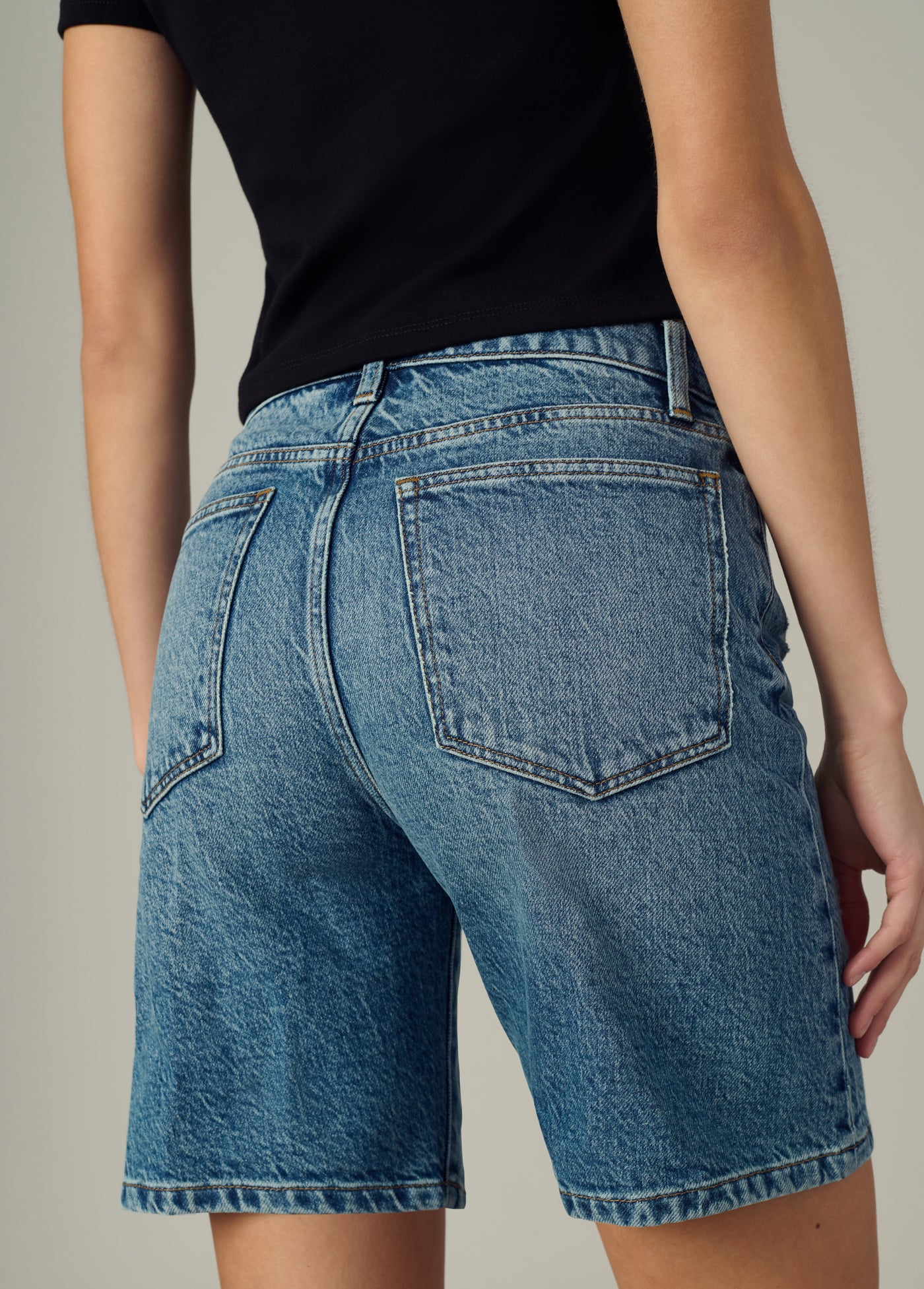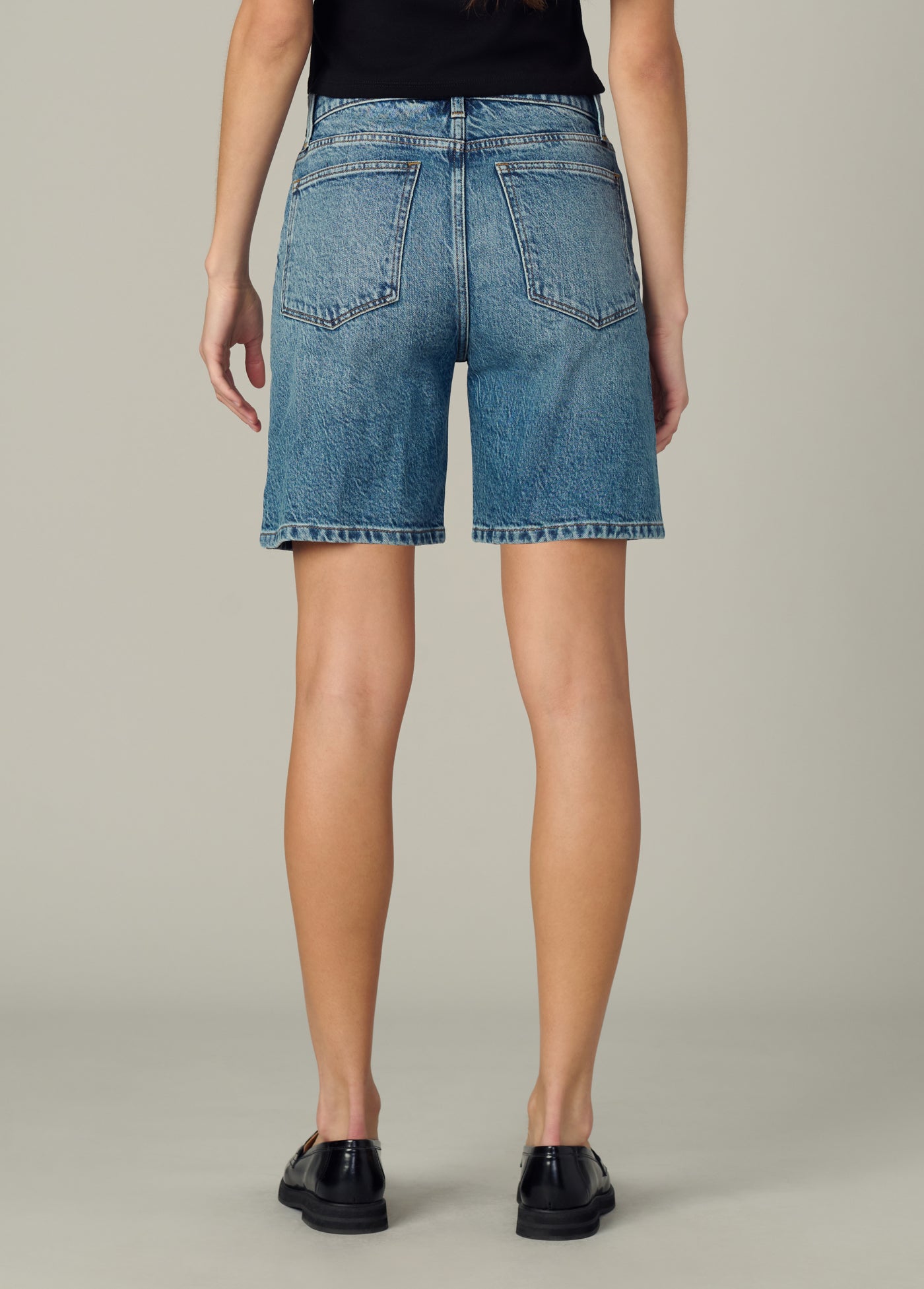 A high rise and relaxed short that sits at the waist with an easy hip and seat that falls to a relaxed leg.