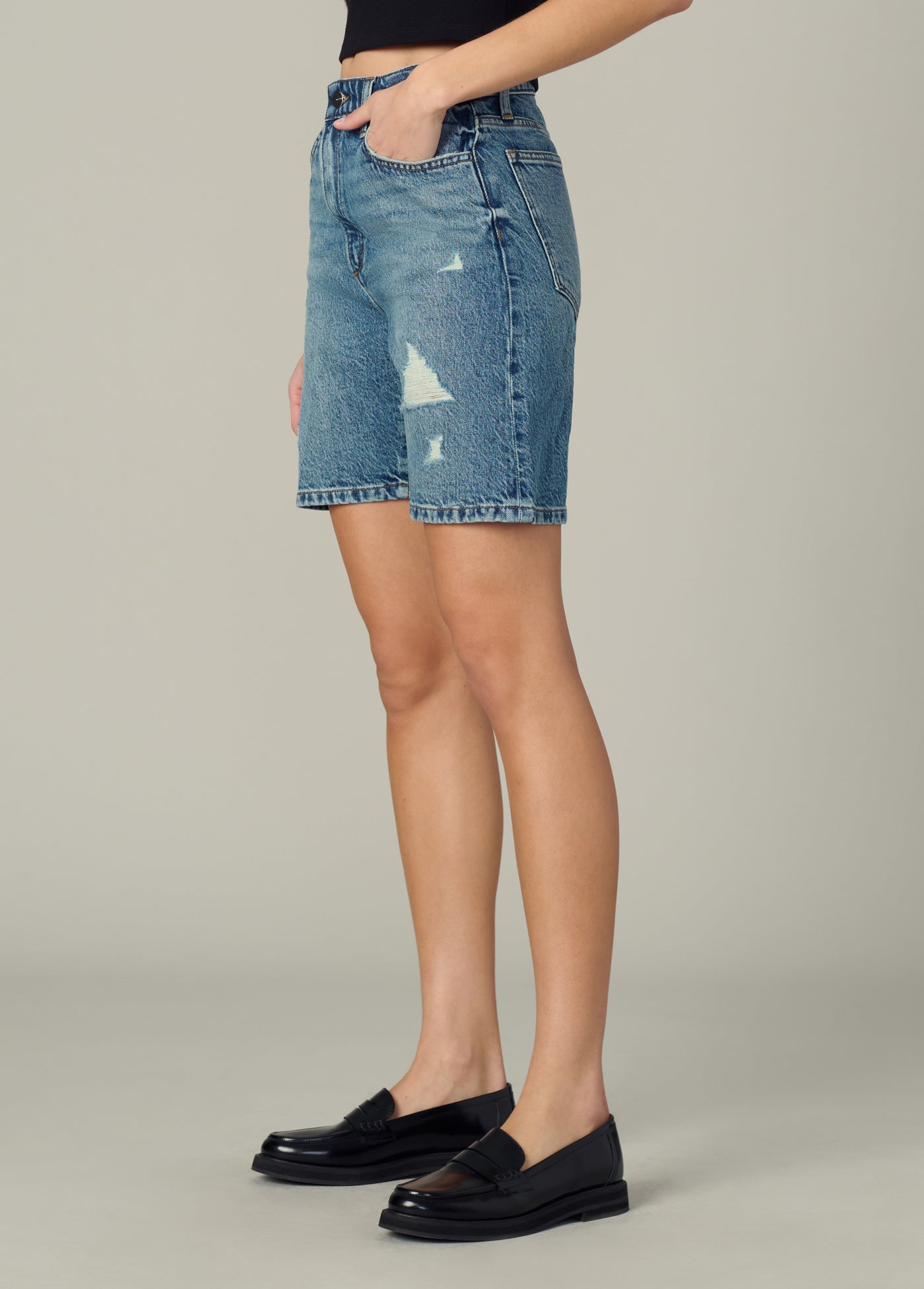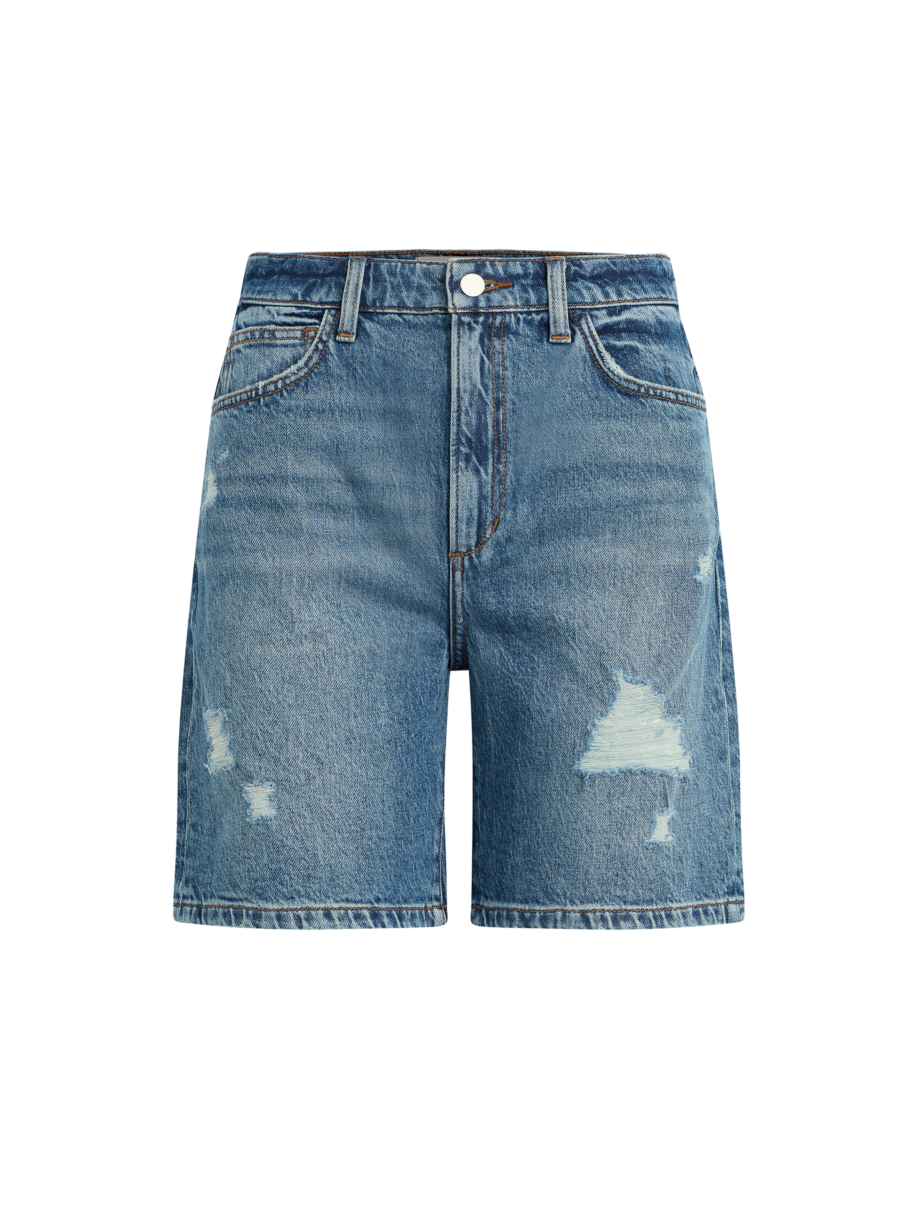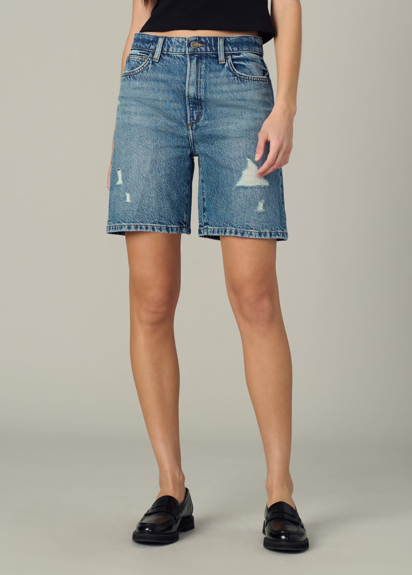 A high rise and relaxed short that sits at the waist with an easy hip and seat that falls to a relaxed leg.