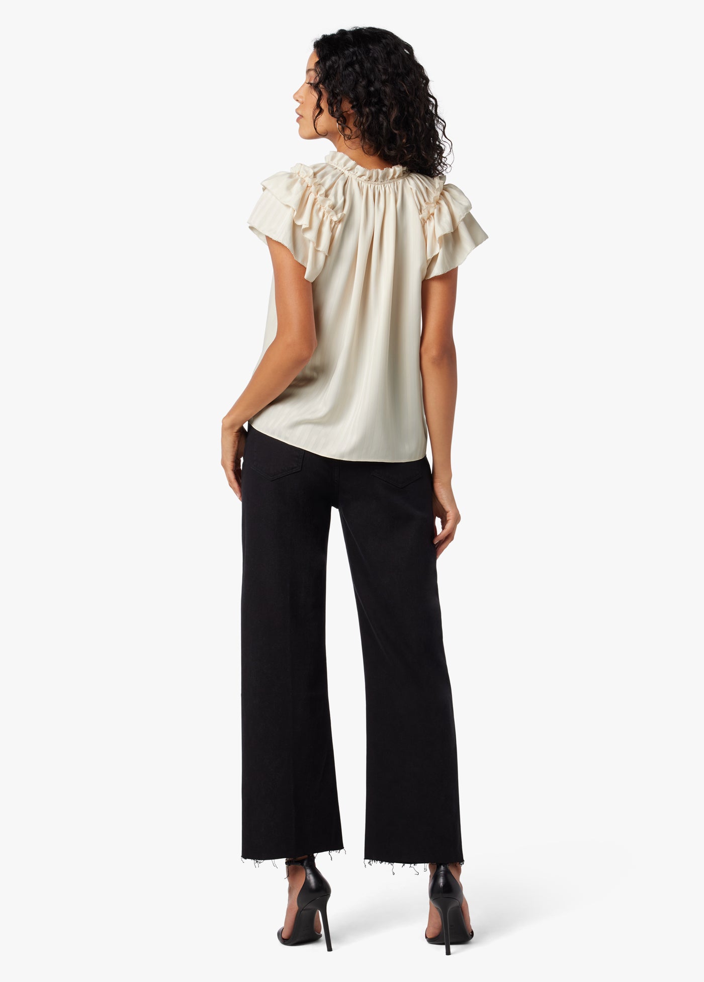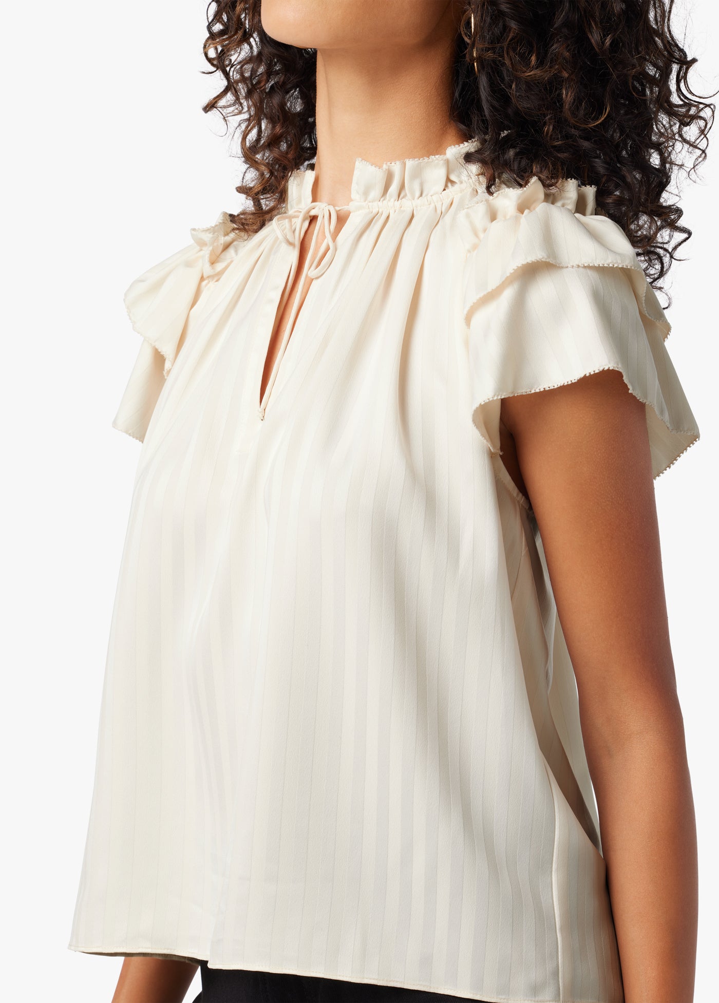 A bit of frill adds to the femininity of the Kara top. Ruffle sleeves, tie neckline and a modern, jacquard striped satin complete the look.