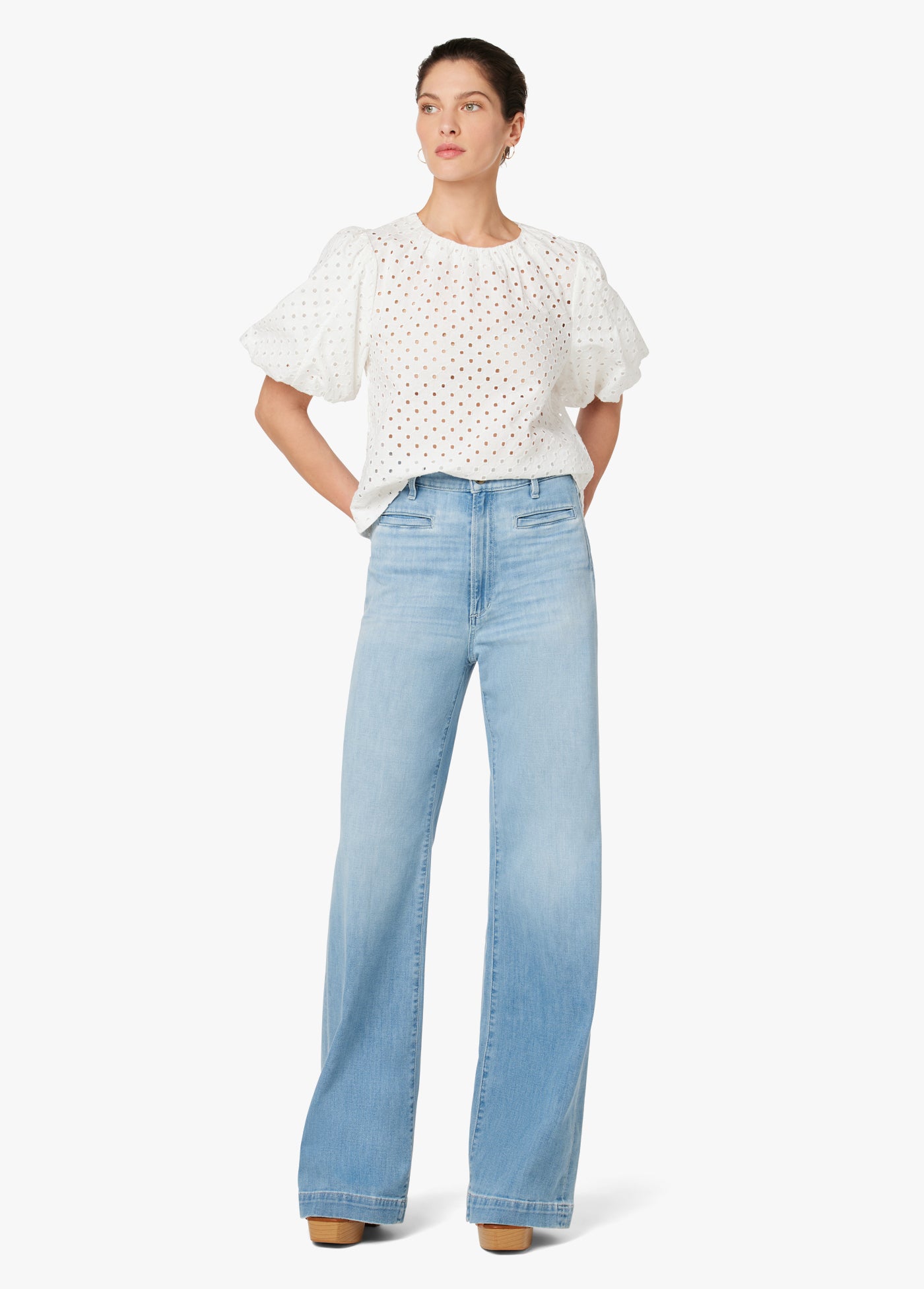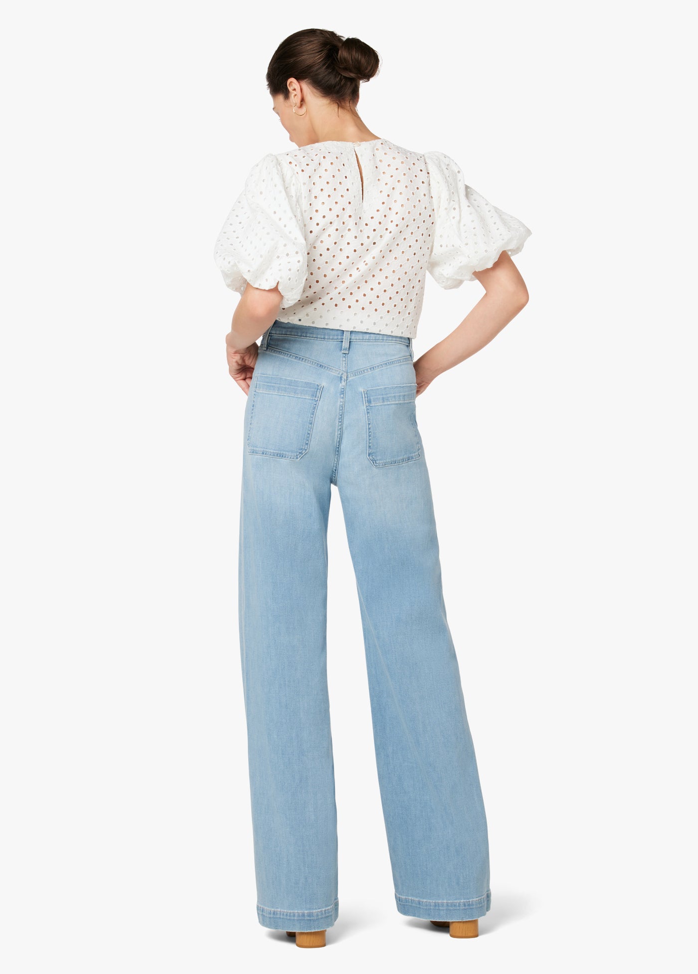 The new high-rise, wide-leg Kate jean in ‘Good Vibes' is a light shade of denim that is complete with top whiskering and hand sanding. Bringing attitude in the fit and wash, these jeans are the perfect addition to any denim drawer.