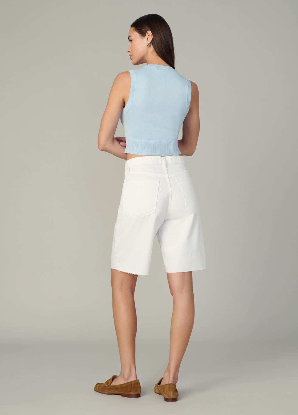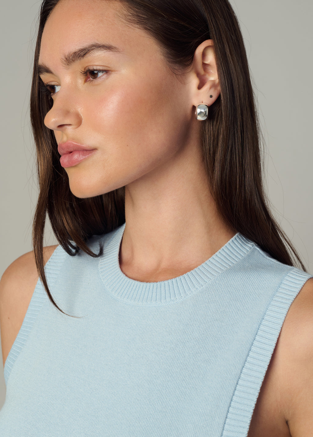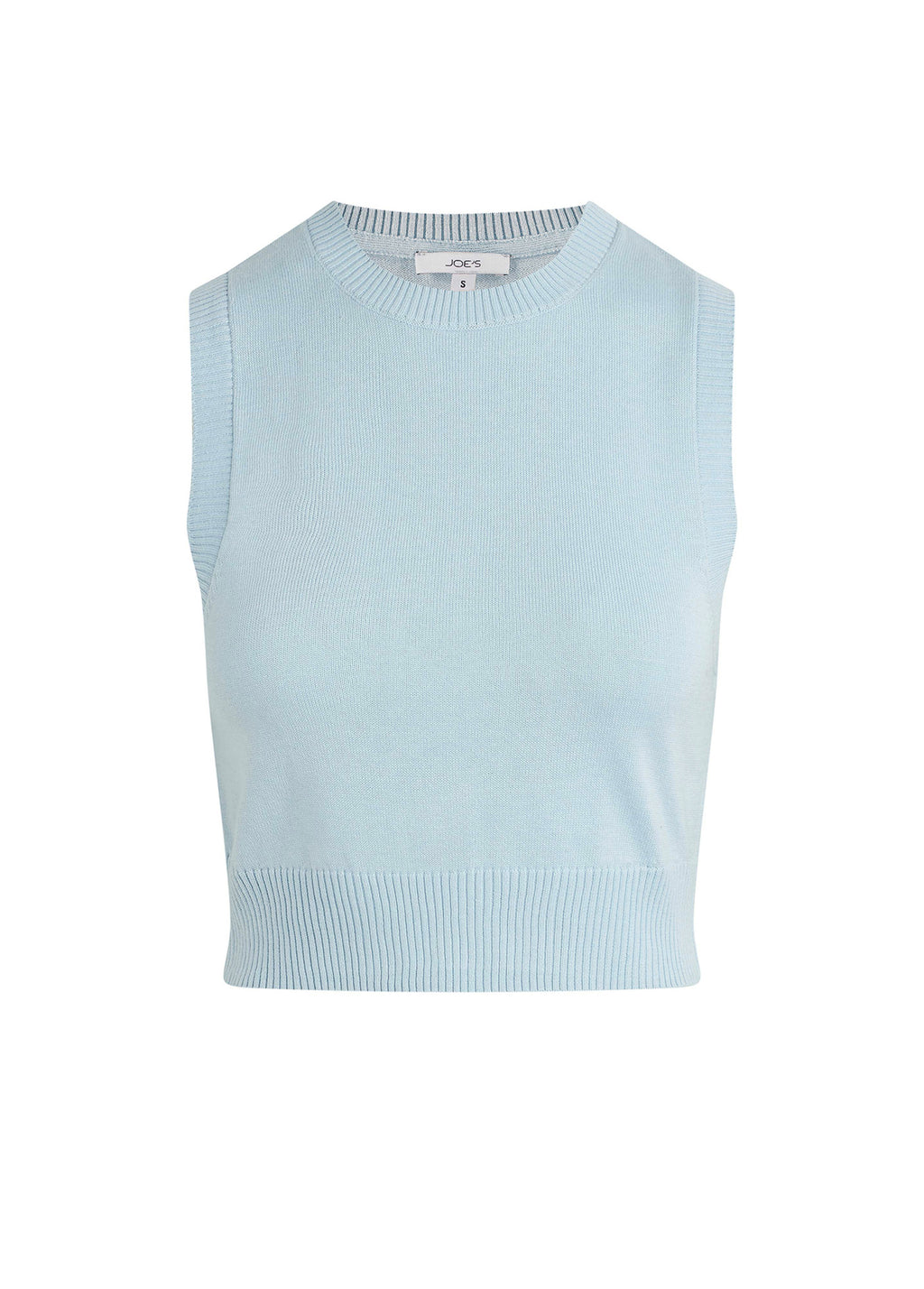 A crewneck, sleeveless vest with a shrunken fit. Pair it with the Dani Cotton Cardigan.