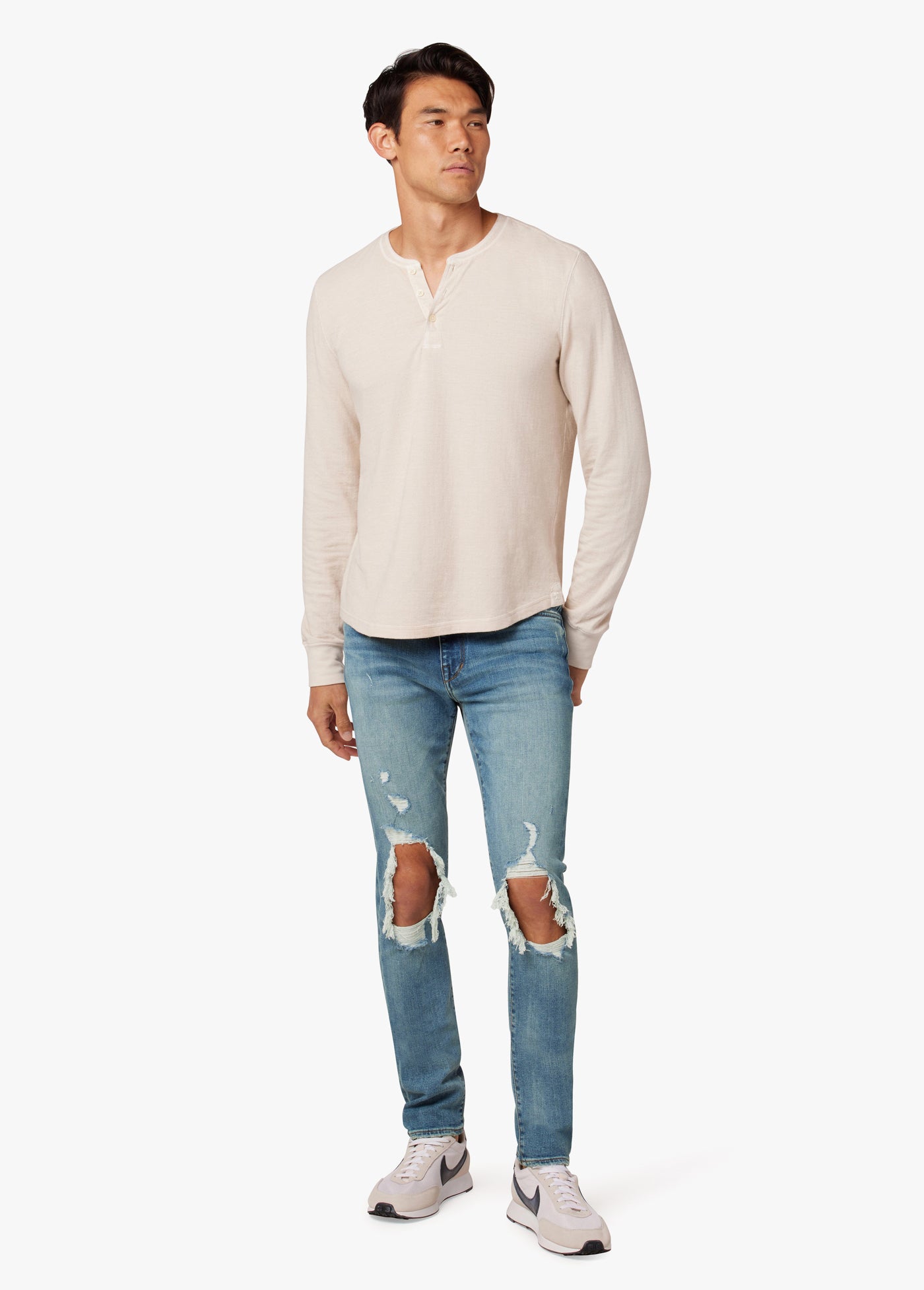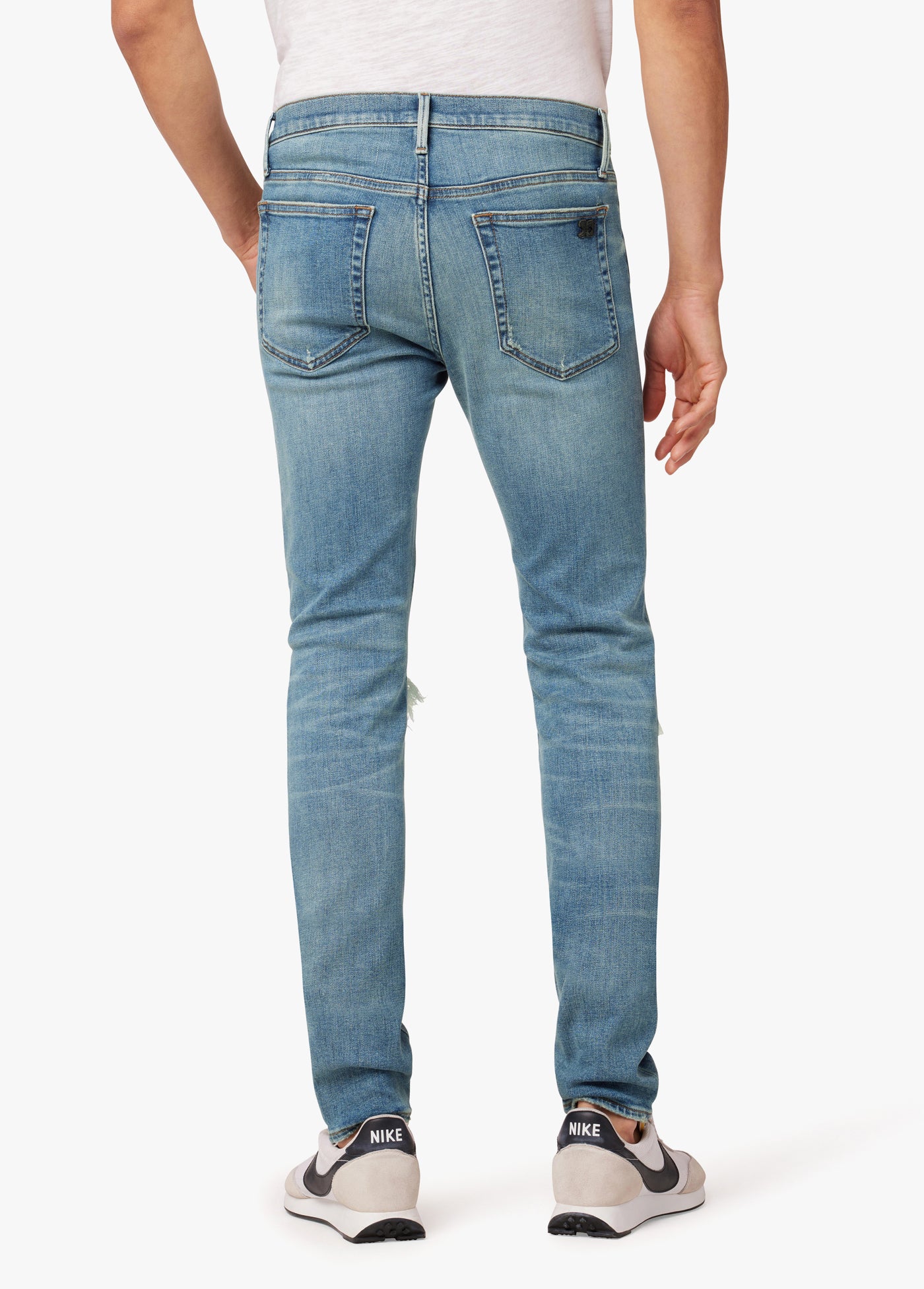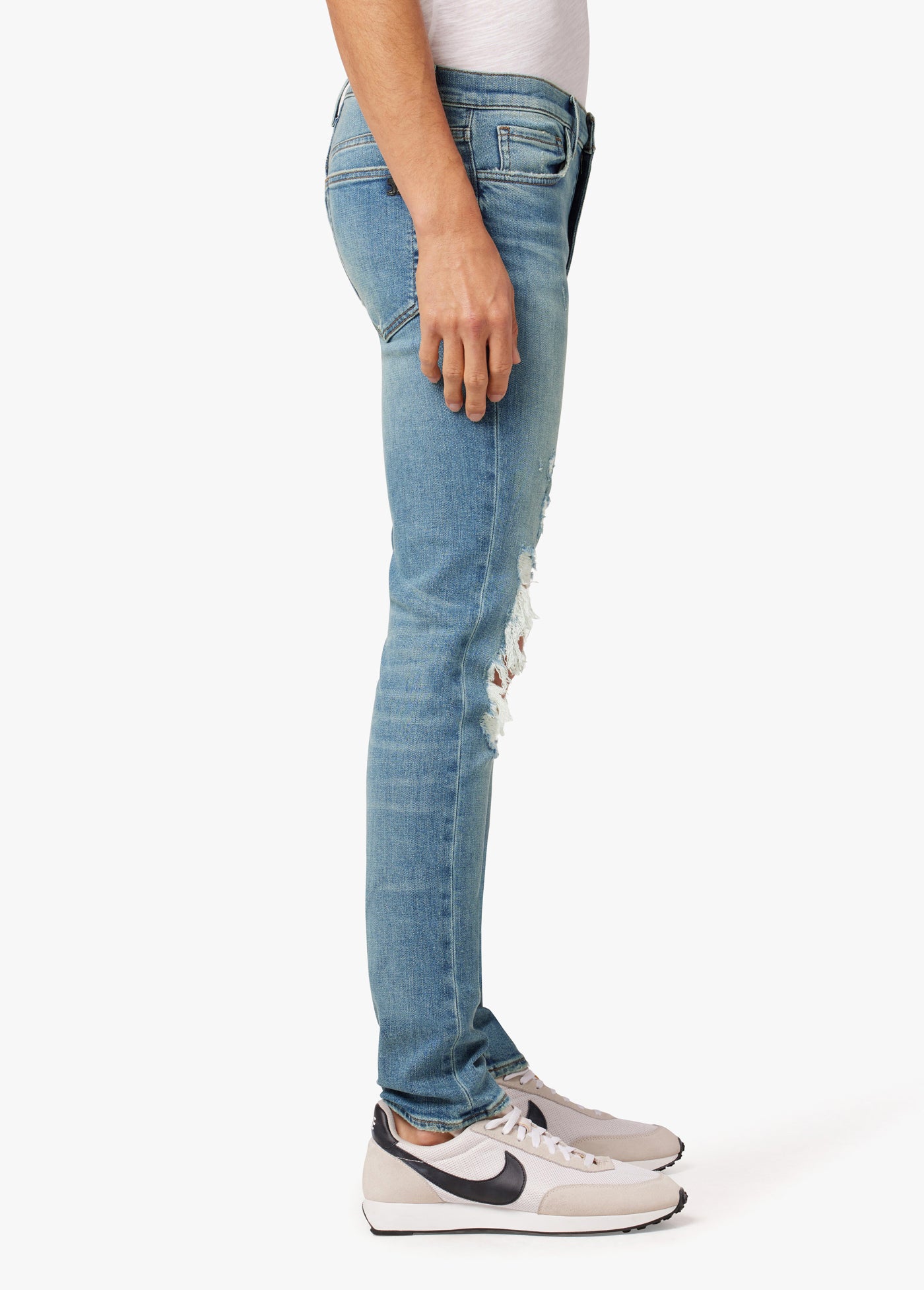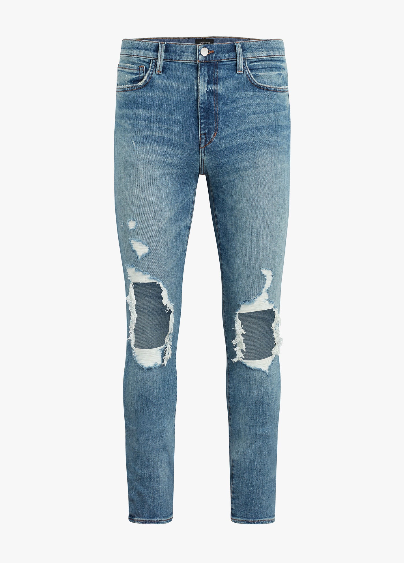 Our skinniest fit, the Legend in Heath is a medium, bright blue wash that's been hand sanded and blended with stretch for a comfortable feel. Aggressive knee holes give this pair an authentic wear.