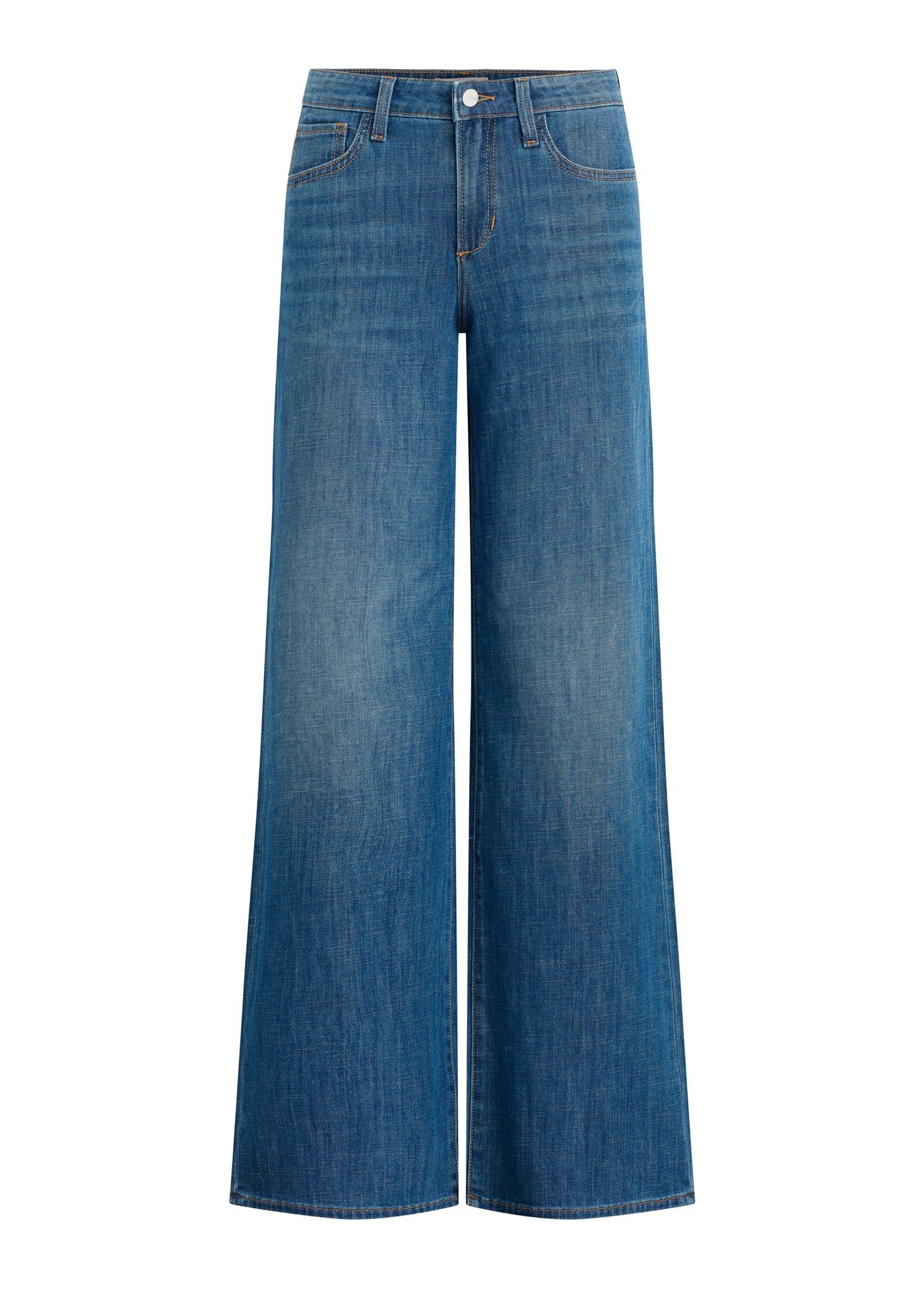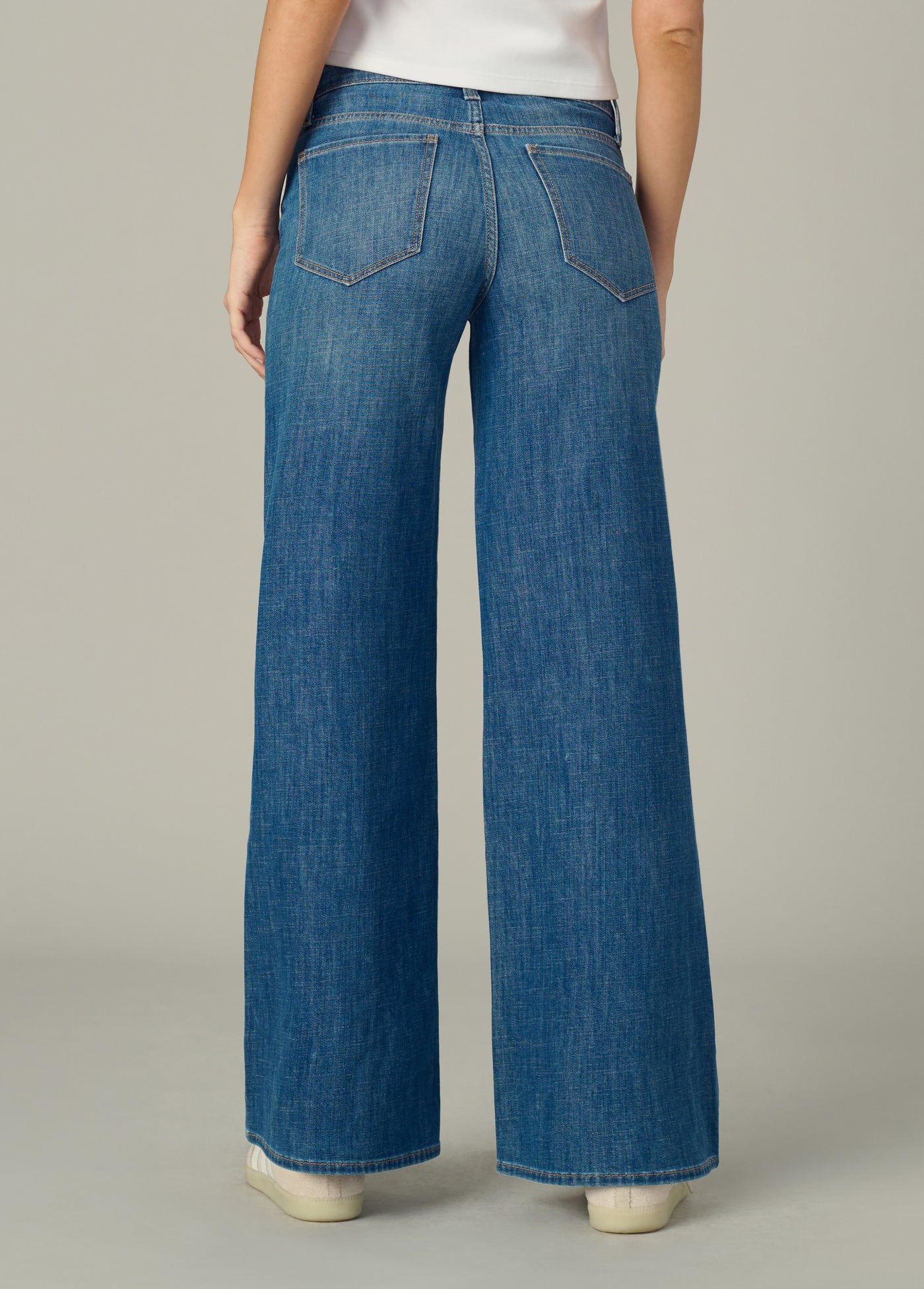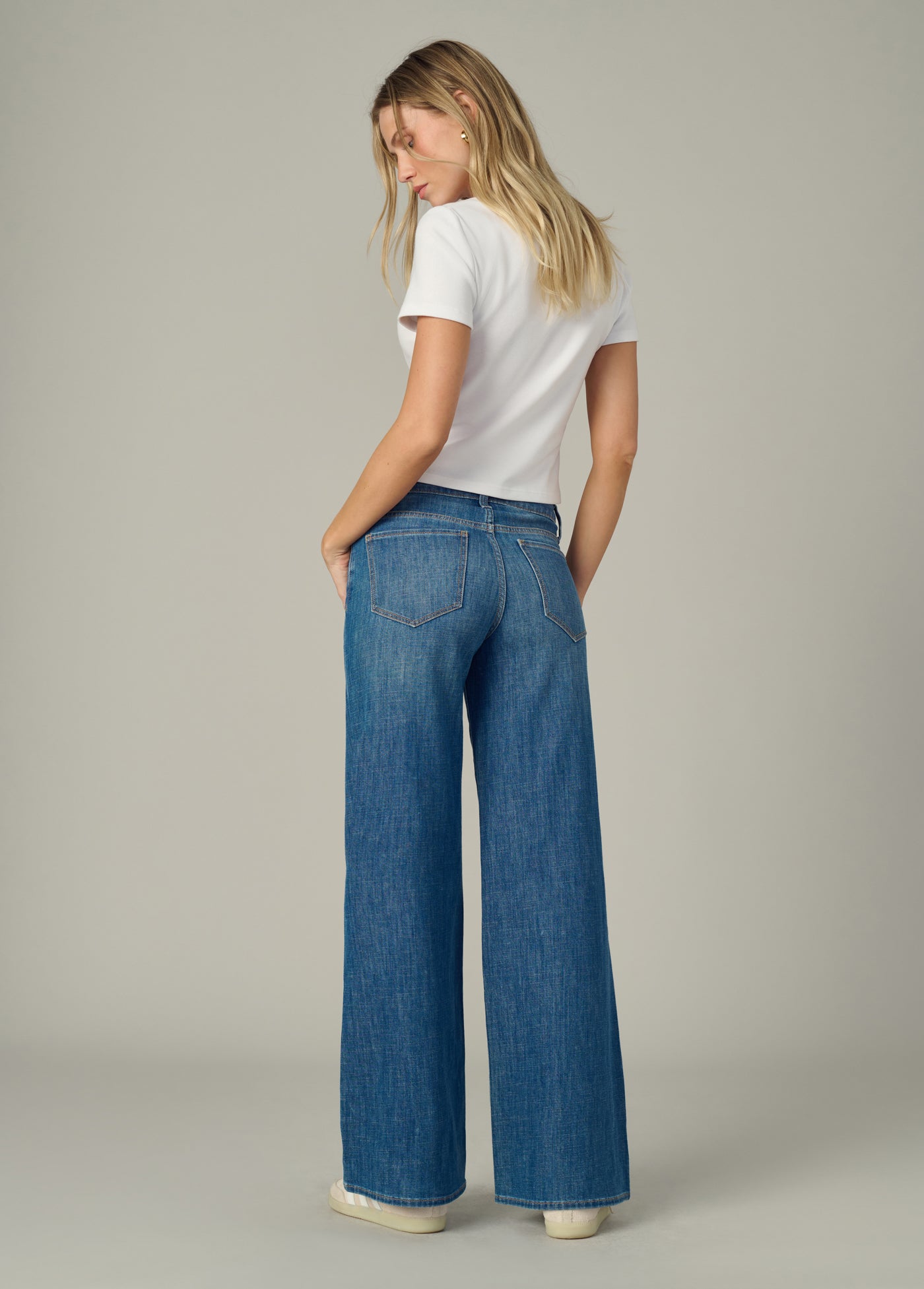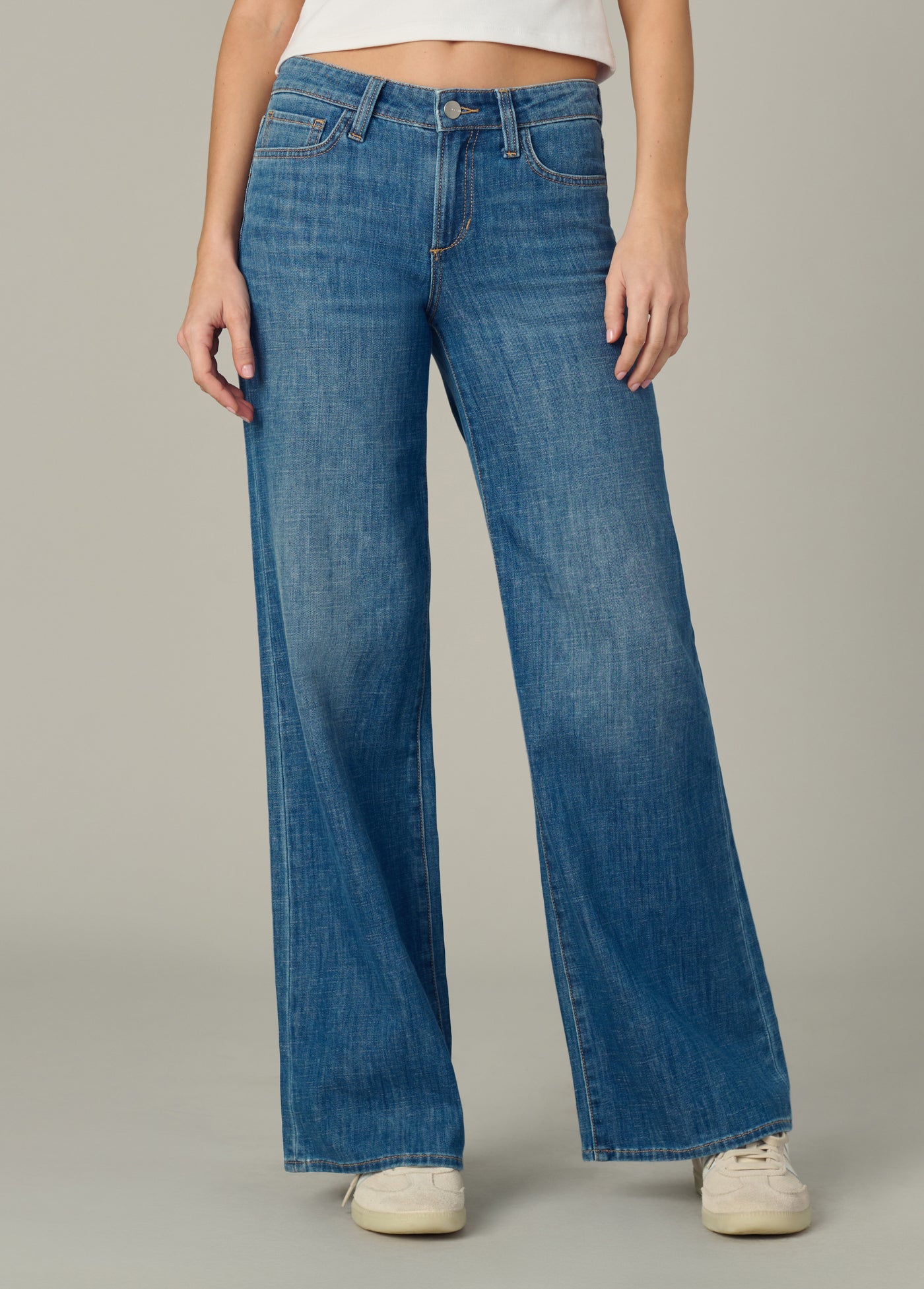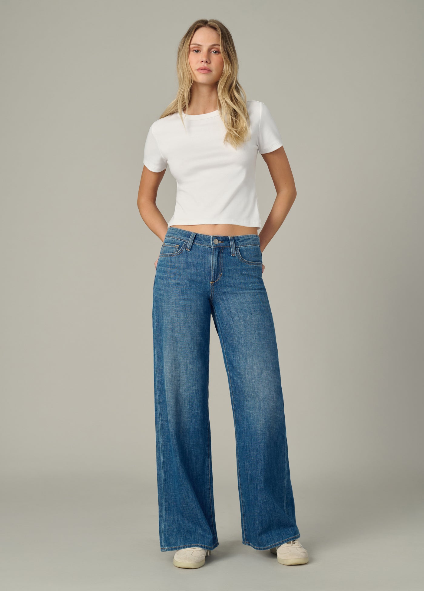 A low rise and relaxed fit through the waist and hip that rests below the natural waist and has a wide leg.