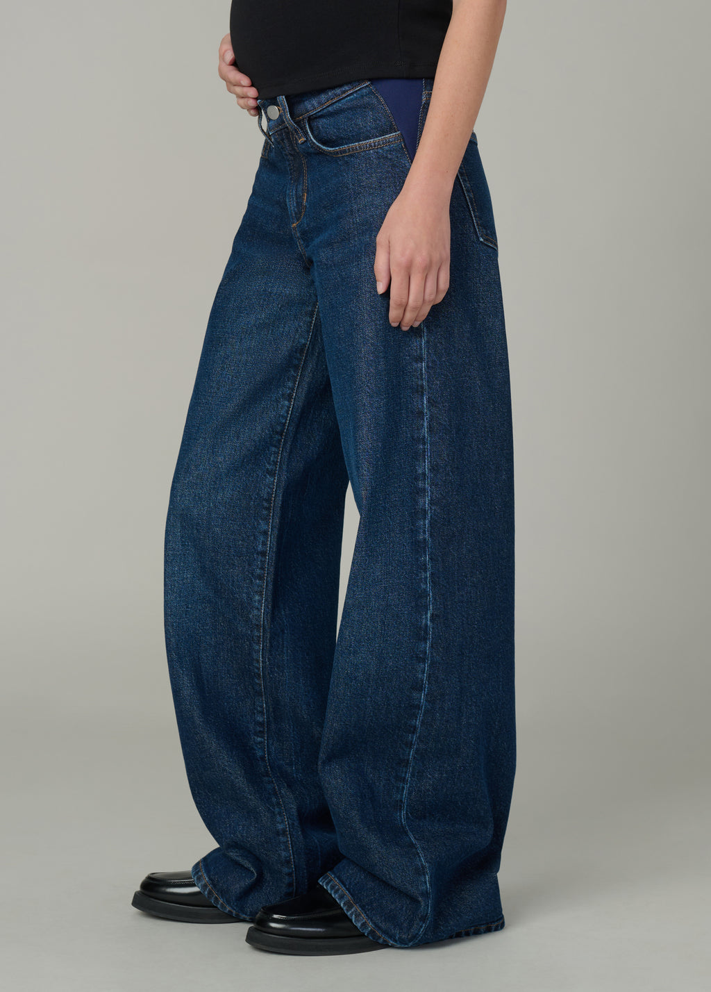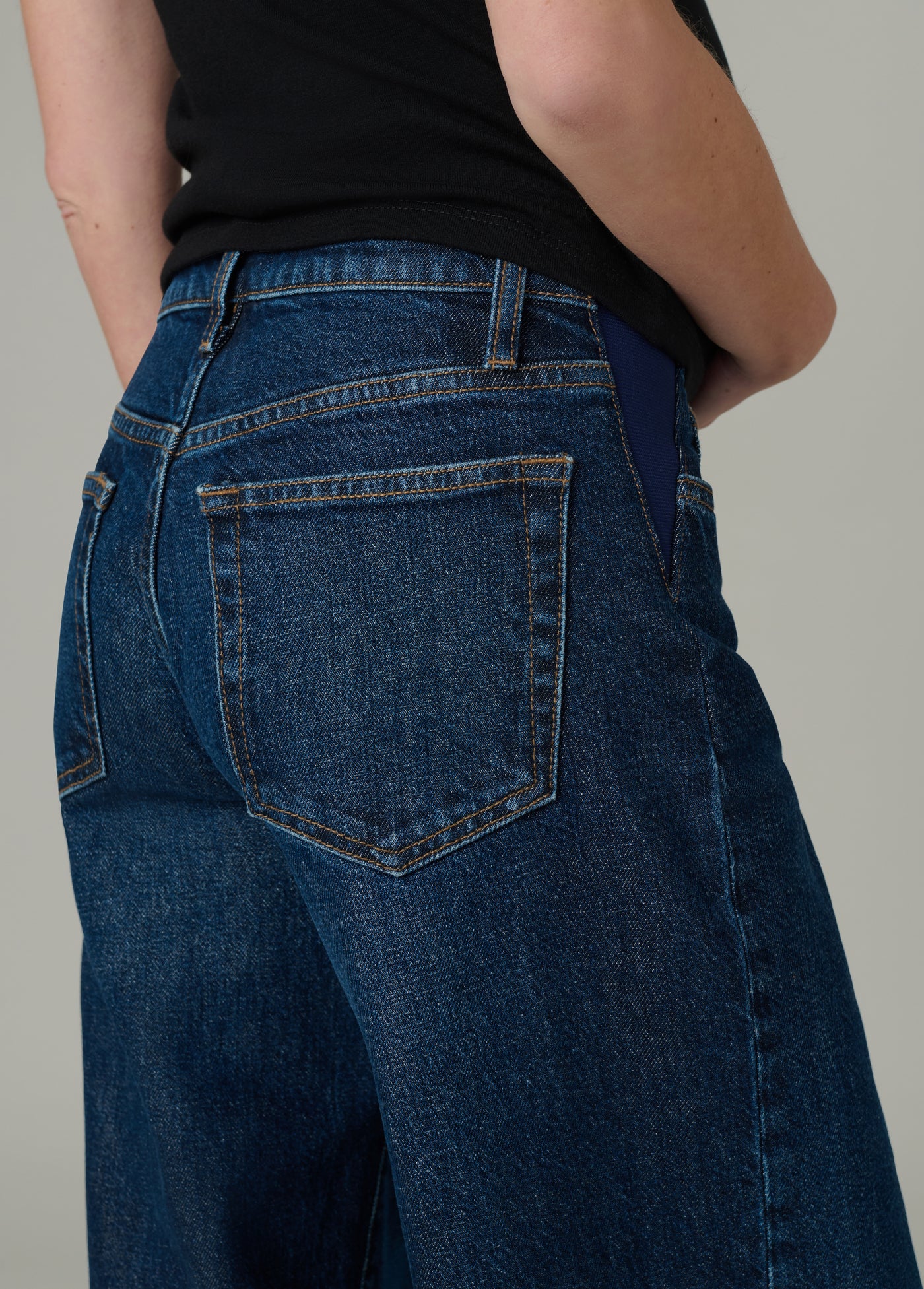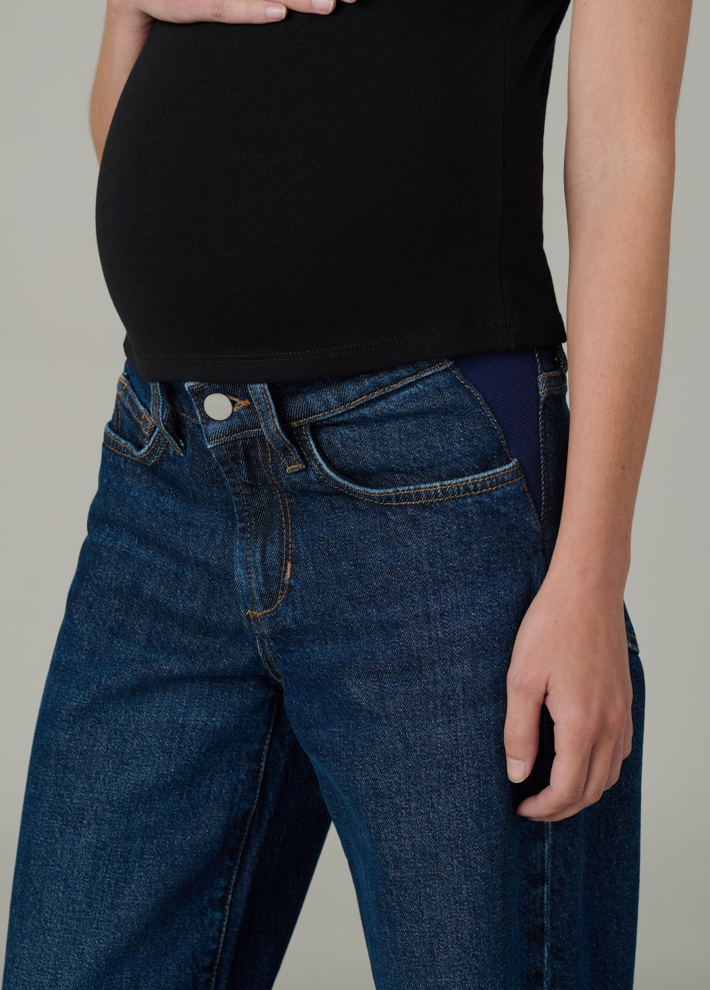 A low rise and relaxed fit through the waist and hip with inset maternity panels and a wide leg that hits at the ankle.