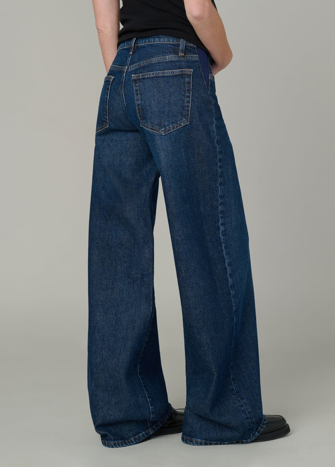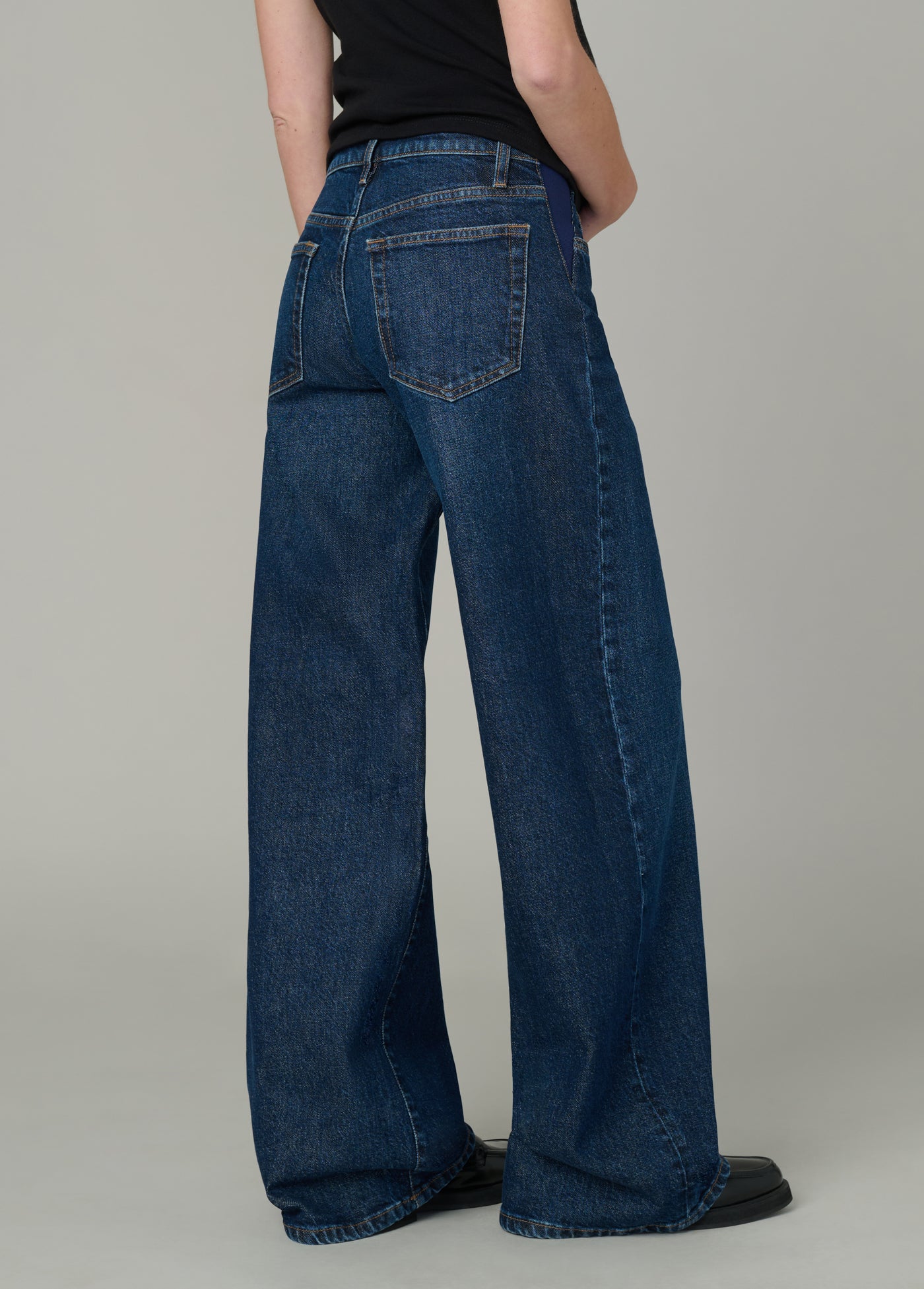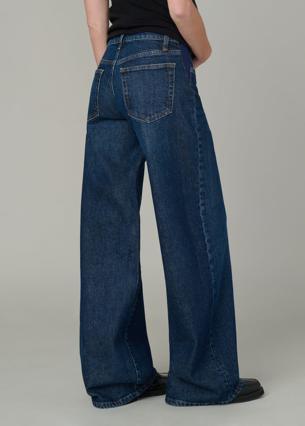 A low rise and relaxed fit through the waist and hip with inset maternity panels and a wide leg that hits at the ankle.
