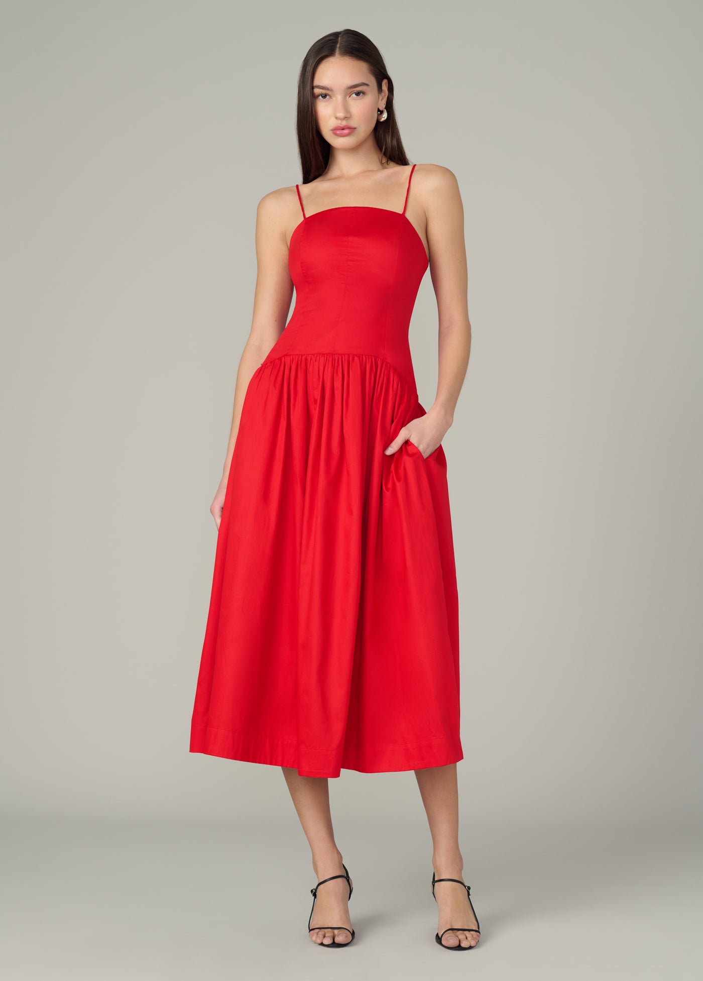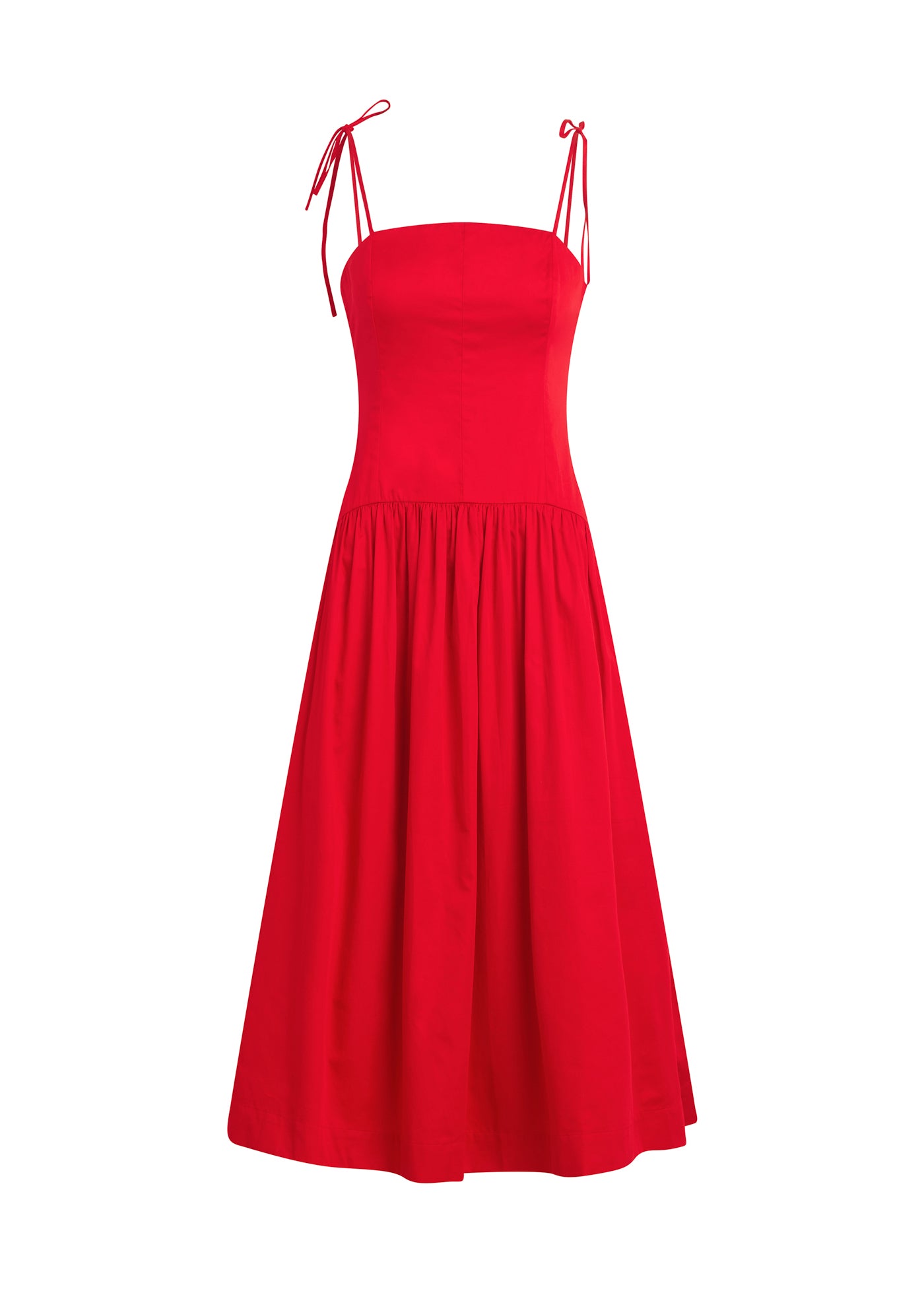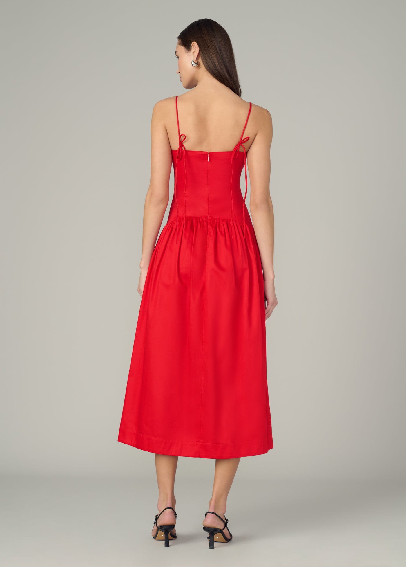 A maxi dress with a seamed bodice, subtle dropped waist and adjustable tie straps.