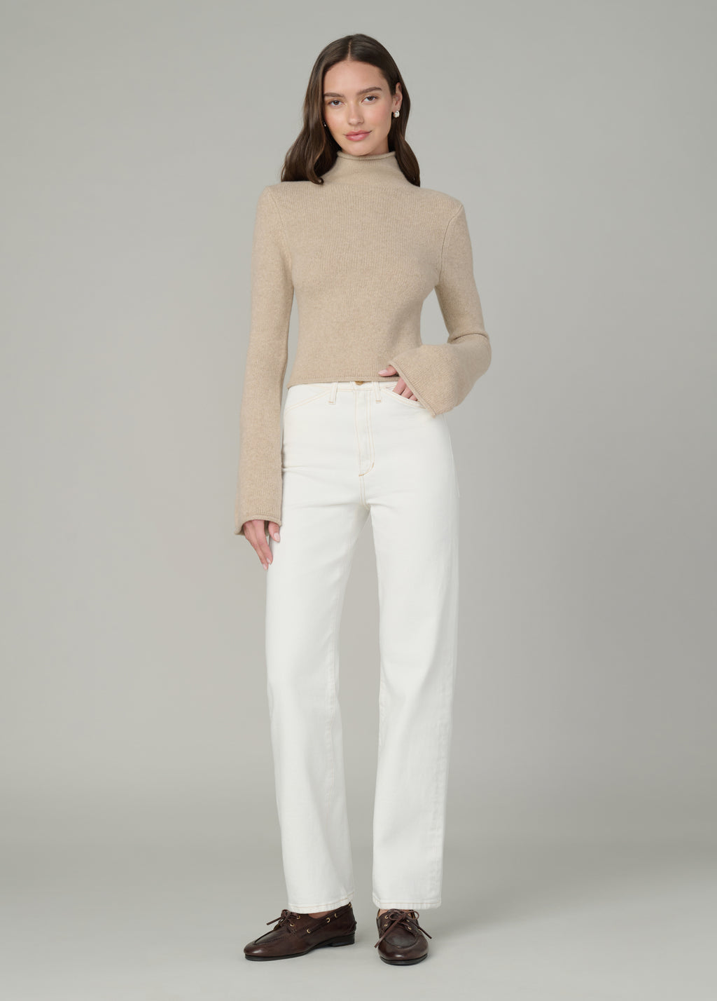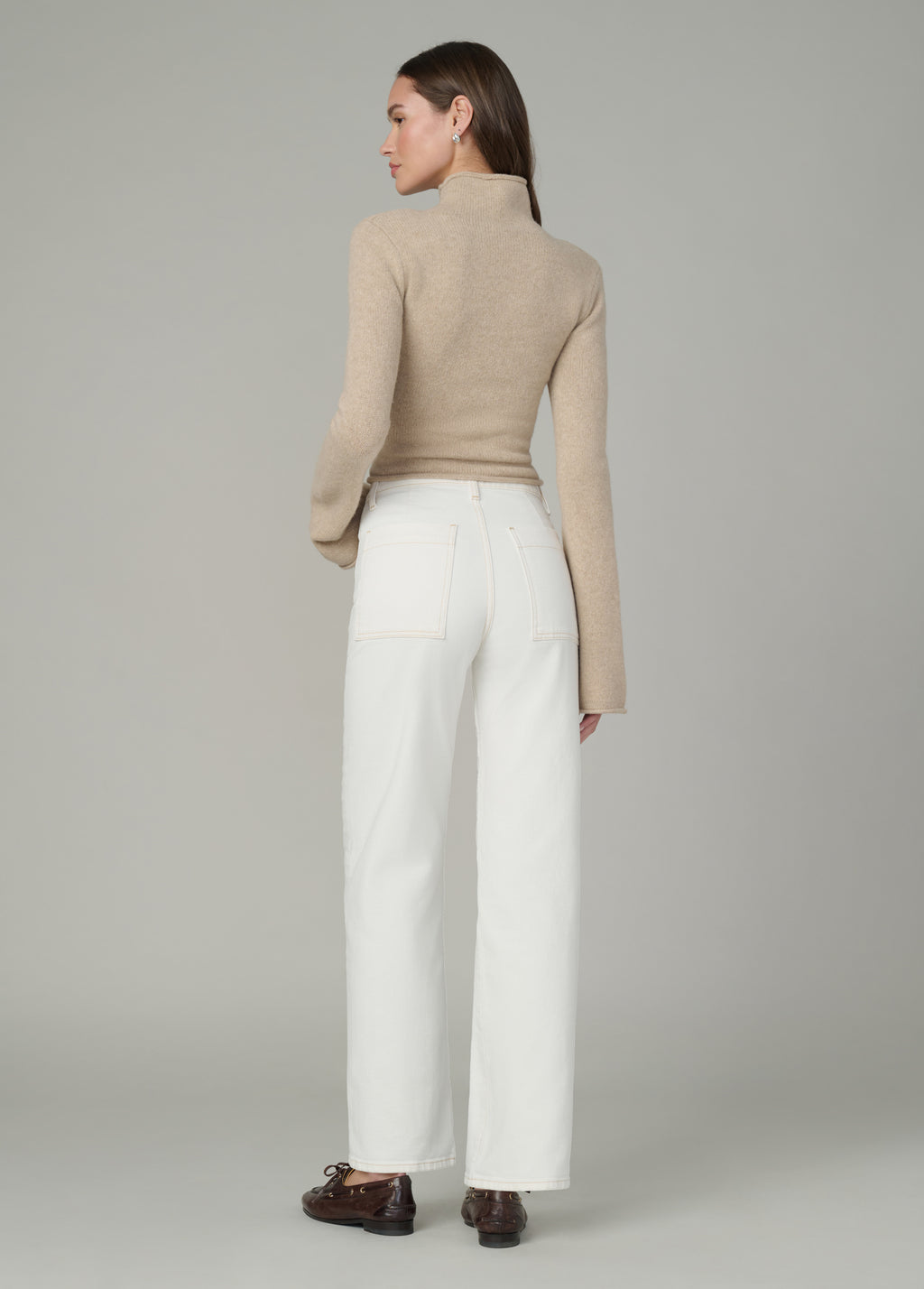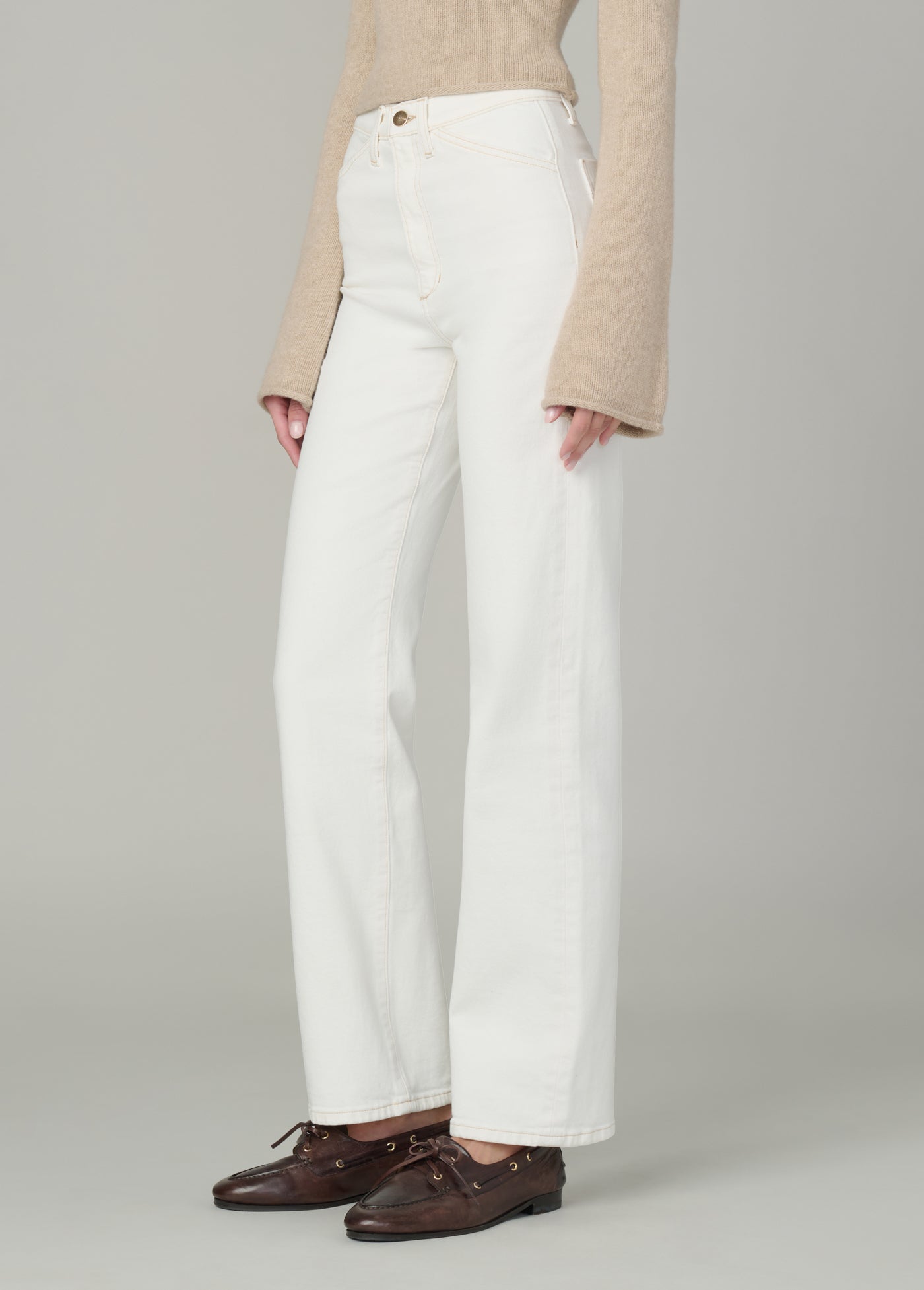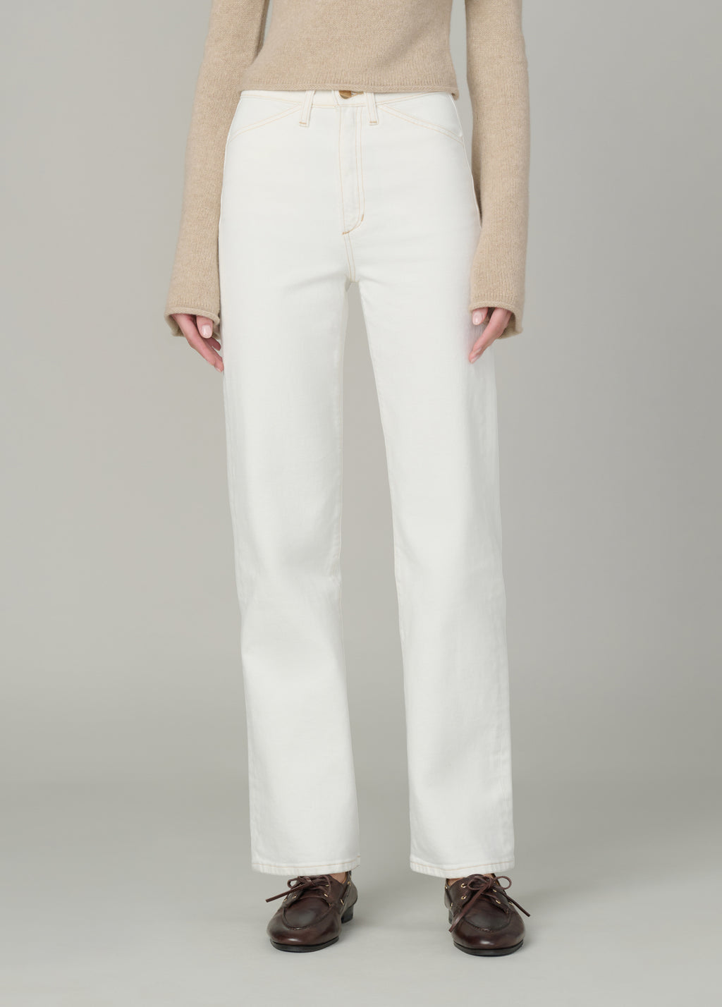 A high rise and slim fit through the waist and hip with a full-length straight leg and tailored details.