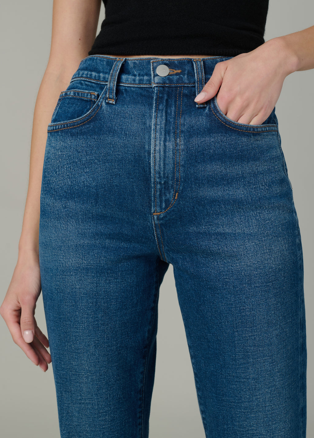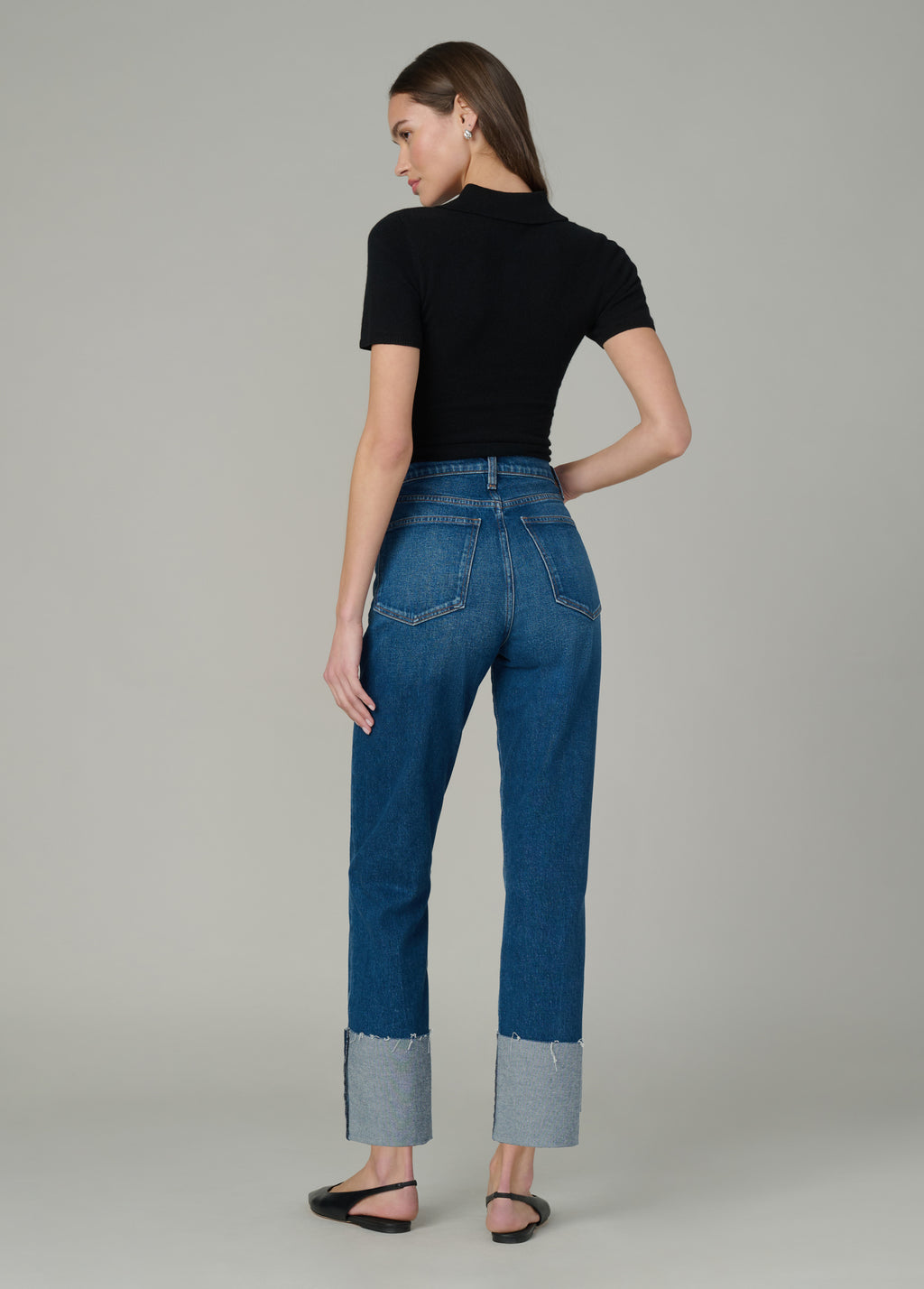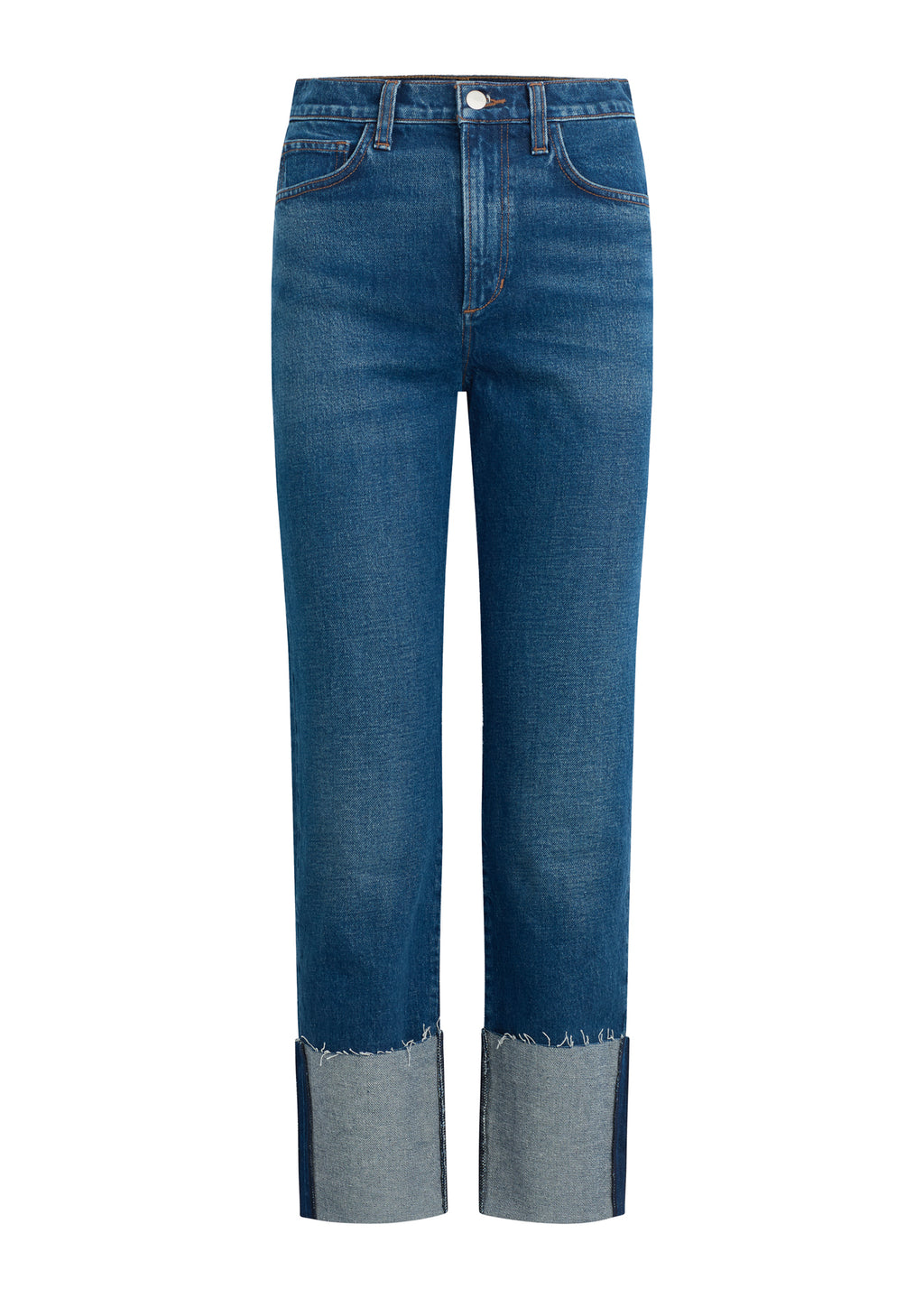 A high rise and slim fit through the waist and hip with a tapered straight leg that hits at the ankle with a wide cuff.