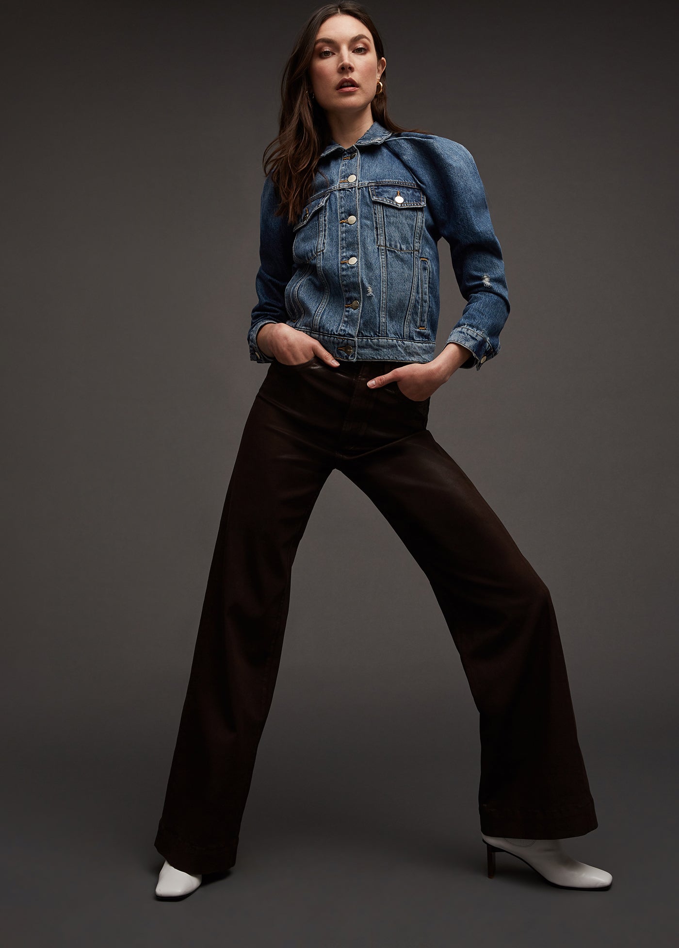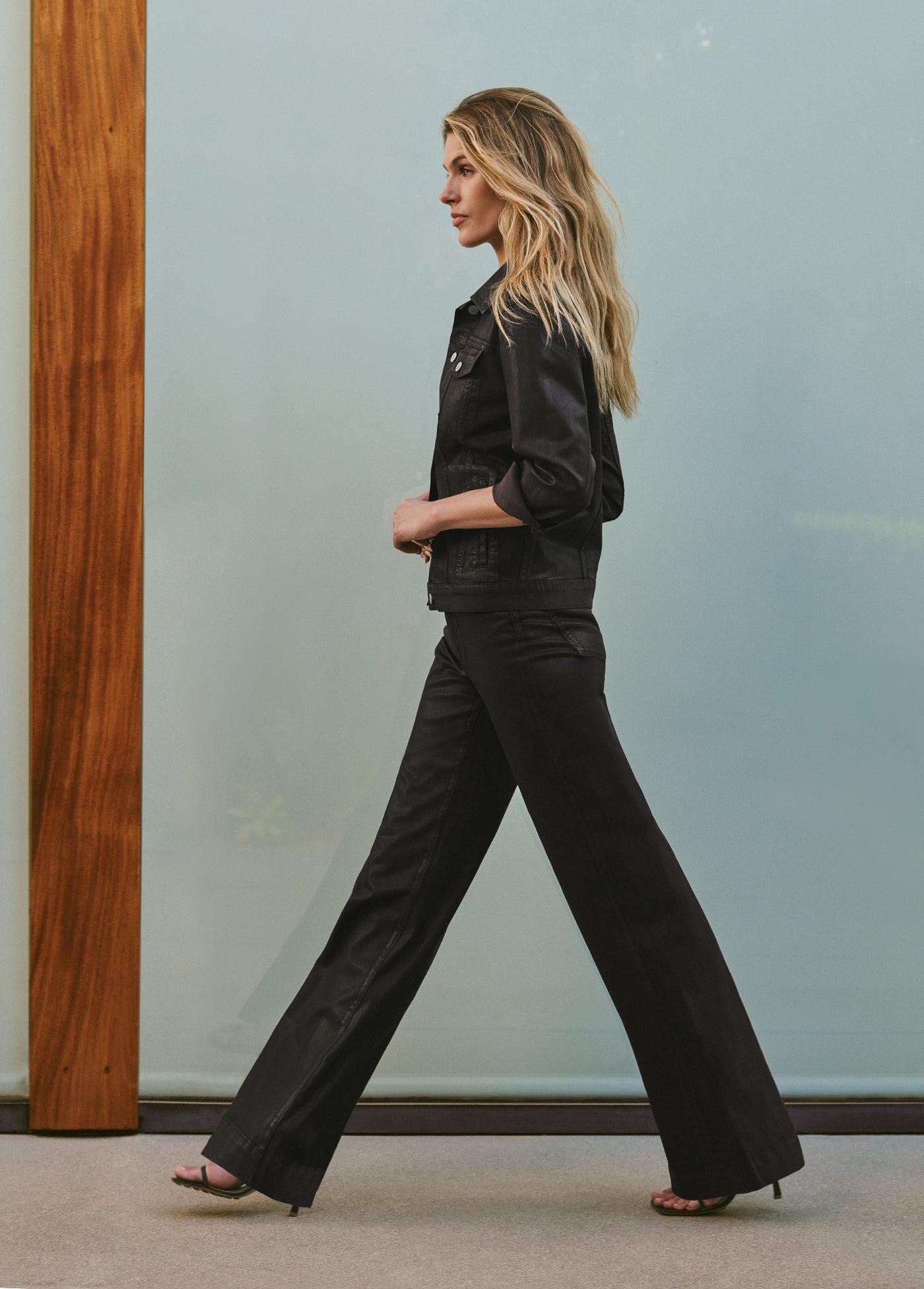 The high-rise, wide-leg Mia jean has the comfort and ease of stretch. The denim has been overdyed to true black and coated to give these showstoppers some subtle sheen.