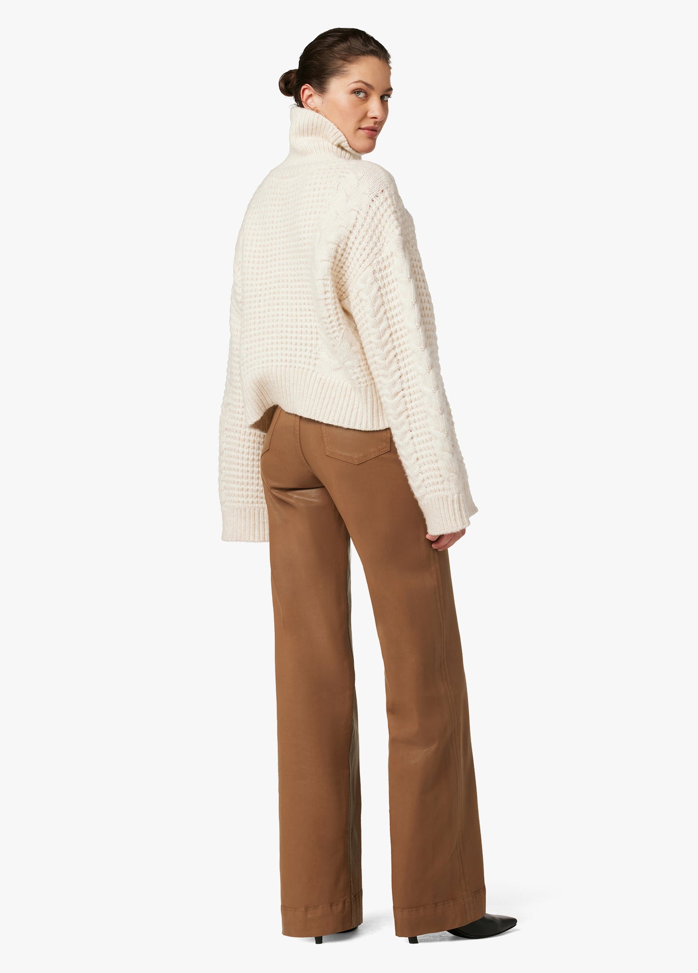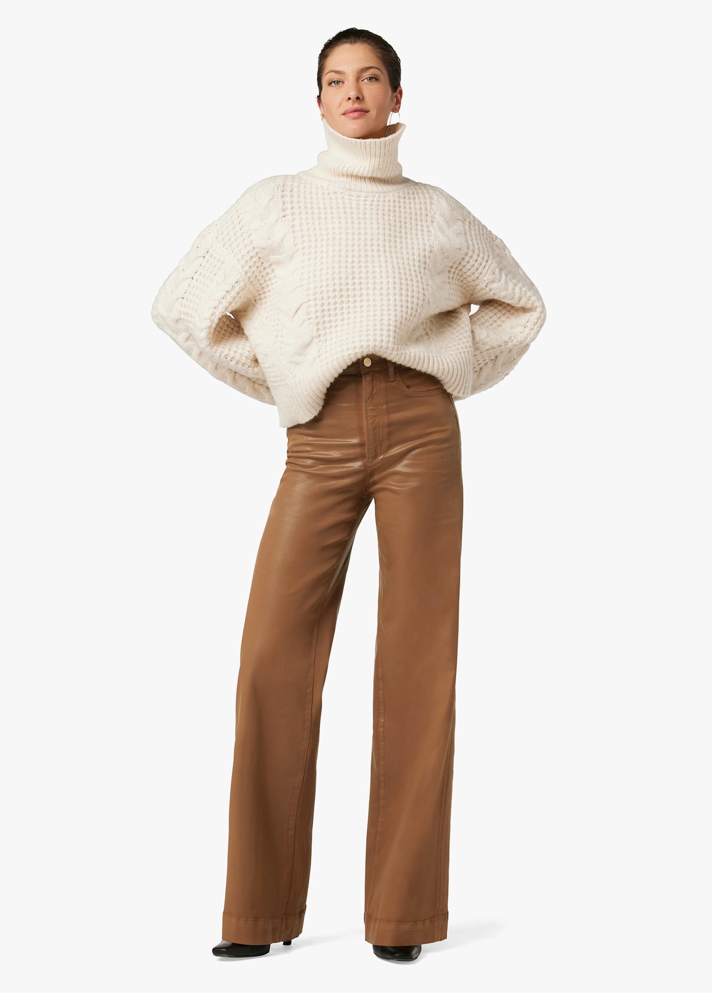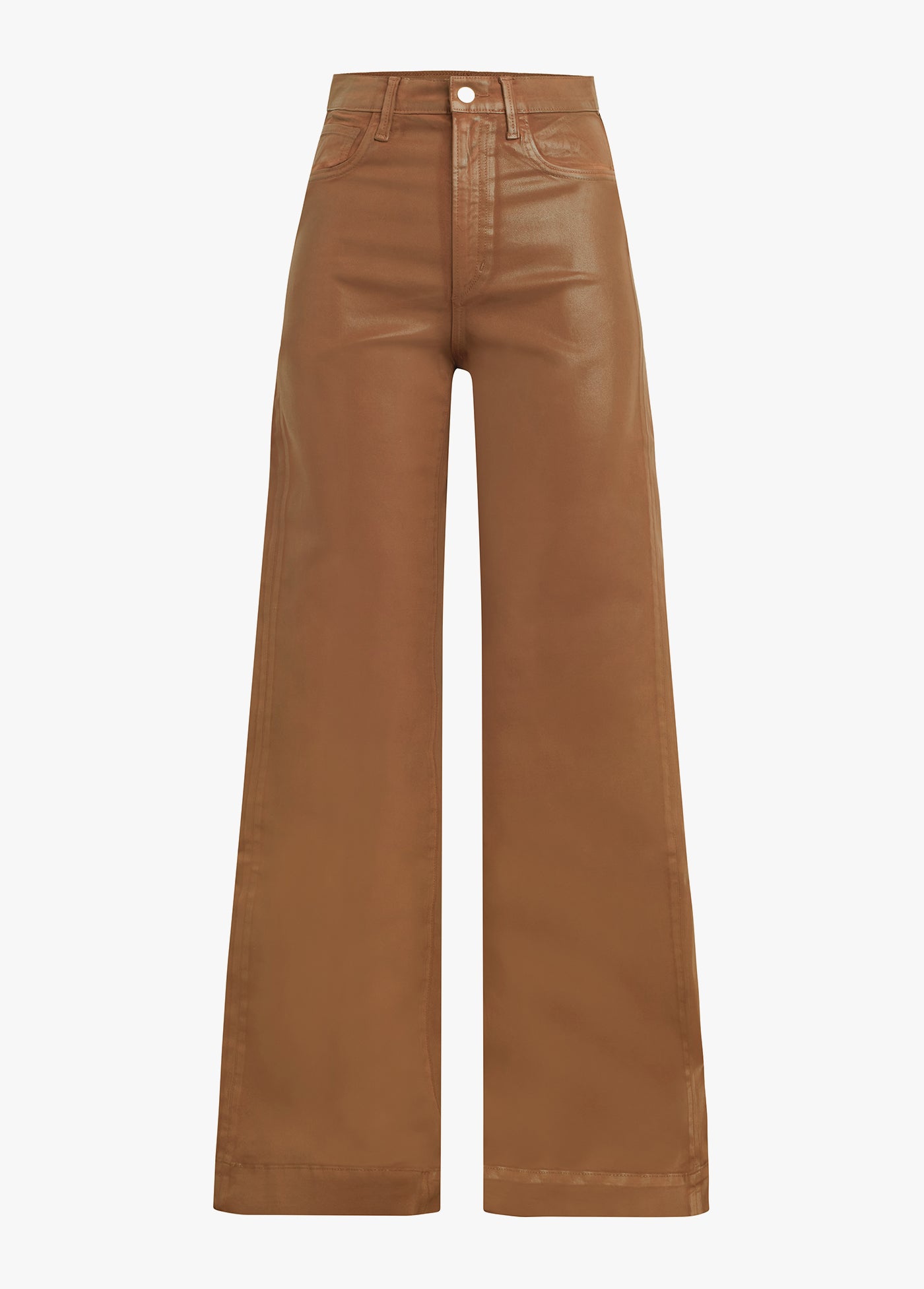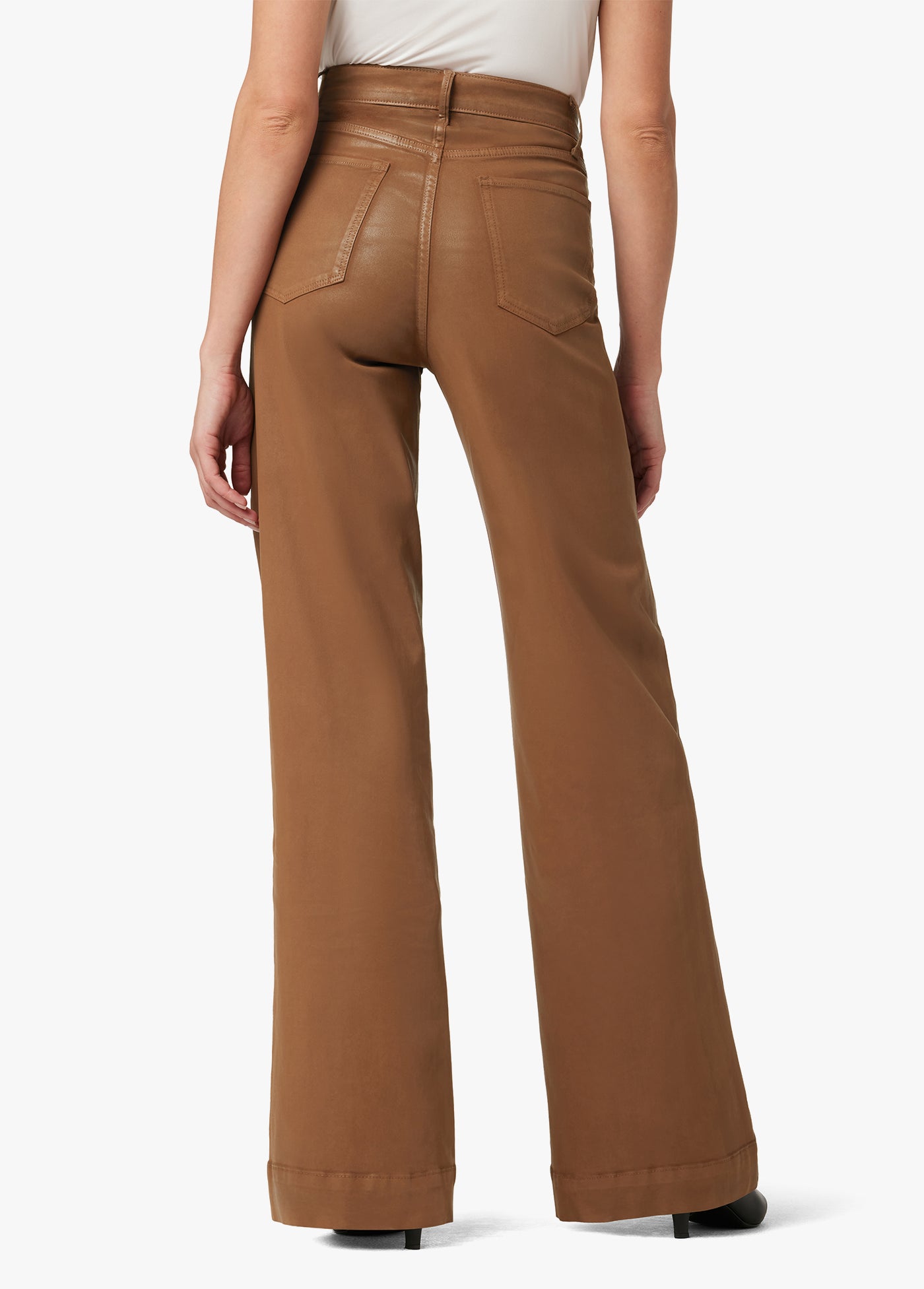 The high-rise, wide leg Mia Coated jean has the comfort and ease of stretch. The coated Leather Brown denim has a subtle sheen for an elevated look.